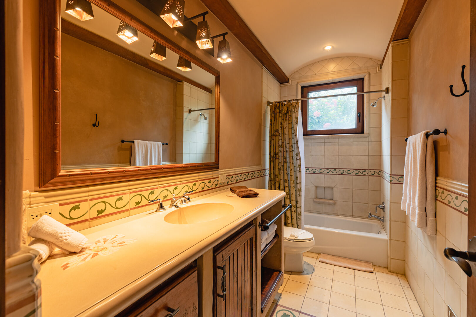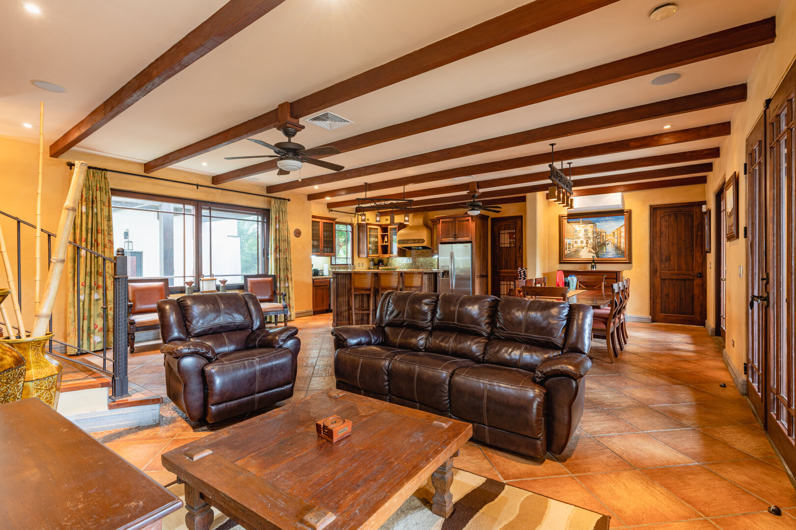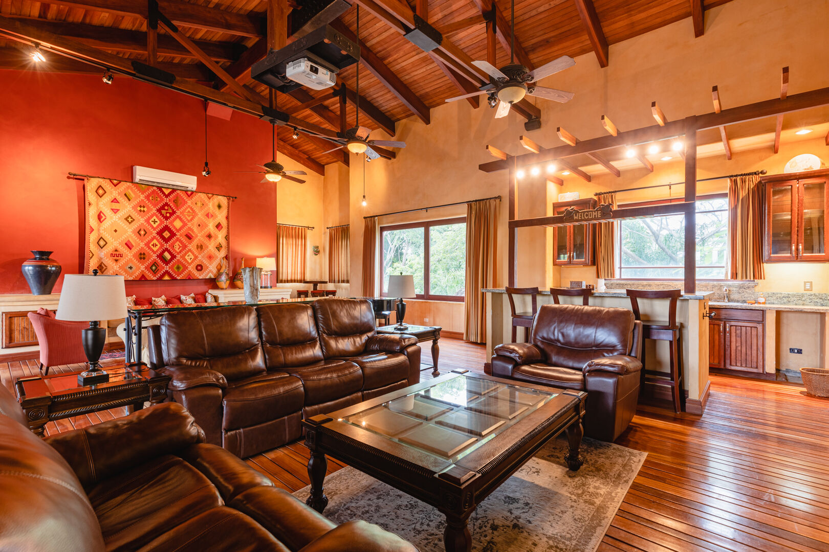 Upstairs, a dramatic entertainment room features a vaulted hardwood ceiling, wine bar, home theater, and lounge. Handcrafted doors lead to a covered balcony with hammocks. The upper master suite includes high ceilings, a private terrace, a spacious bath with dual showers, and a walk-in closet. Two additional guest suites share a bathroom, completing this thoughtfully designed and beautifully executed home.