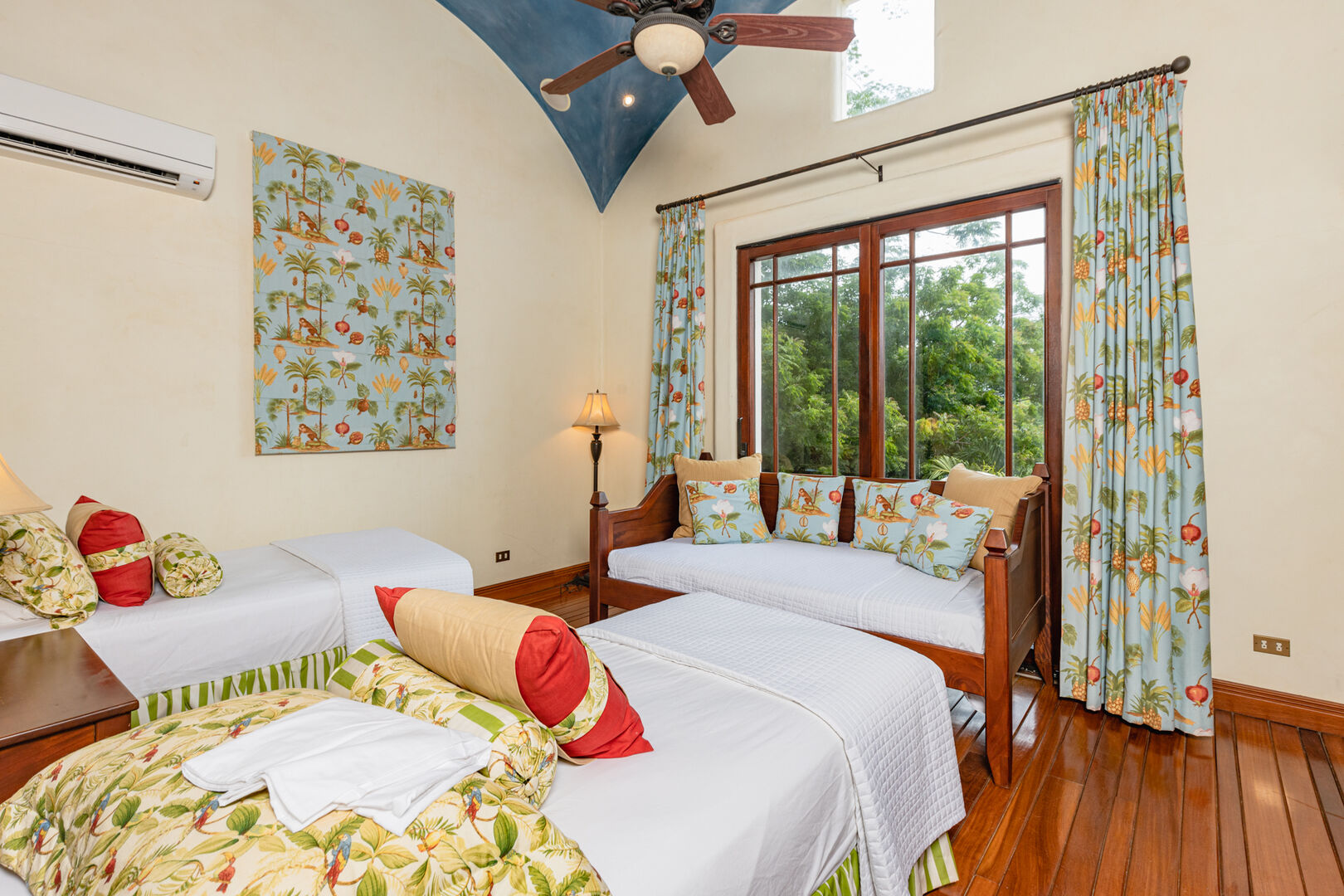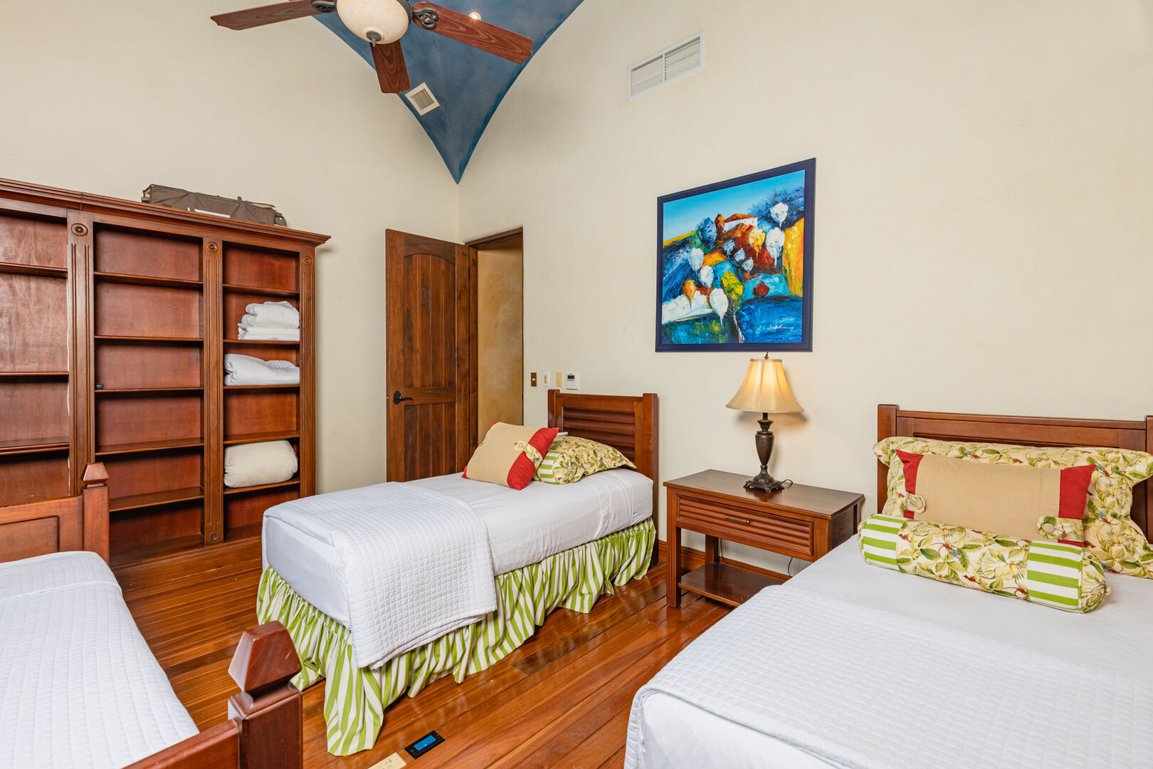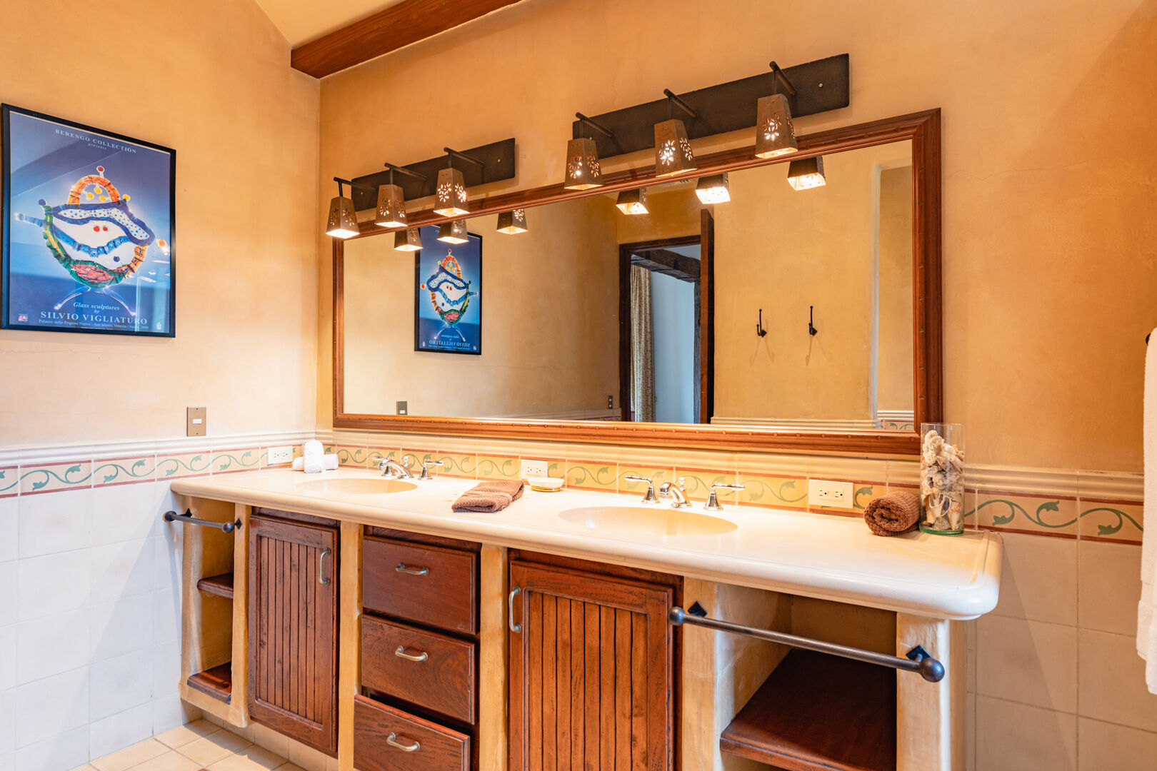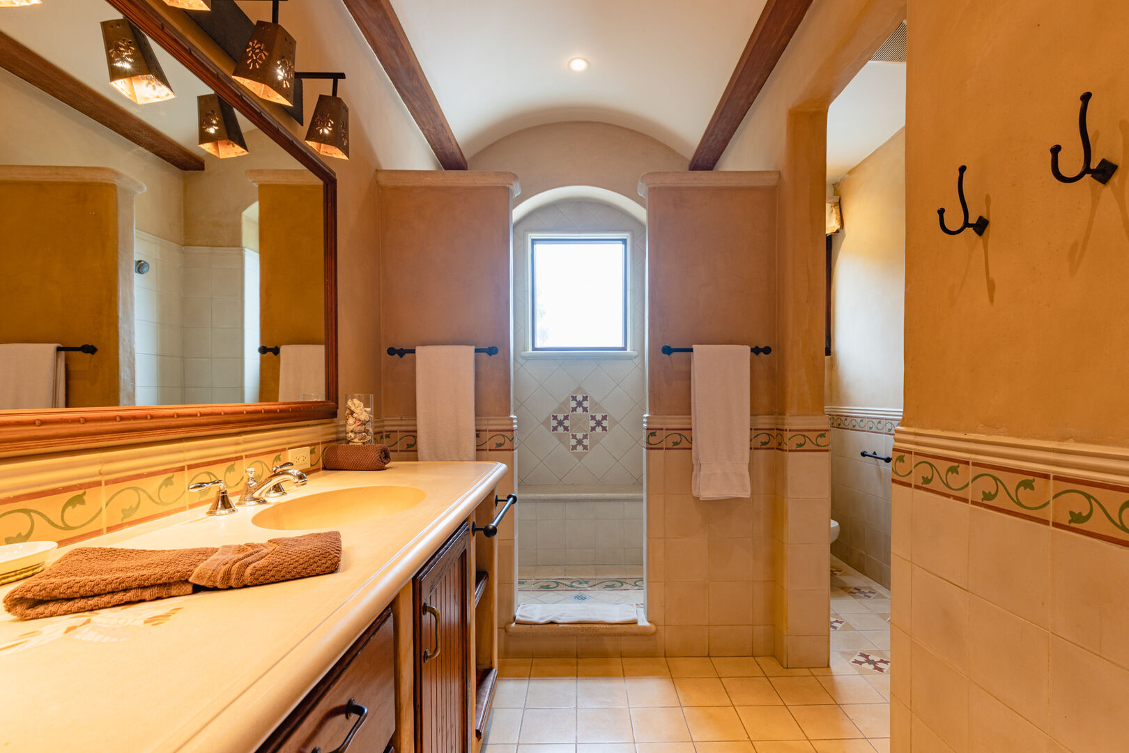 Upstairs, a dramatic entertainment room features a vaulted hardwood ceiling, wine bar, home theater, and lounge. Handcrafted doors lead to a covered balcony with hammocks. The upper master suite includes high ceilings, a private terrace, a spacious bath with dual showers, and a walk-in closet. Two additional guest suites share a bathroom, completing this thoughtfully designed and beautifully executed home.
