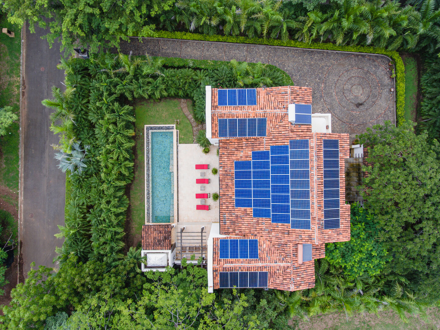 Set on a beautifully landscaped 2,014 m² (½ acre) lot, the home features mature trees, lush gardens, and a slate and antique brick driveway. At its heart is a salt-filtered infinity-edge pool, seamlessly connected to a large terrace and covered pavilion with a bathroom, shower, and grill—ideal for outdoor entertaining. A spacious garage and carport provide ample storage.