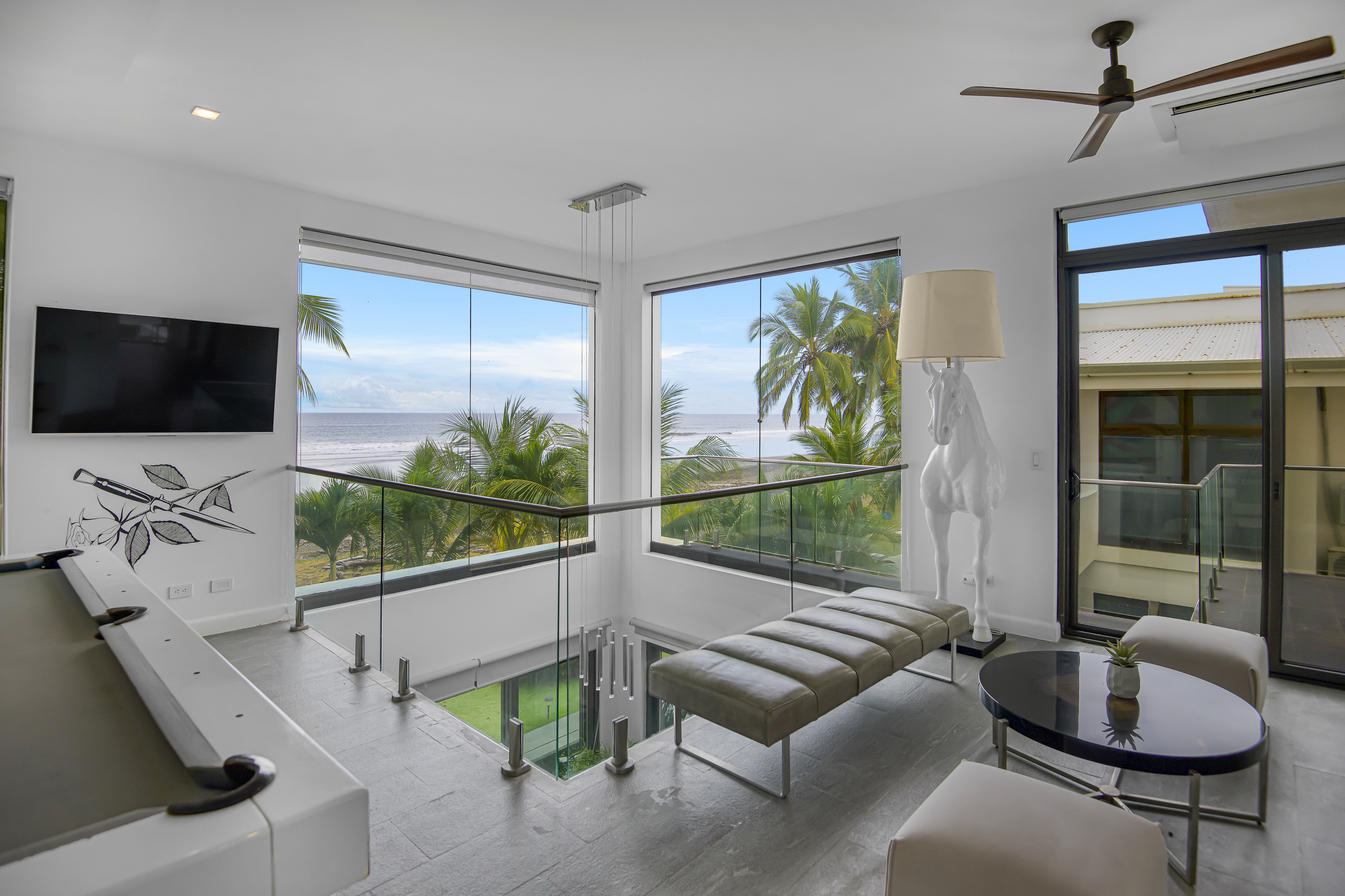 Inside, the bright and sophisticated great room anchors the home, featuring plush seating, curated contemporary décor ideal for art display, and a gourmet chef’s kitchen equipped with premium GE Monogram appliances and recently updated custom cabinetry. Floor-to-ceiling glass and Pella windows and doors frame the ocean beyond, while an integrated Elan surround sound system delivers immersive audio throughout the interior and exterior living spaces. High-speed Wi-Fi keeps the home fully connected.