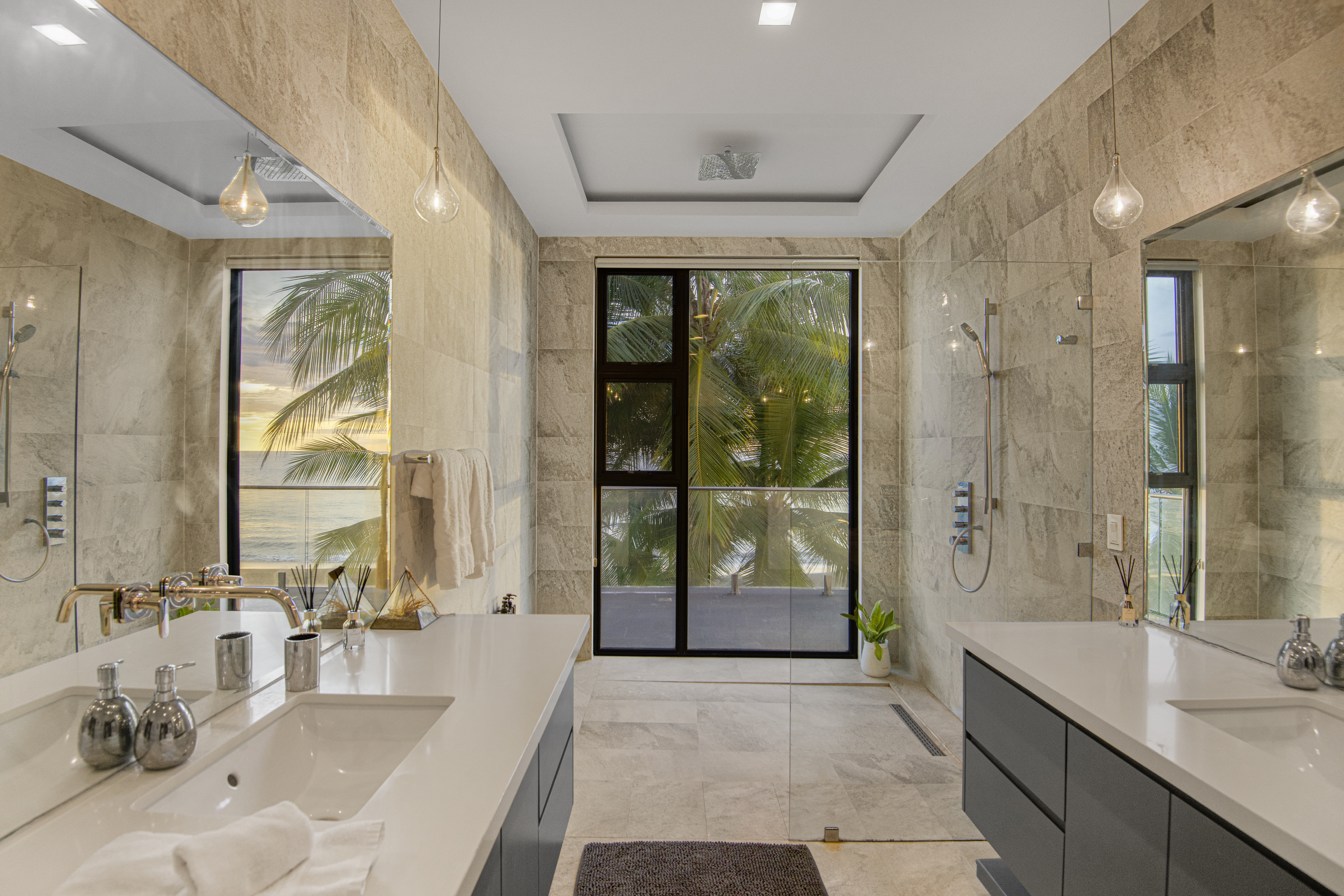 Six private bedrooms accommodate up to twelve, including four ensuite suites. Nearly all feature ocean-view balconies, spa-style bathrooms with stone and tile finishes, and luxury linens. Multiple primary suites enjoy in-room audio and sweeping coastal outlooks.
