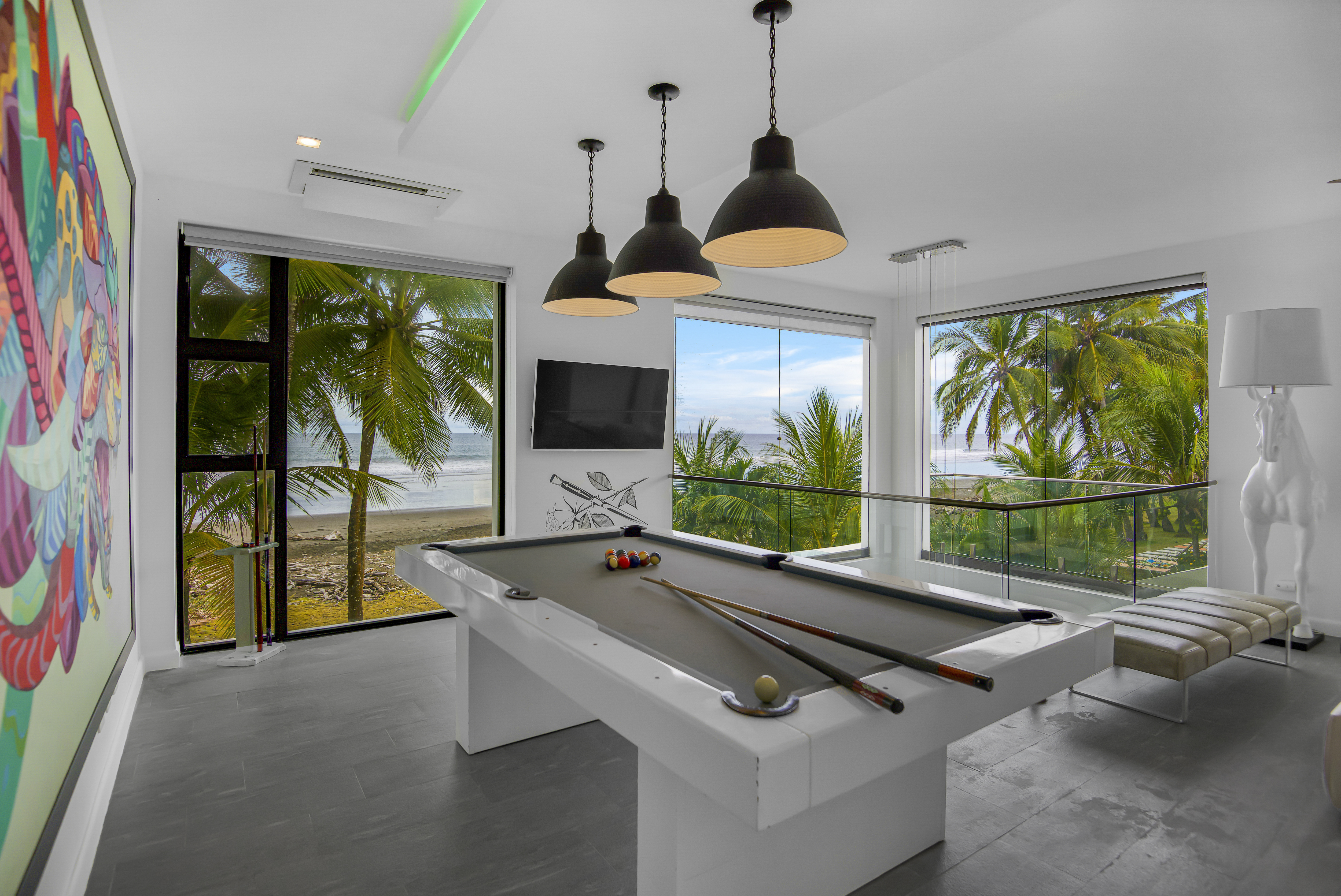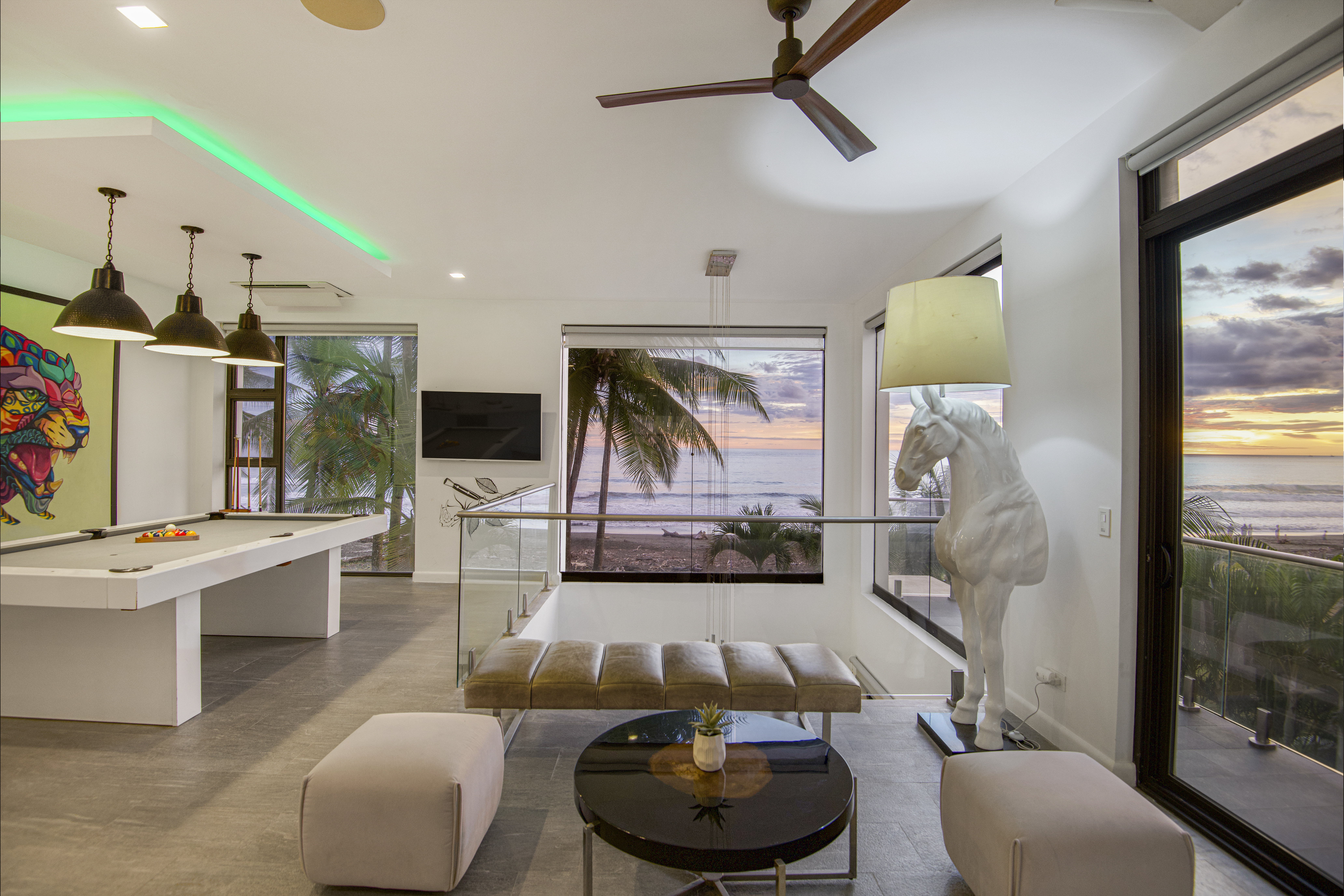 The second floor hosts an elevated game lounge with pool table and panoramic sunset views—an ideal social hub for guests and family alike.