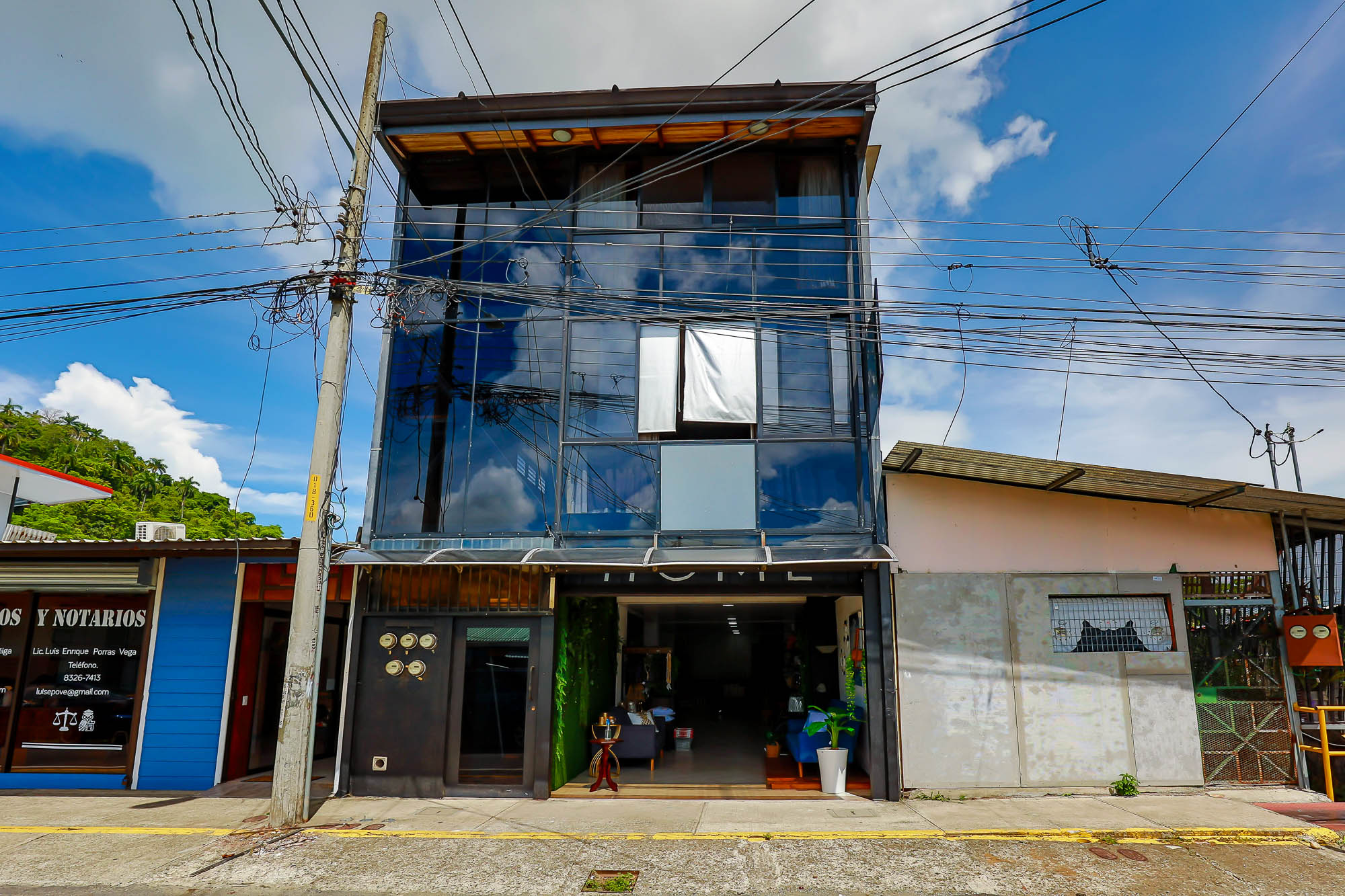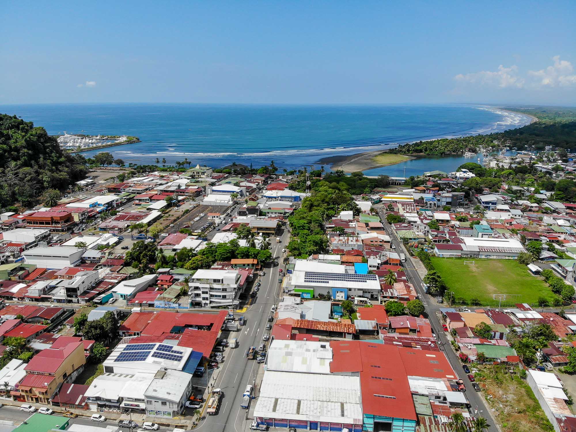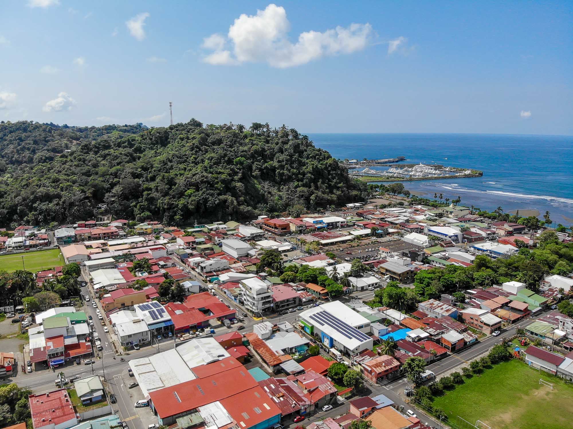 The property has a commercial space ideal for a small business on the first floor, two studio apartments along with an additional two-bedroom, one-bath townhome on the second floor, and a two bedroom/ two bathroom, single level house on the third floor. The first level boasts a big garage door that opens up completely to give very good visibility within its 120 m2 open space. It comes with a private bathroom with handicap access, and is a perfect setting for a store, clinic, pet shop or beauty salon. The studios on the second floor are comfortable units ideal for a couple or individuals, while the two-bedroom apartment gives more flexibility as a rental option. Finally, the whole third floor is composed of a big apartment with two bedrooms, two full baths, a laundry room, a big kitchen, a living and dining area, a balcony and a terrace with a partial ocean view looking out to the Quepos pier. This unit is normally rented long term to foreign visitors that do remote work while they enjoy the perks of the Pacific lifestyle.