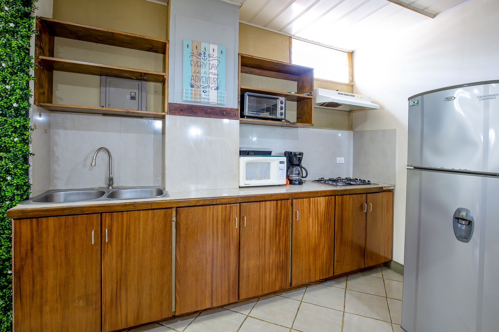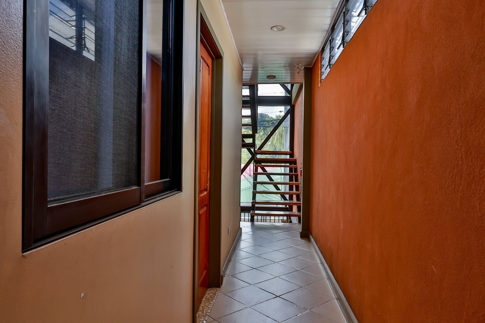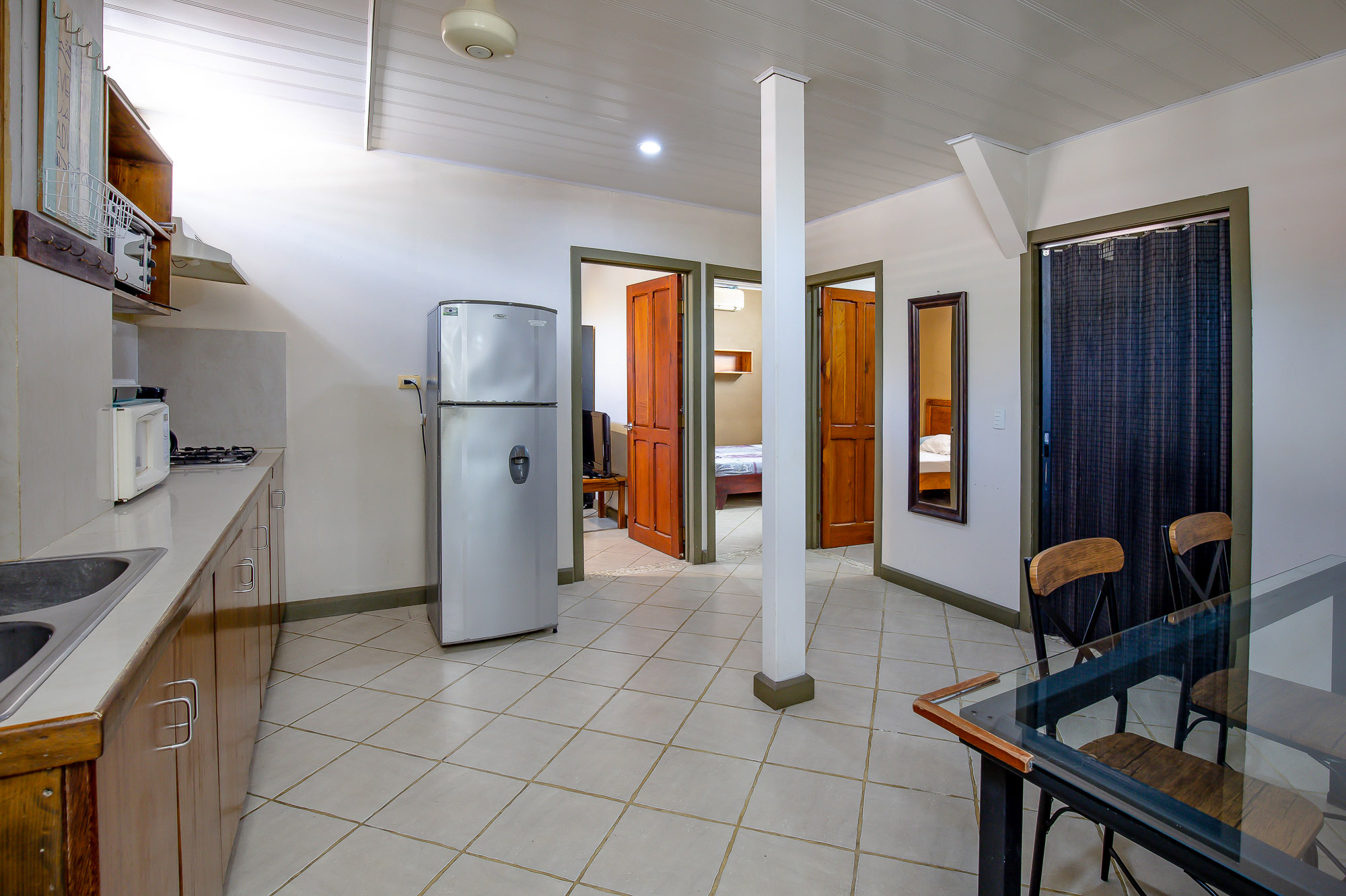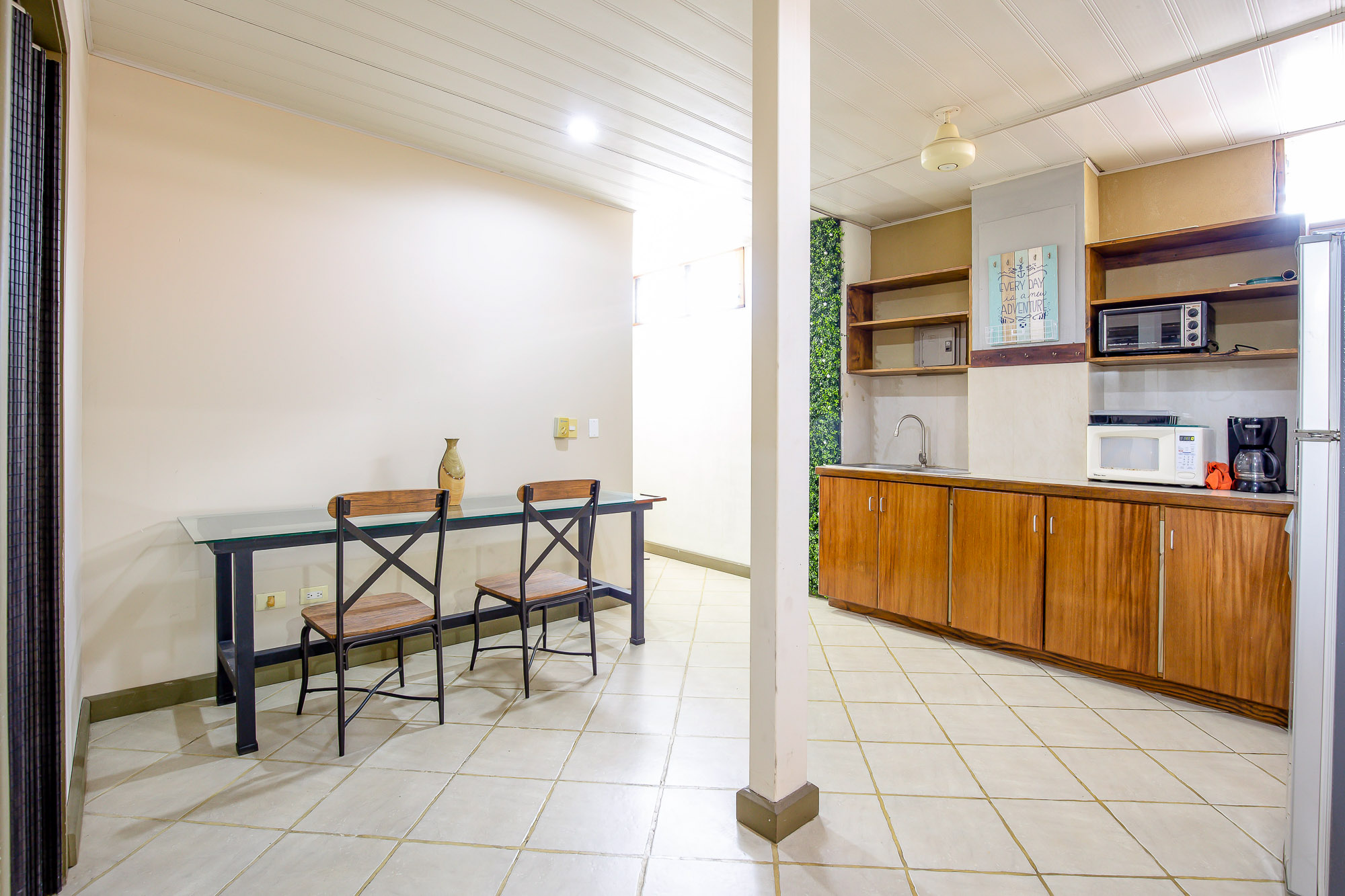 The property has a commercial space ideal for a small business on the first floor, two studio apartments along with an additional two-bedroom, one-bath townhome on the second floor, and a two bedroom/ two bathroom, single level house on the third floor. The first level boasts a big garage door that opens up completely to give very good visibility within its 120 m2 open space. It comes with a private bathroom with handicap access, and is a perfect setting for a store, clinic, pet shop or beauty salon. The studios on the second floor are comfortable units ideal for a couple or individuals, while the two-bedroom apartment gives more flexibility as a rental option. Finally, the whole third floor is composed of a big apartment with two bedrooms, two full baths, a laundry room, a big kitchen, a living and dining area, a balcony and a terrace with a partial ocean view looking out to the Quepos pier. This unit is normally rented long term to foreign visitors that do remote work while they enjoy the perks of the Pacific lifestyle.