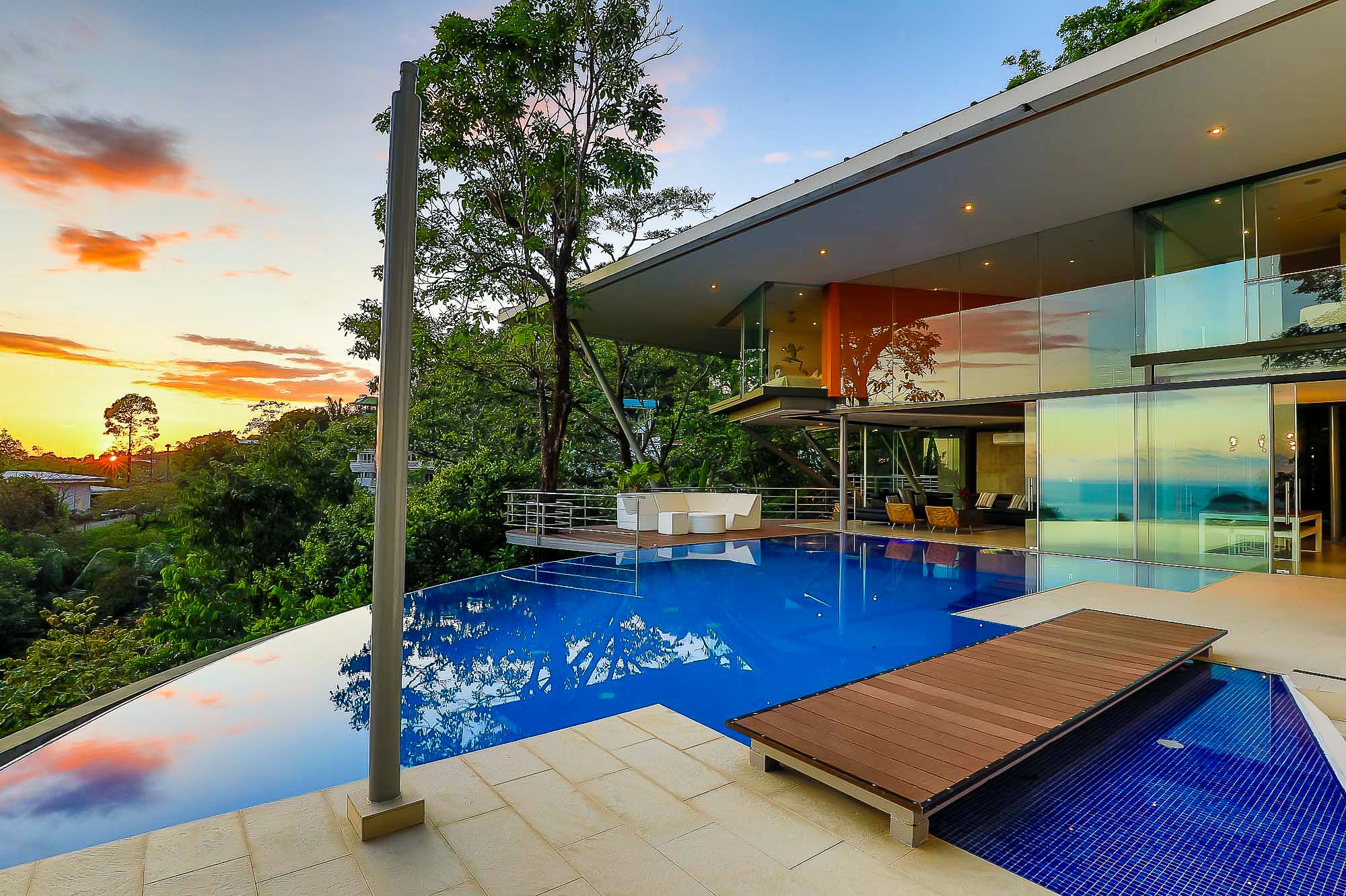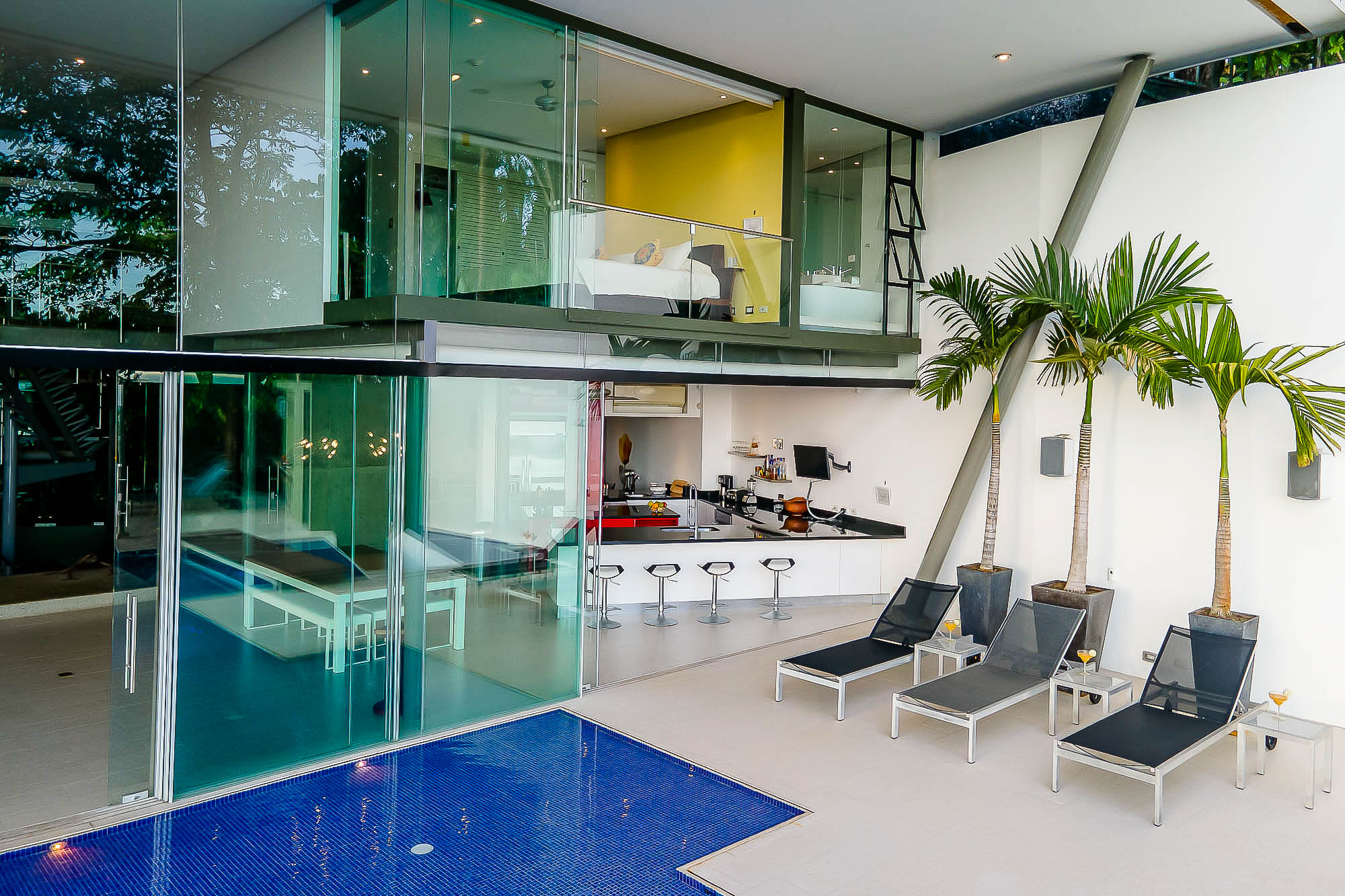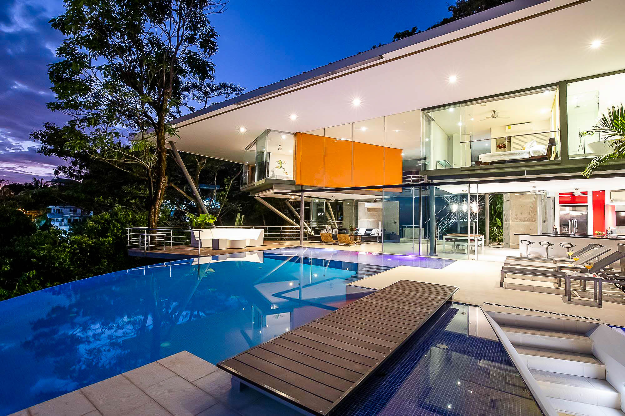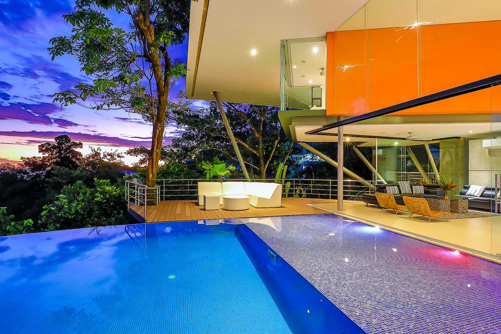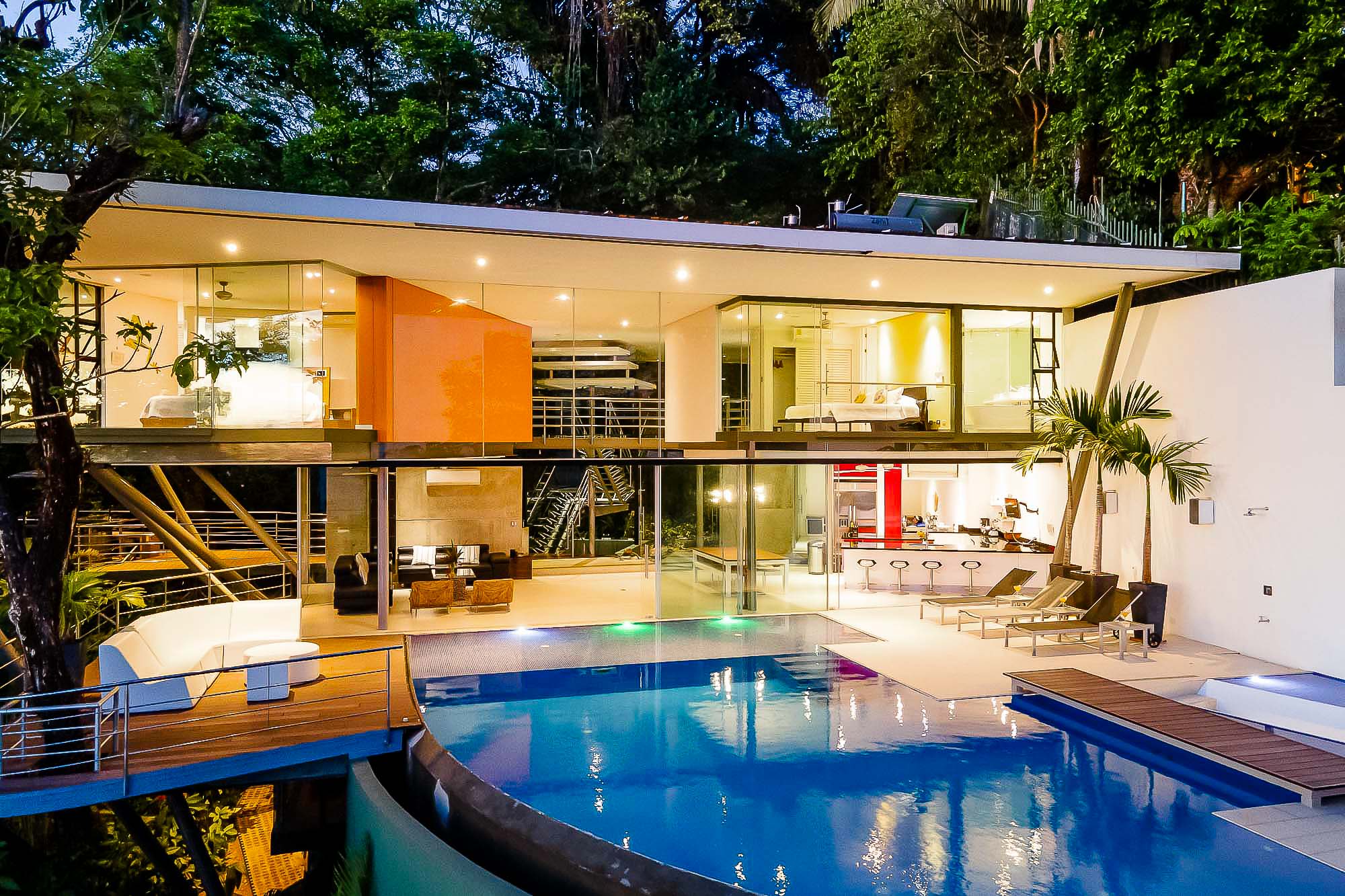 This ultra-modern house is perched high on a private hill side and is only reached from the parking area via an inclined elevator (funicular) to afford the ultimate in privacy and natural beauty. Large retractable glass walls produce an indoor-outdoor harmony that lets you become part of the surrounding nature and have been designed to allow to marvel at the daily wildlife visits and to feel in harmony with the jungle canopy.