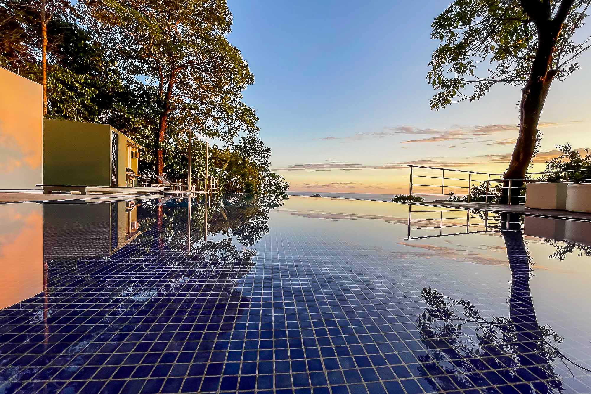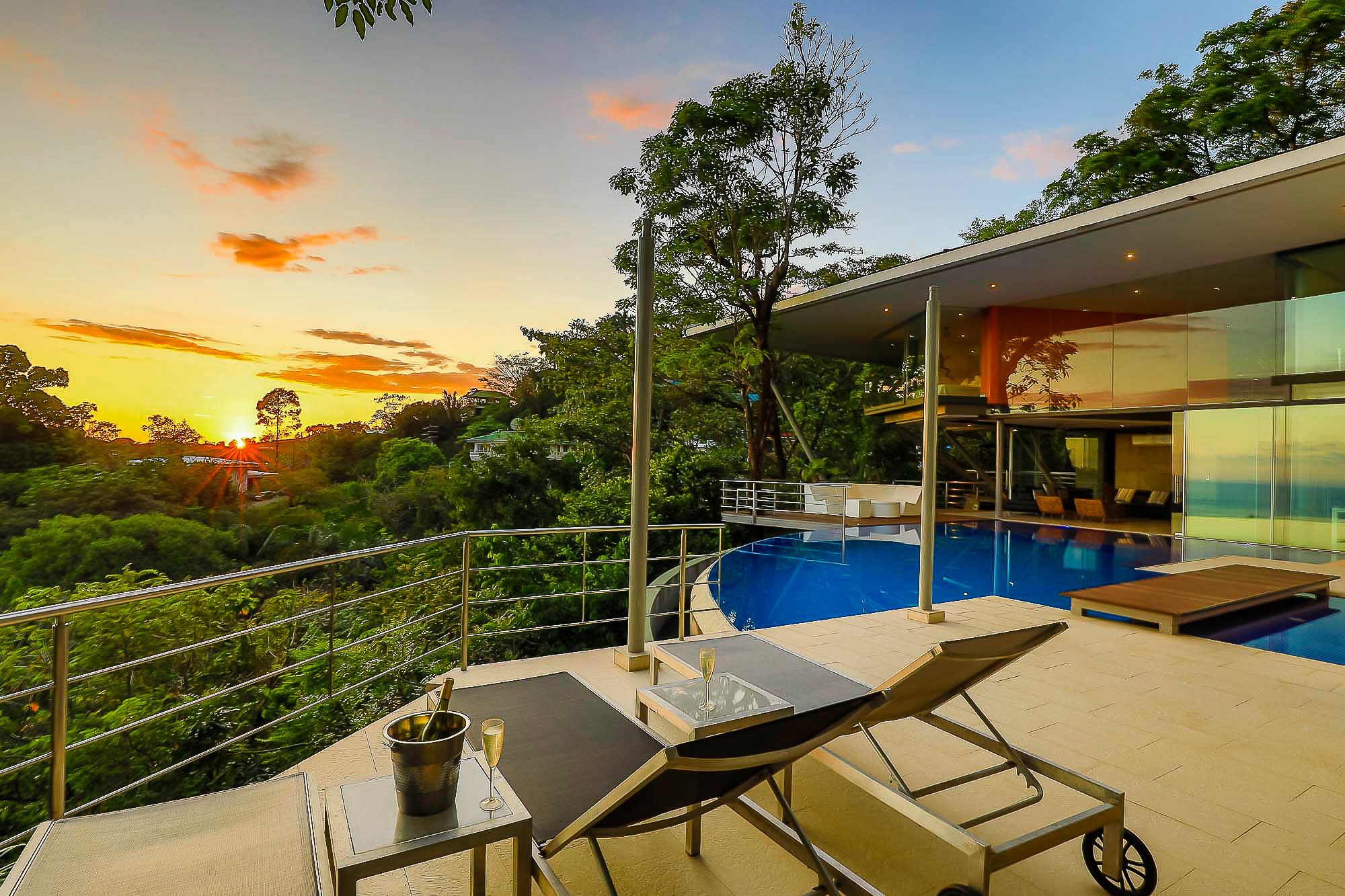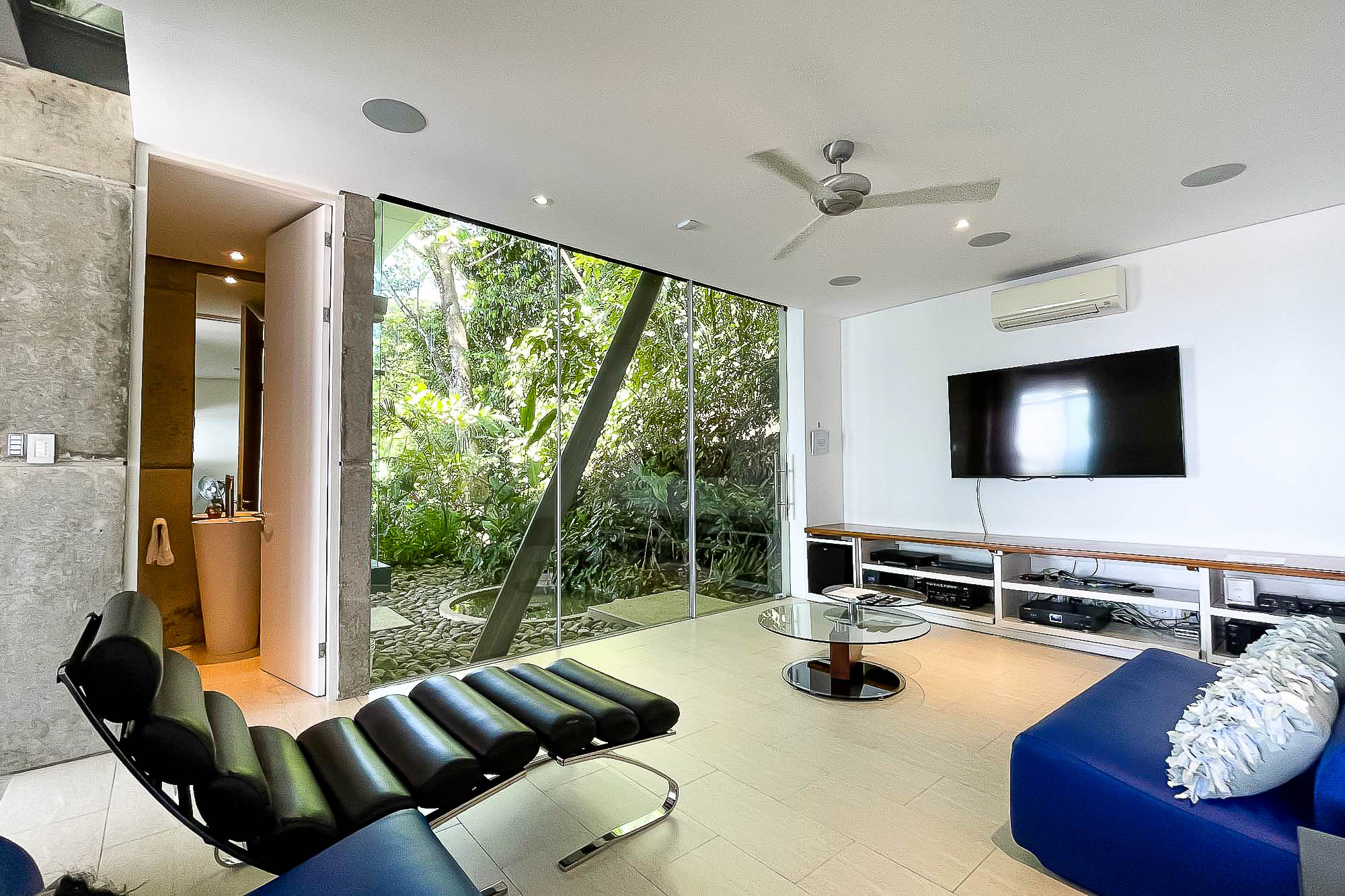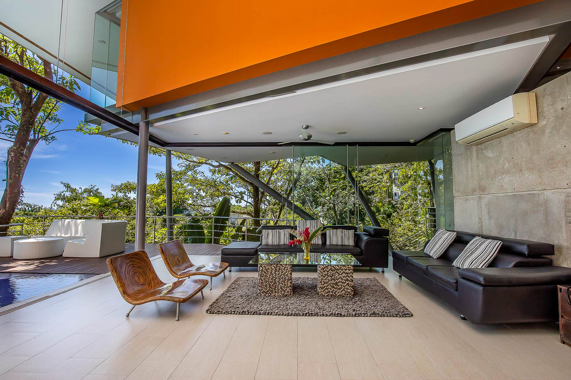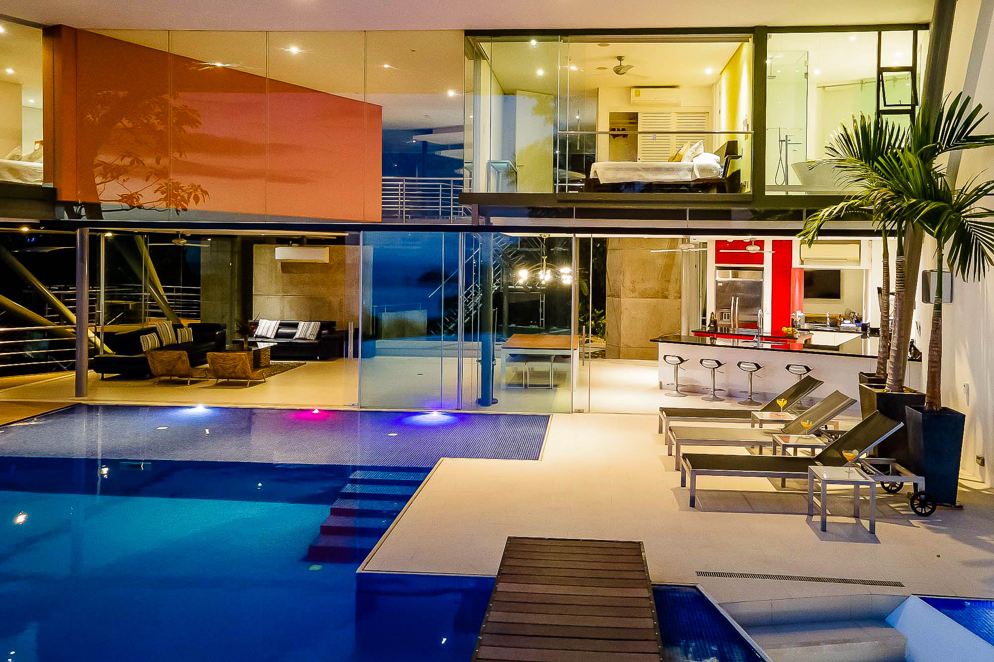 This ultra-modern house is perched high on a private hill side and is only reached from the parking area via an inclined elevator (funicular) to afford the ultimate in privacy and natural beauty. Large retractable glass walls produce an indoor-outdoor harmony that lets you become part of the surrounding nature and have been designed to allow to marvel at the daily wildlife visits and to feel in harmony with the jungle canopy.