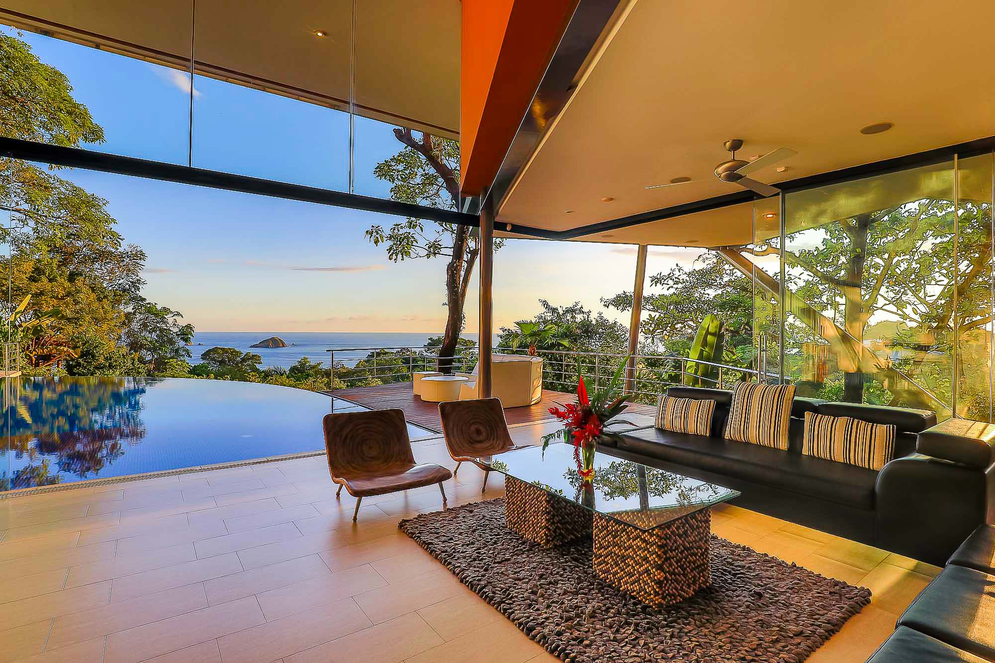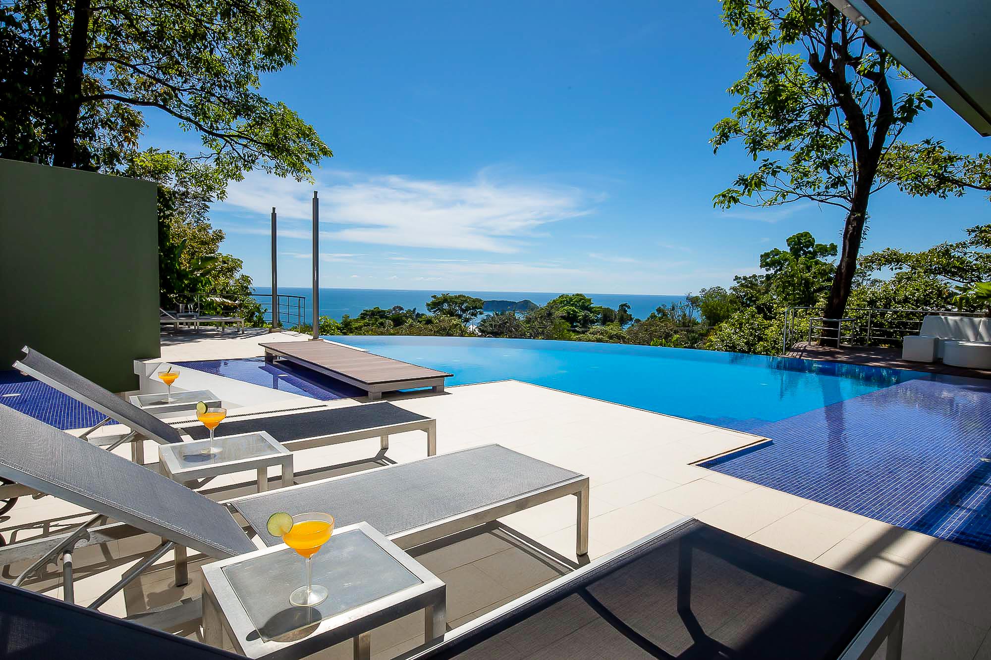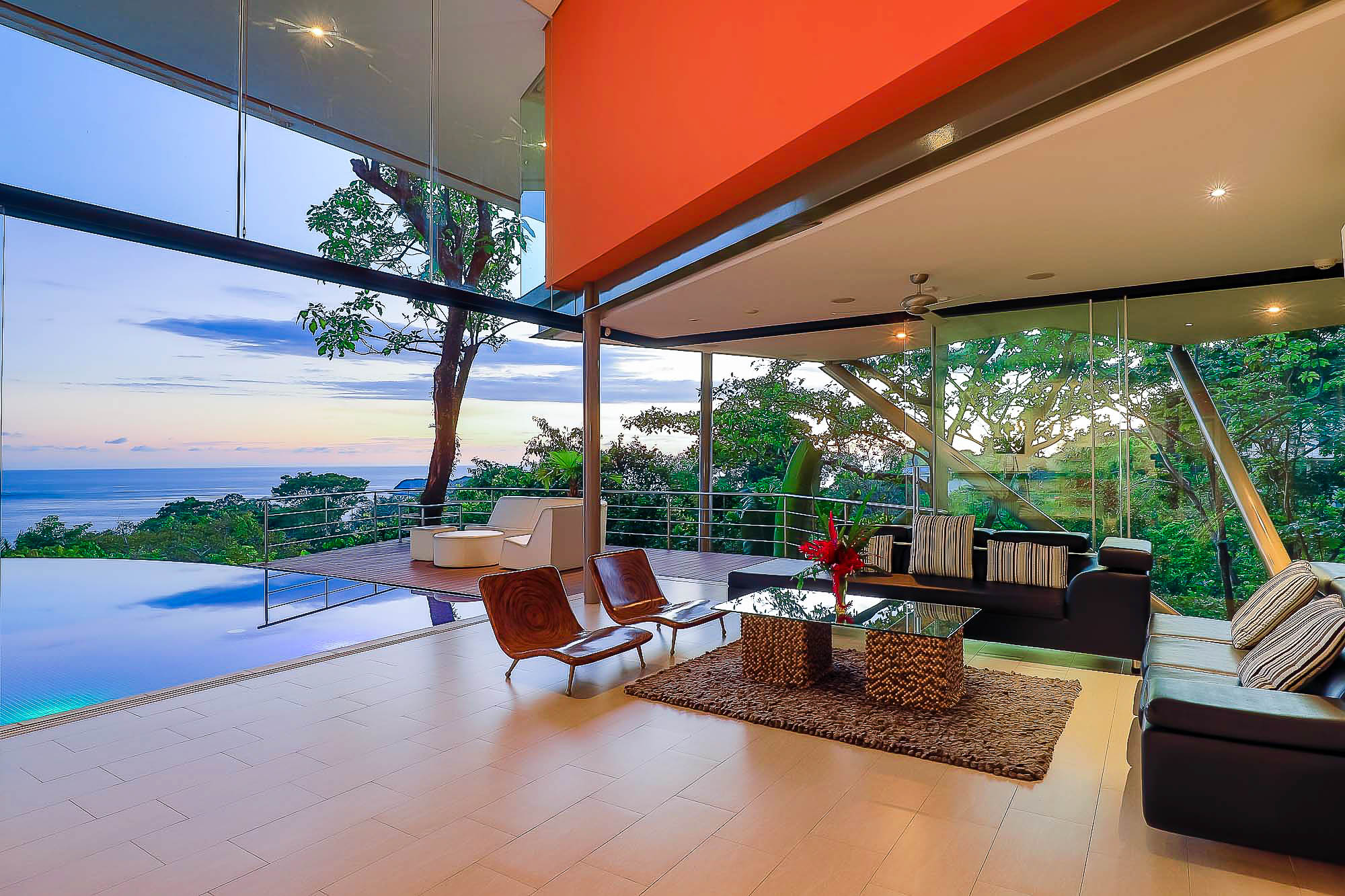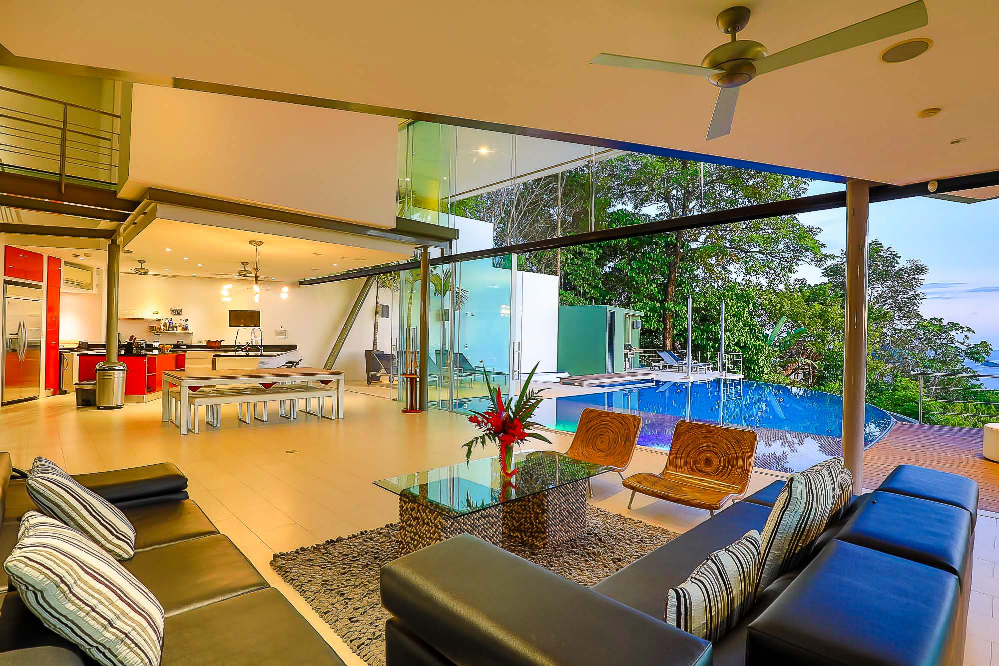The house itself features luxurious finishings in all bathrooms and bedrooms, a high-end kitchen with stainless steel appliances, induction cooktop, wine refrigerator, ice maker, breakfast bar counter etc. The large kitchen is open to the expansive living room and dining area, creating a very large indoor space that connects seamlessly to the three terraces and the beautiful infinity pool when the sliding glass walls are opened. The sensation that this open space creates is magical and allows you to feel immersed in the jungle while enjoying the spectacular views from the luxury of this award winning home.
