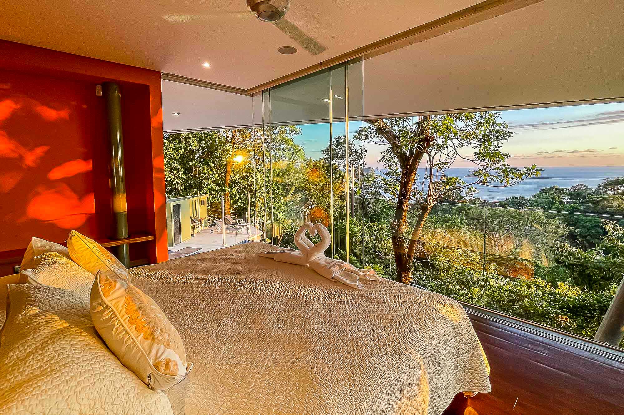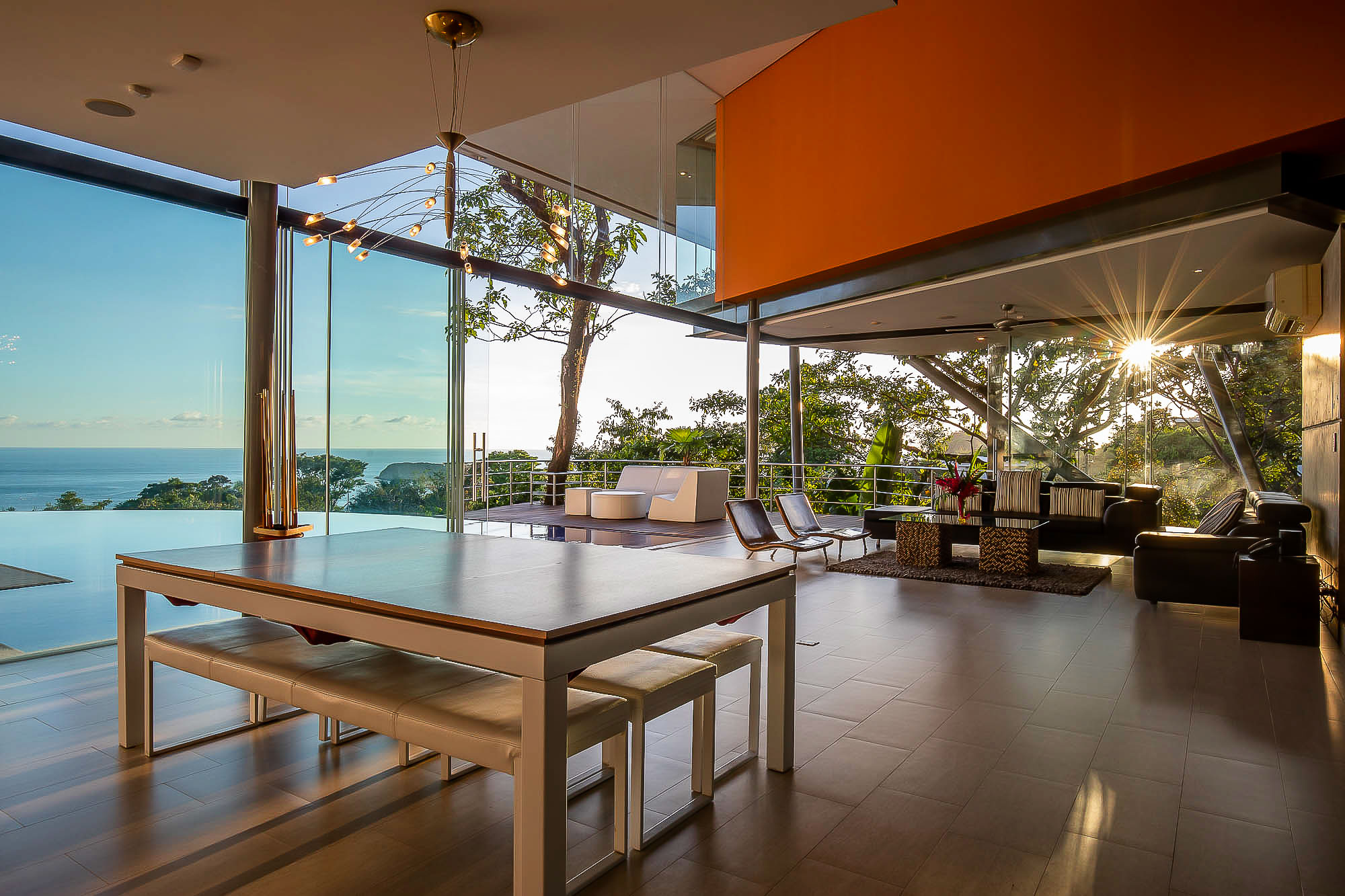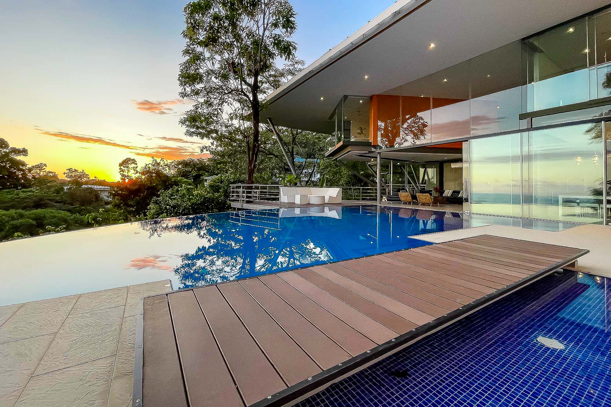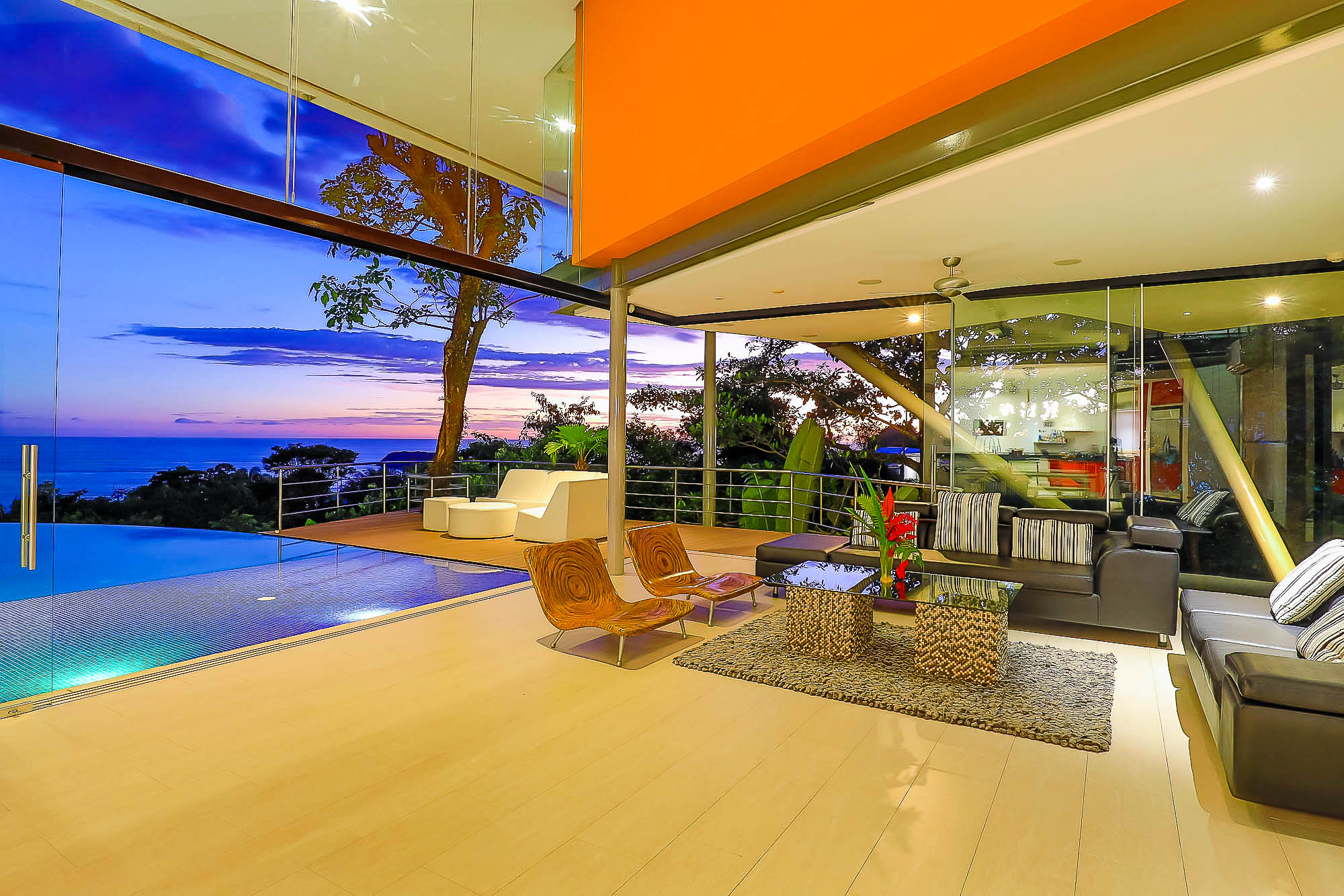 The house itself features luxurious finishings in all bathrooms and bedrooms, a high-end kitchen with stainless steel appliances, induction cooktop, wine refrigerator, ice maker, breakfast bar counter etc. The large kitchen is open to the expansive living room and dining area, creating a very large indoor space that connects seamlessly to the three terraces and the beautiful infinity pool when the sliding glass walls are opened. The sensation that this open space creates is magical and allows you to feel immersed in the jungle while enjoying the spectacular views from the luxury of this award winning home.