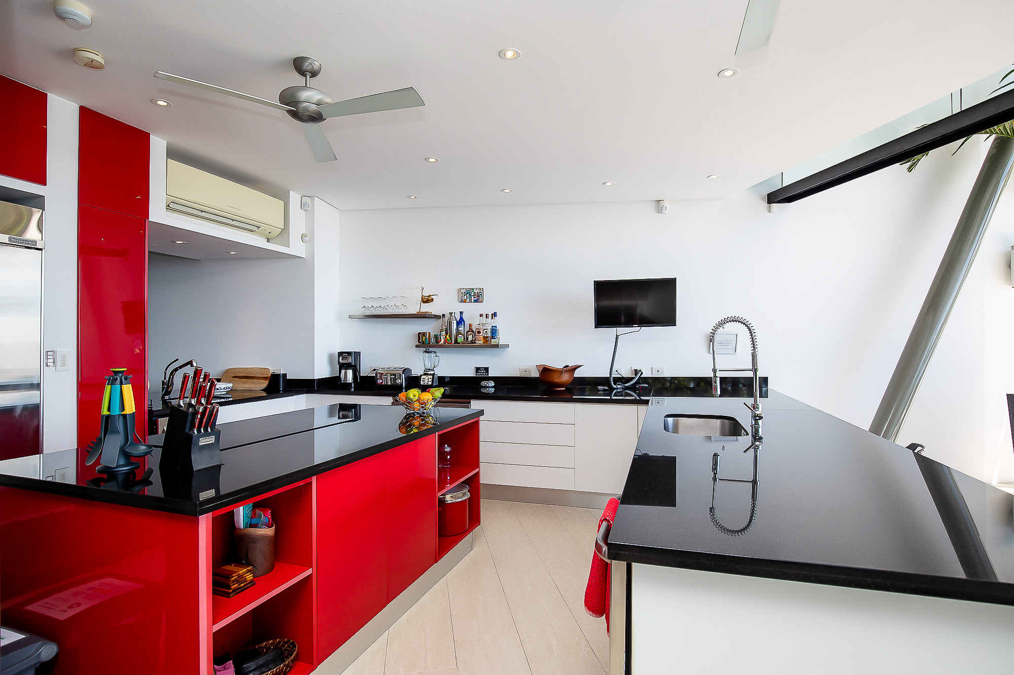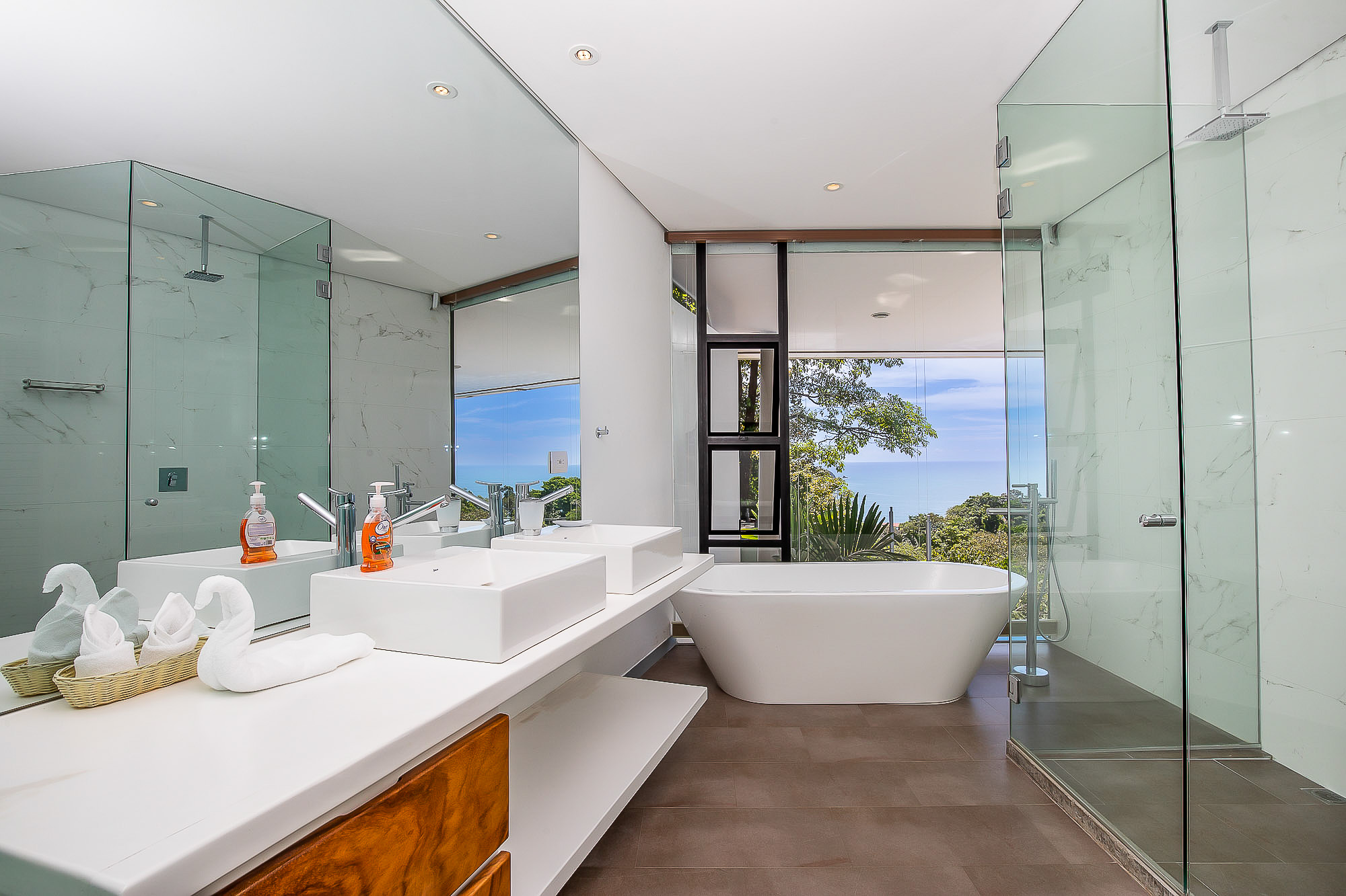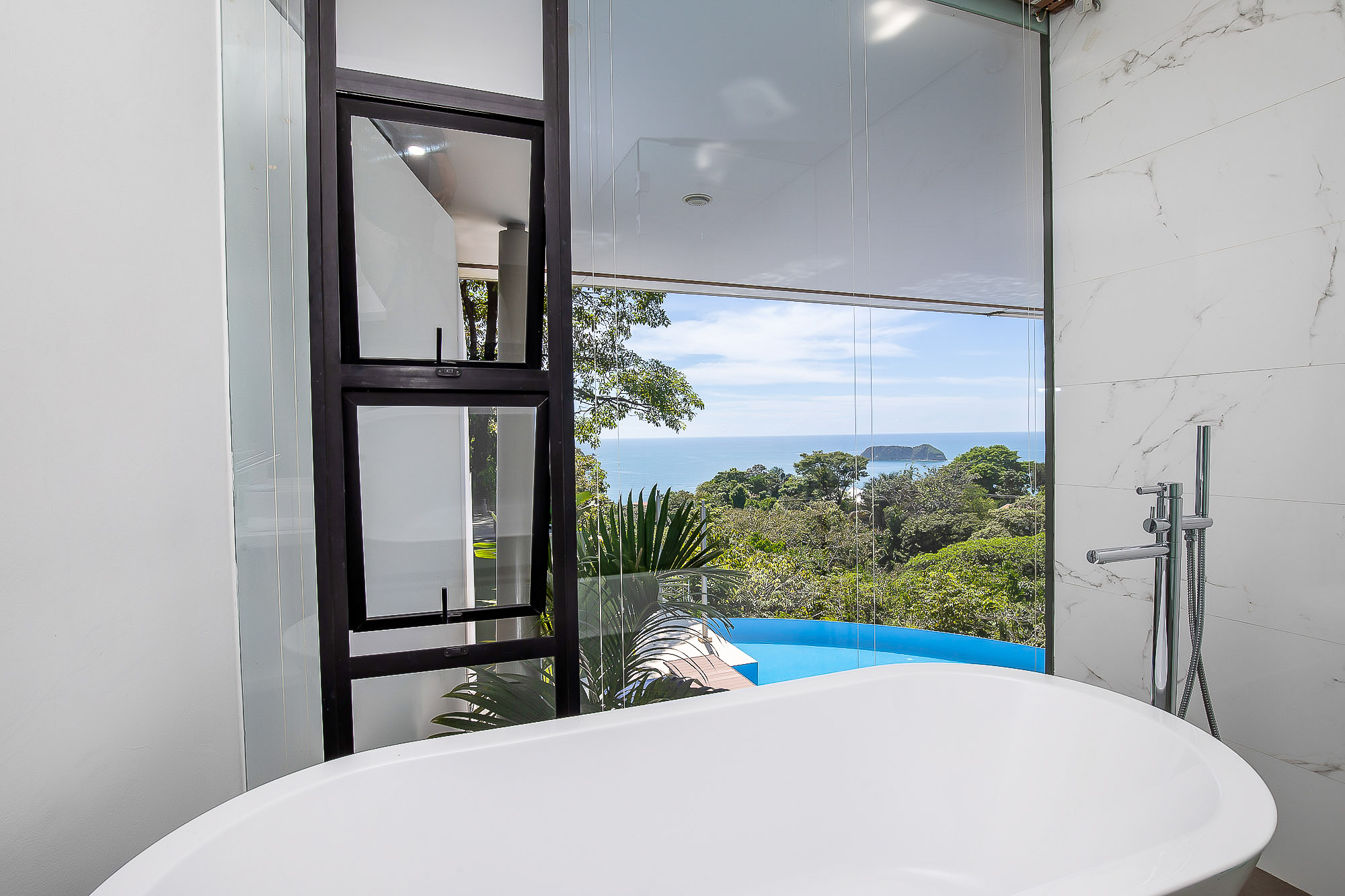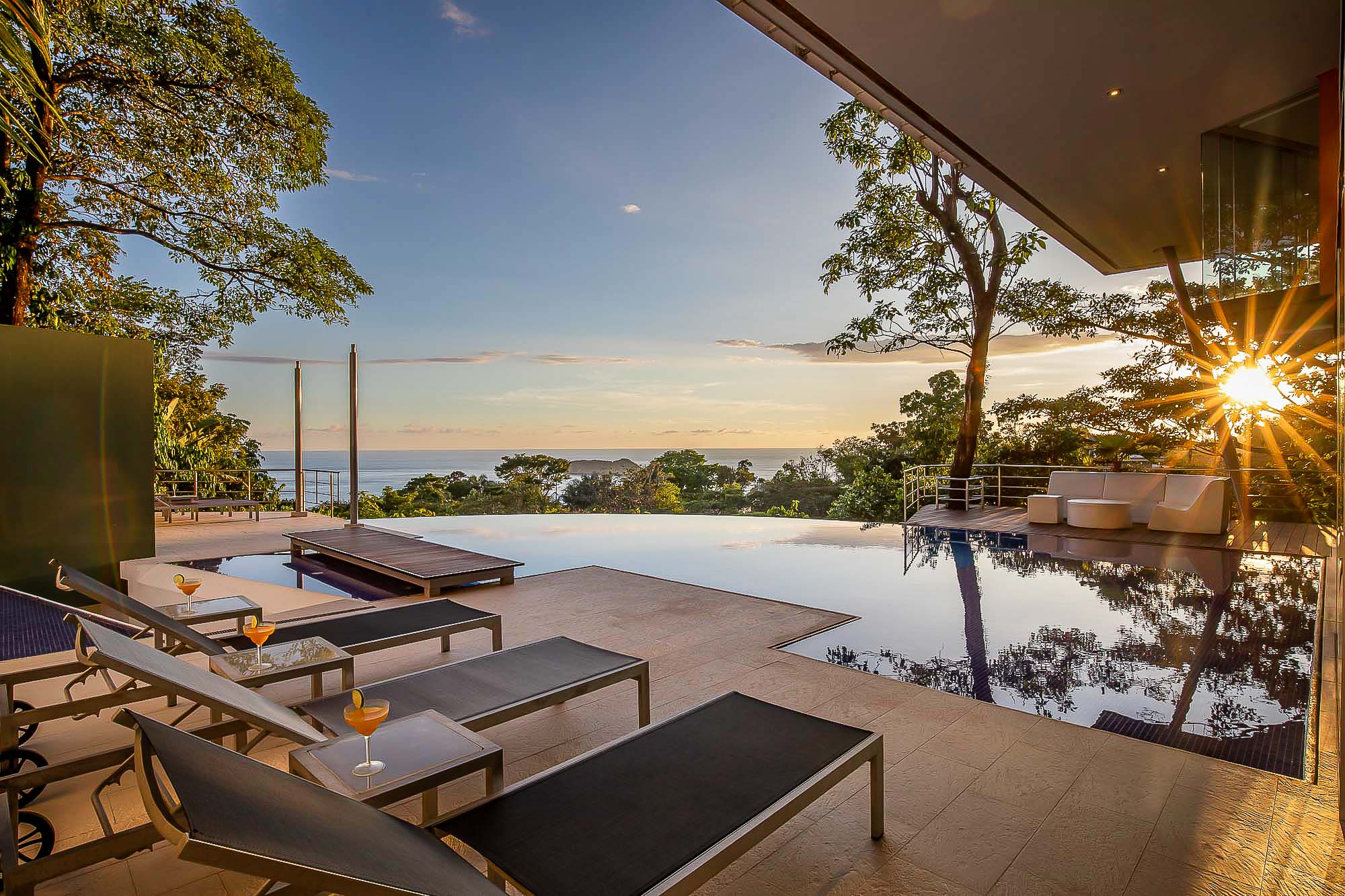 The house itself features luxurious finishings in all bathrooms and bedrooms, a high-end kitchen with stainless steel appliances, induction cooktop, wine refrigerator, ice maker, breakfast bar counter etc. The large kitchen is open to the expansive living room and dining area, creating a very large indoor space that connects seamlessly to the three terraces and the beautiful infinity pool when the sliding glass walls are opened. The sensation that this open space creates is magical and allows you to feel immersed in the jungle while enjoying the spectacular views from the luxury of this award winning home.