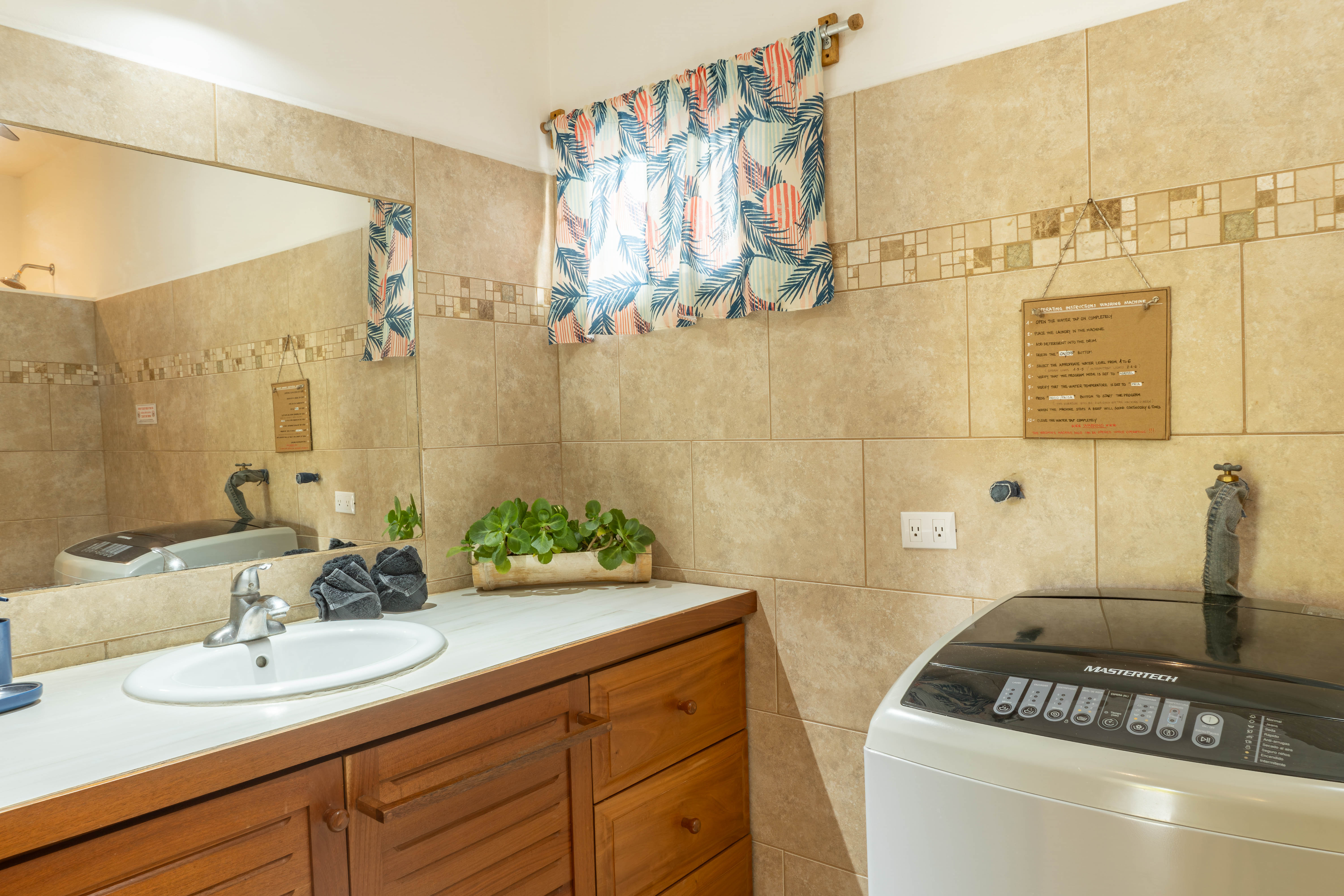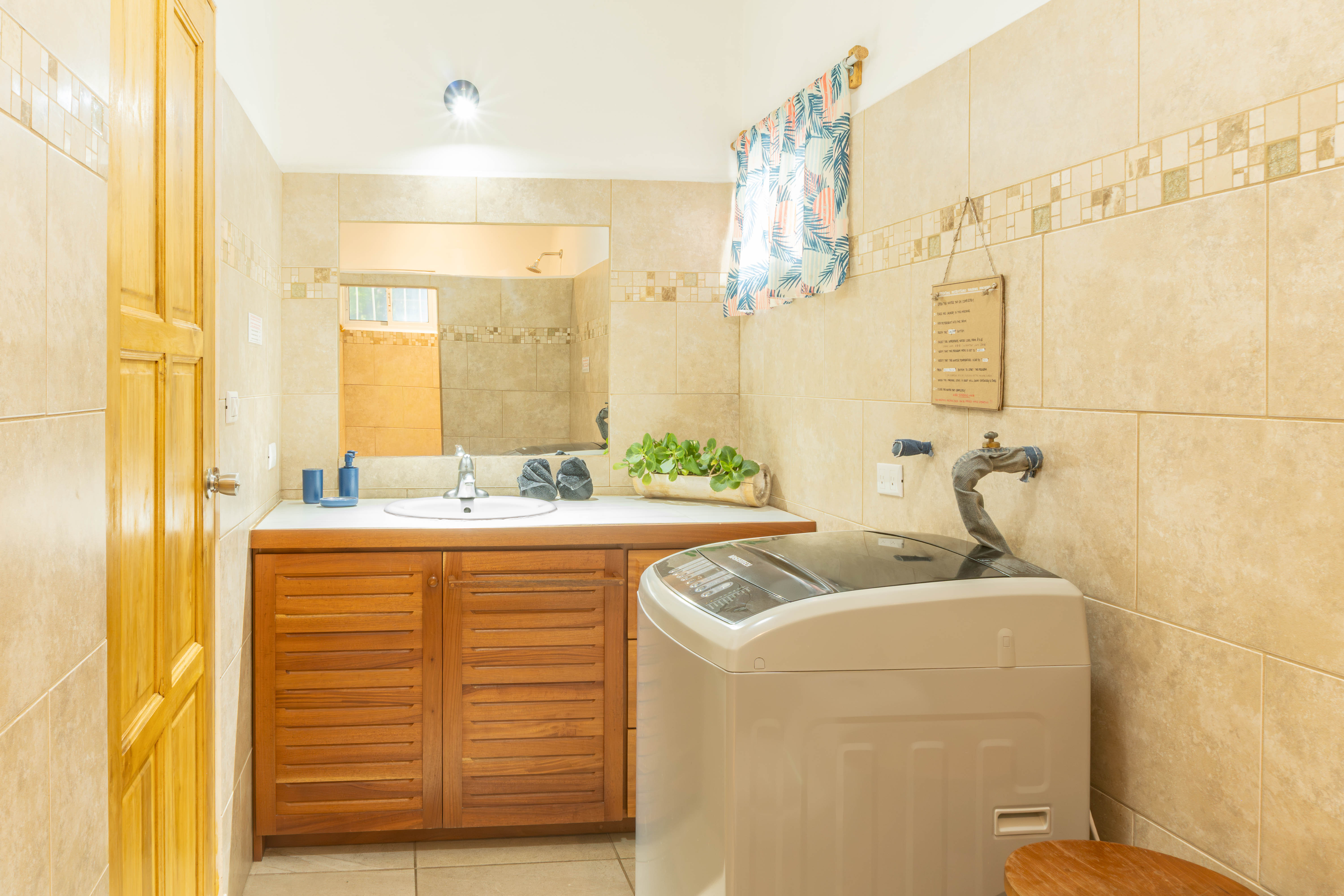 At the rear of the property is a dedicated laundry and storage room with washing machine, dryer, and a separate toilet, adding convenience for owners and/or cleaning staff.