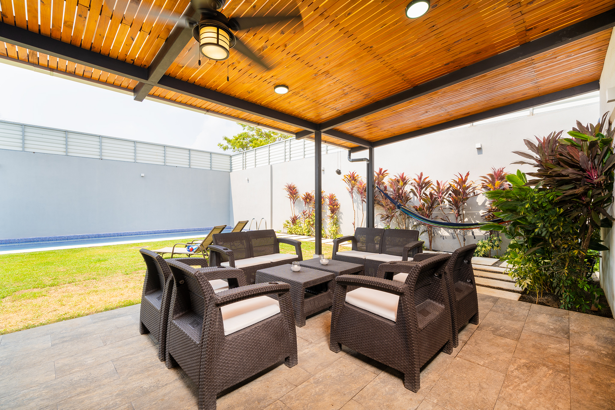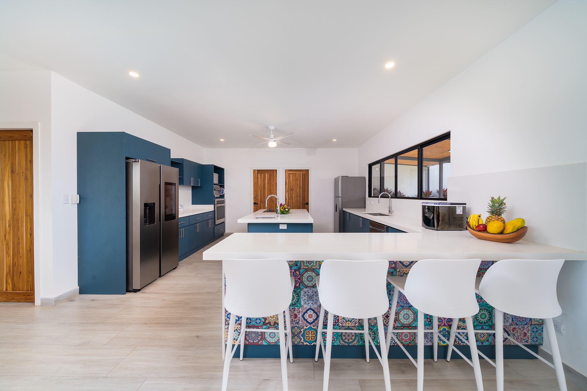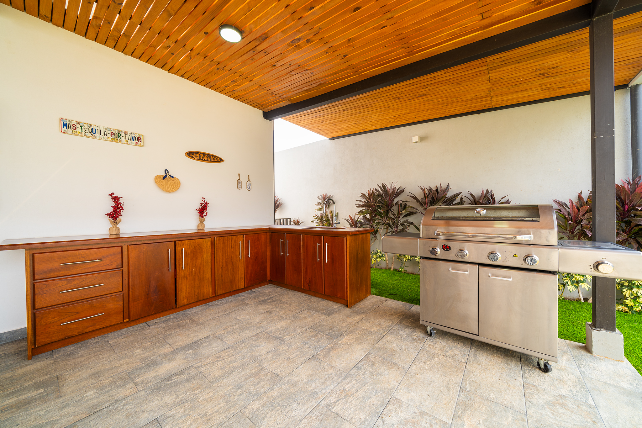 For entertaining, the gourmet kitchen shines, equipped with an island boasting two sinks, two refrigerators, and a breakfast bar. A convenient pantry and laundry room enhance daily living. Step outside to a shaded oasis featuring a hammock, outdoor seating, and custom dining tables crafted from local Guanacaste wood, accompanied by a BBQ grill.