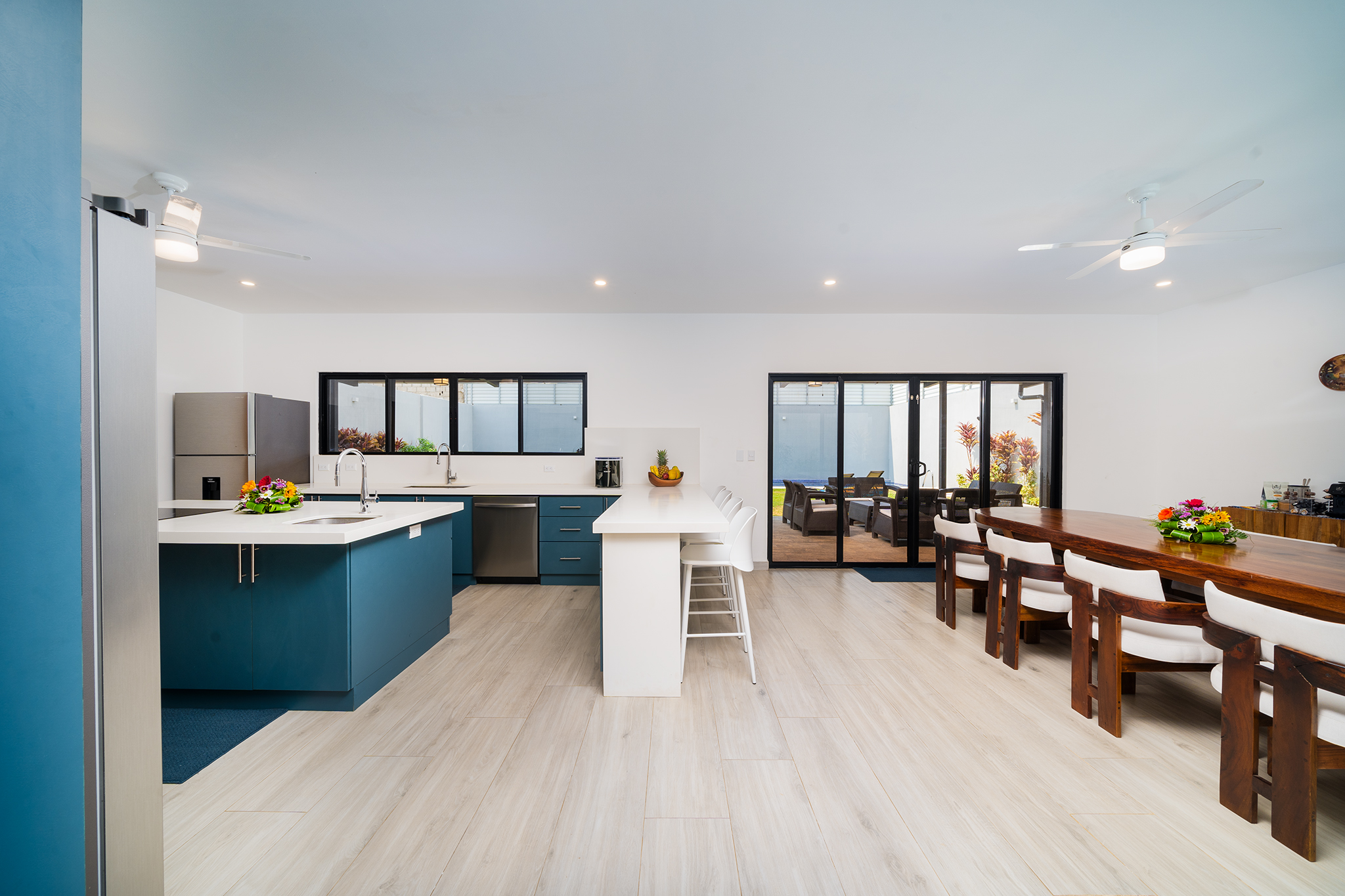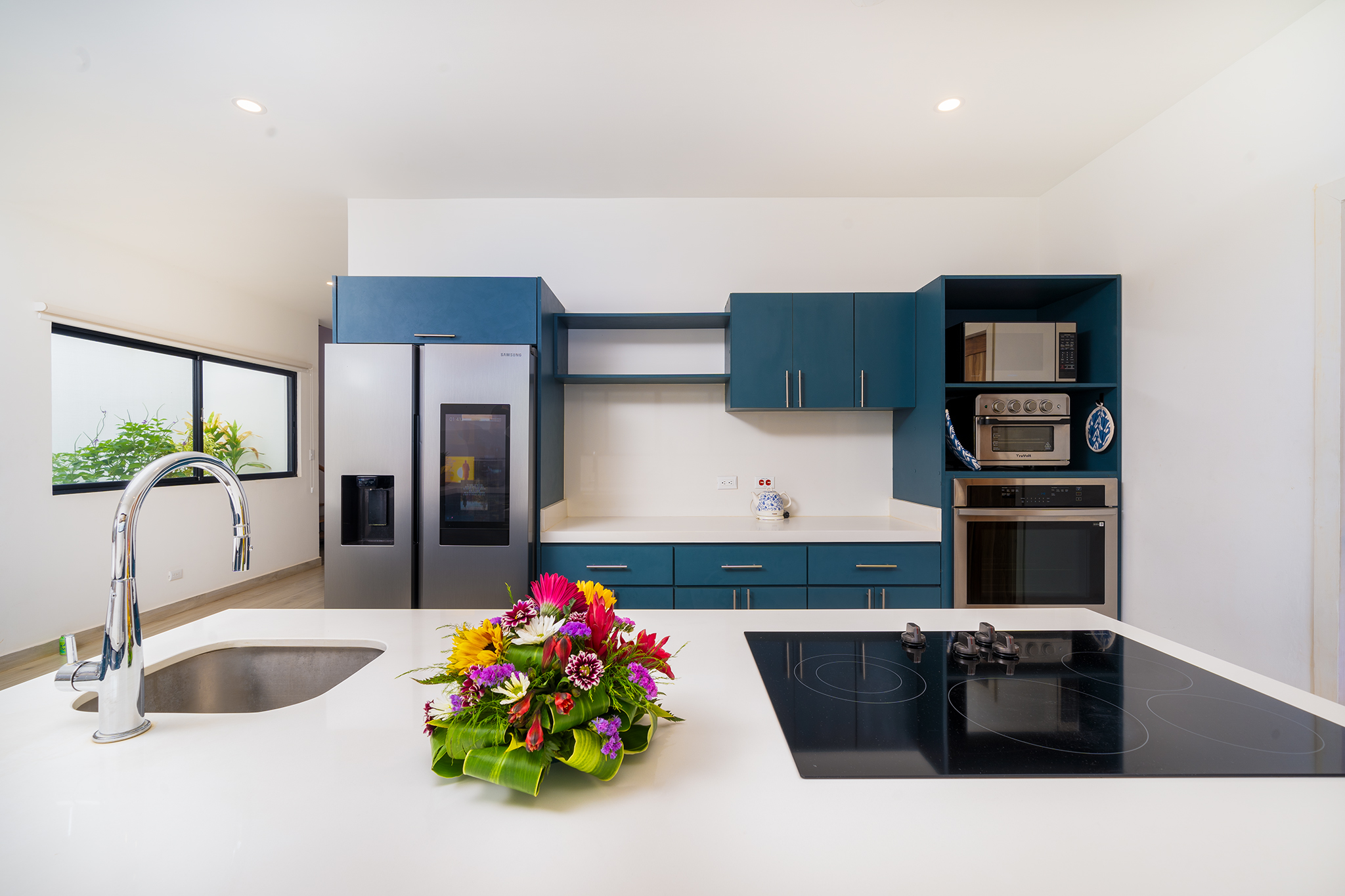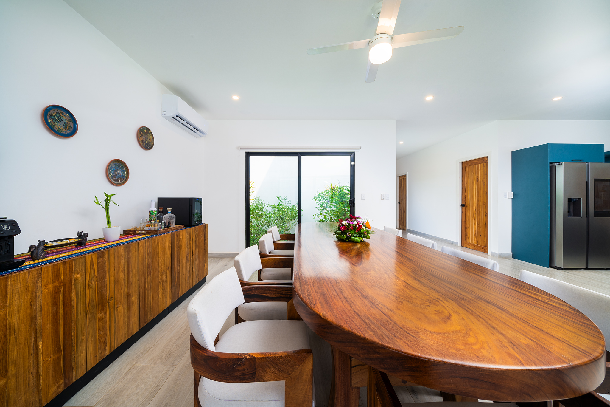 For entertaining, the gourmet kitchen shines, equipped with an island boasting two sinks, two refrigerators, and a breakfast bar. A convenient pantry and laundry room enhance daily living. Step outside to a shaded oasis featuring a hammock, outdoor seating, and custom dining tables crafted from local Guanacaste wood, accompanied by a BBQ grill.