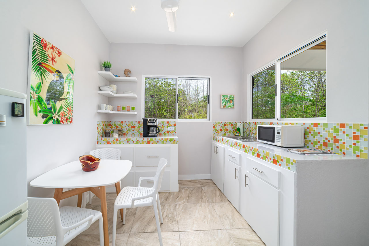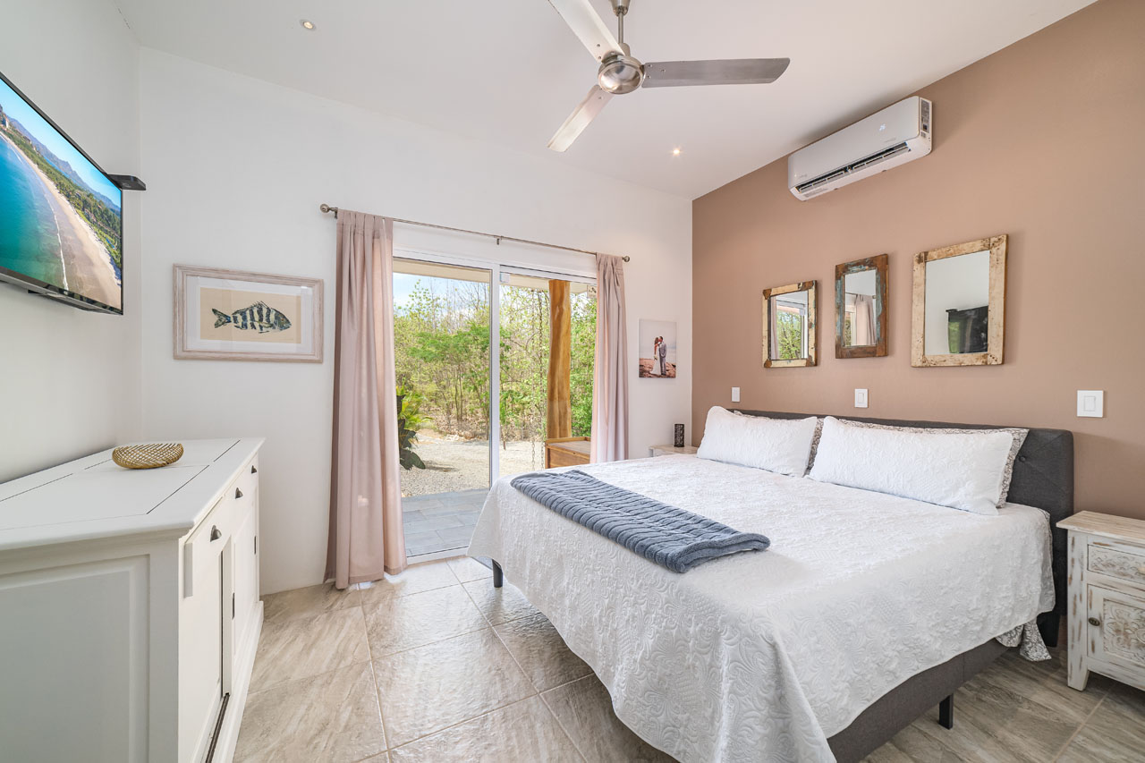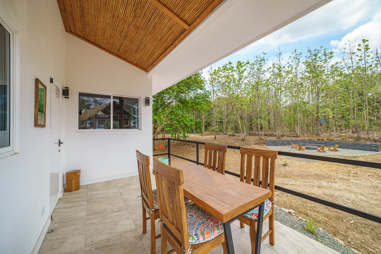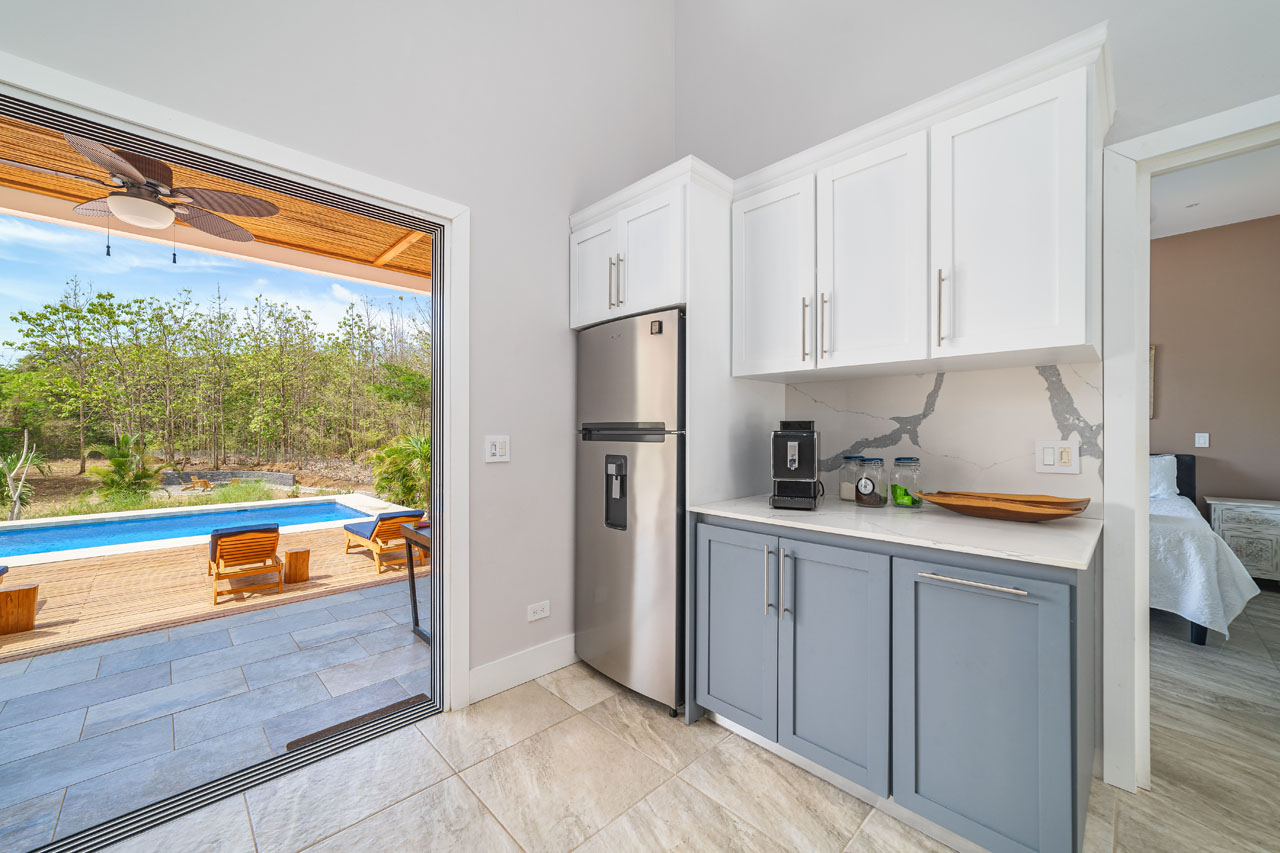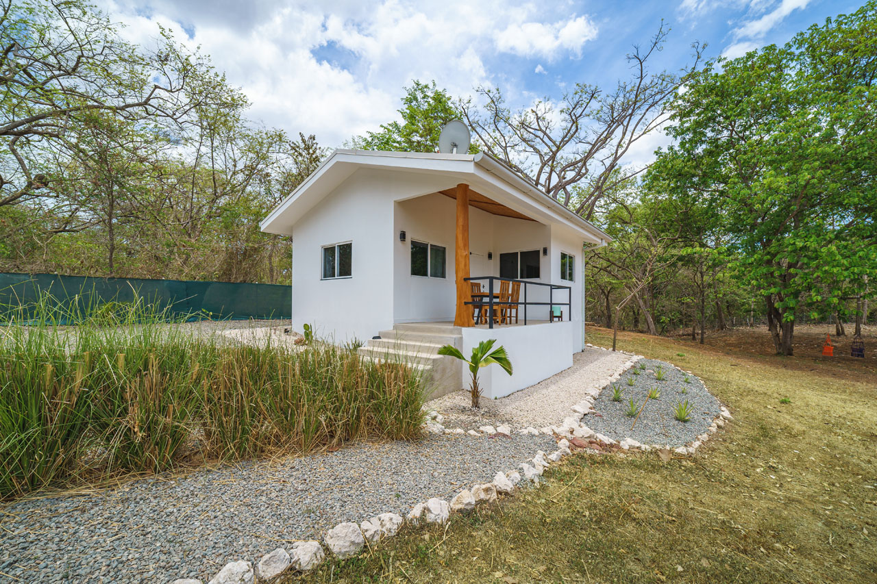 The main 3BR home, measuring about 1500 square feet of living space, features an open living space with soaring ceilings that keep the space cool and fresh. The kitchen has tons of counter space and direct access to the patio, allowing food to be served outdoors in Guanacaste’s perfect year-round weather. The two guest homes, one 2BR and one 1BR, are both livable, with kitchenettes and outdoor patios that would allow for long-term renters’ comfort.