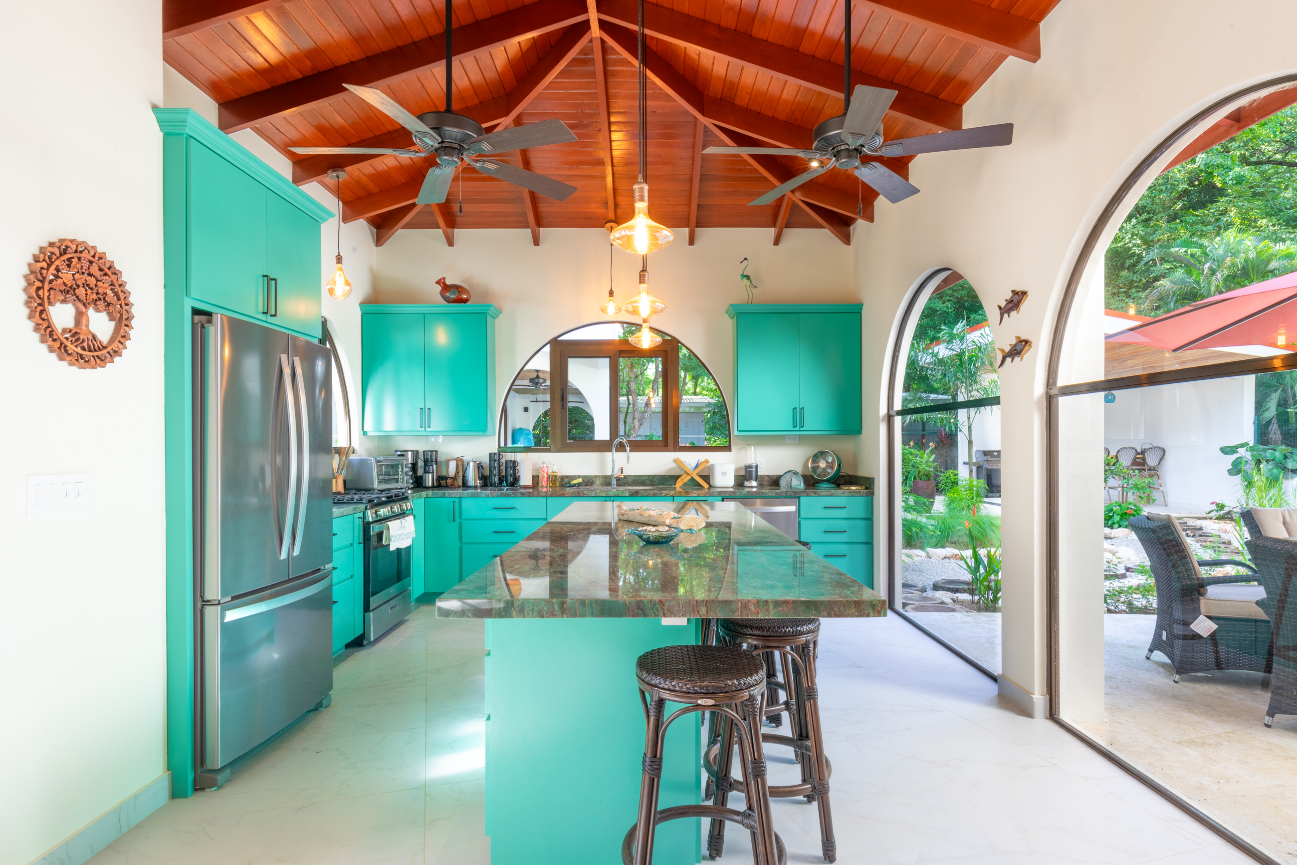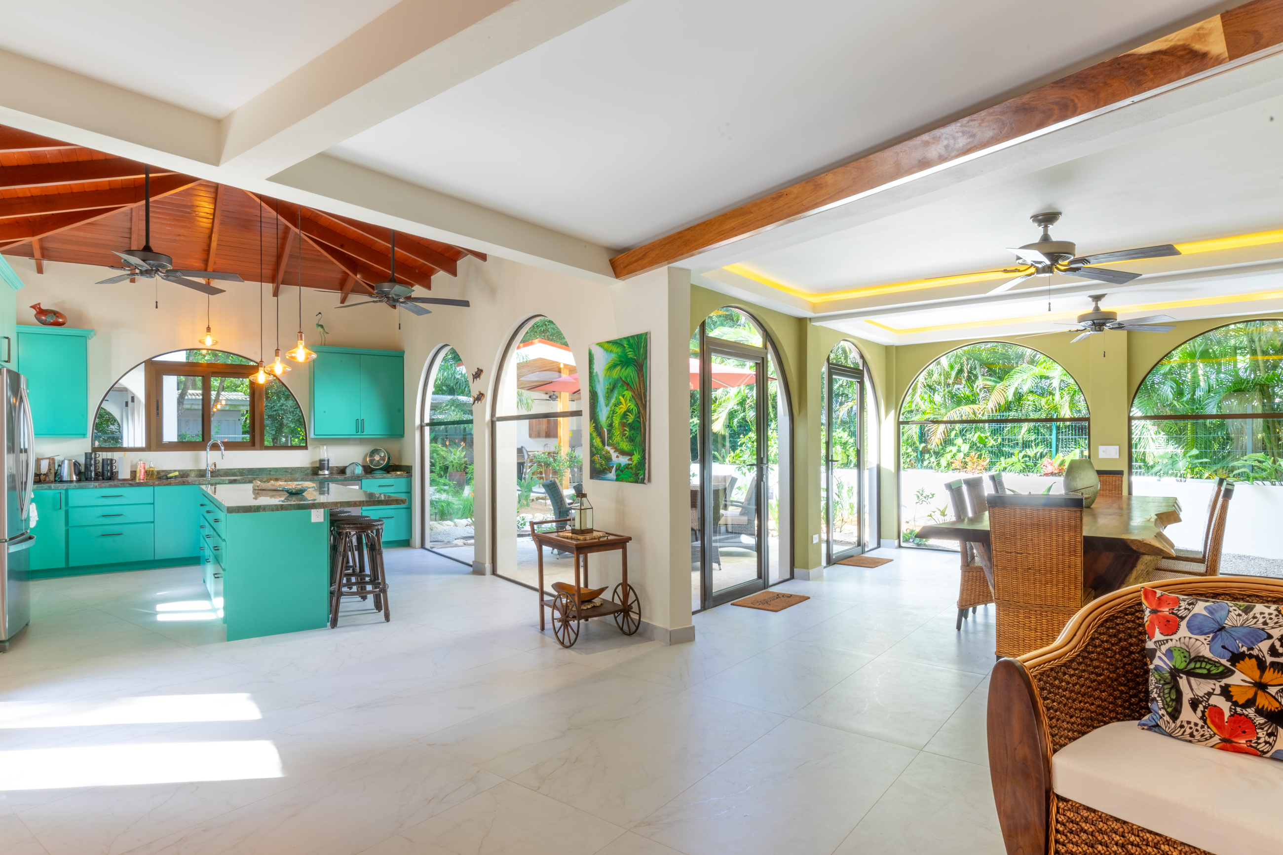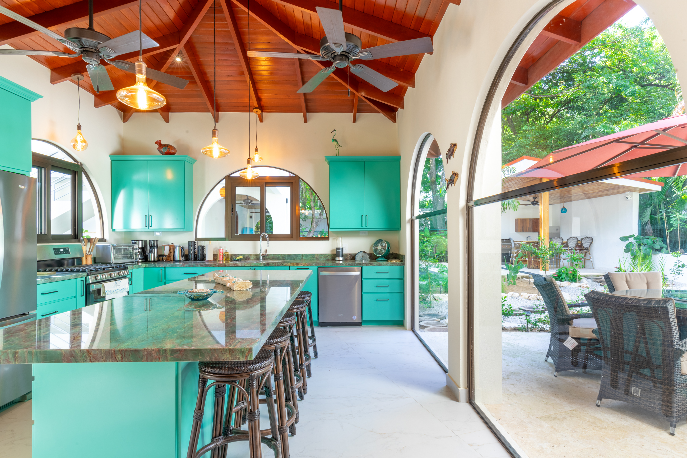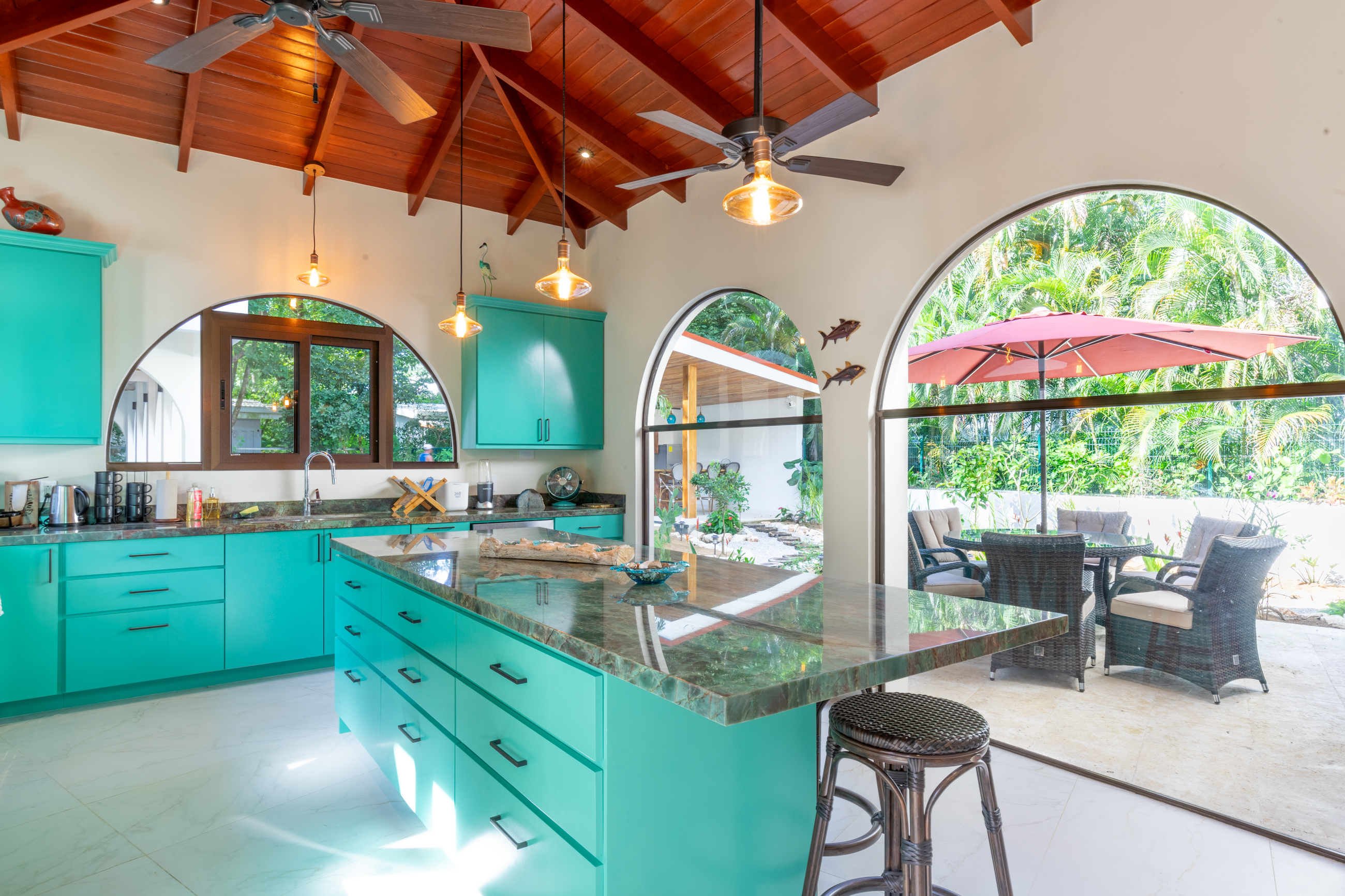 The main house boasts an open-concept living space with vibrant turquoise cabinetry and high vaulted wooden ceilings, creating a warm and inviting atmosphere. Large arched windows frame the lush garden, seamlessly blending indoor and outdoor living.