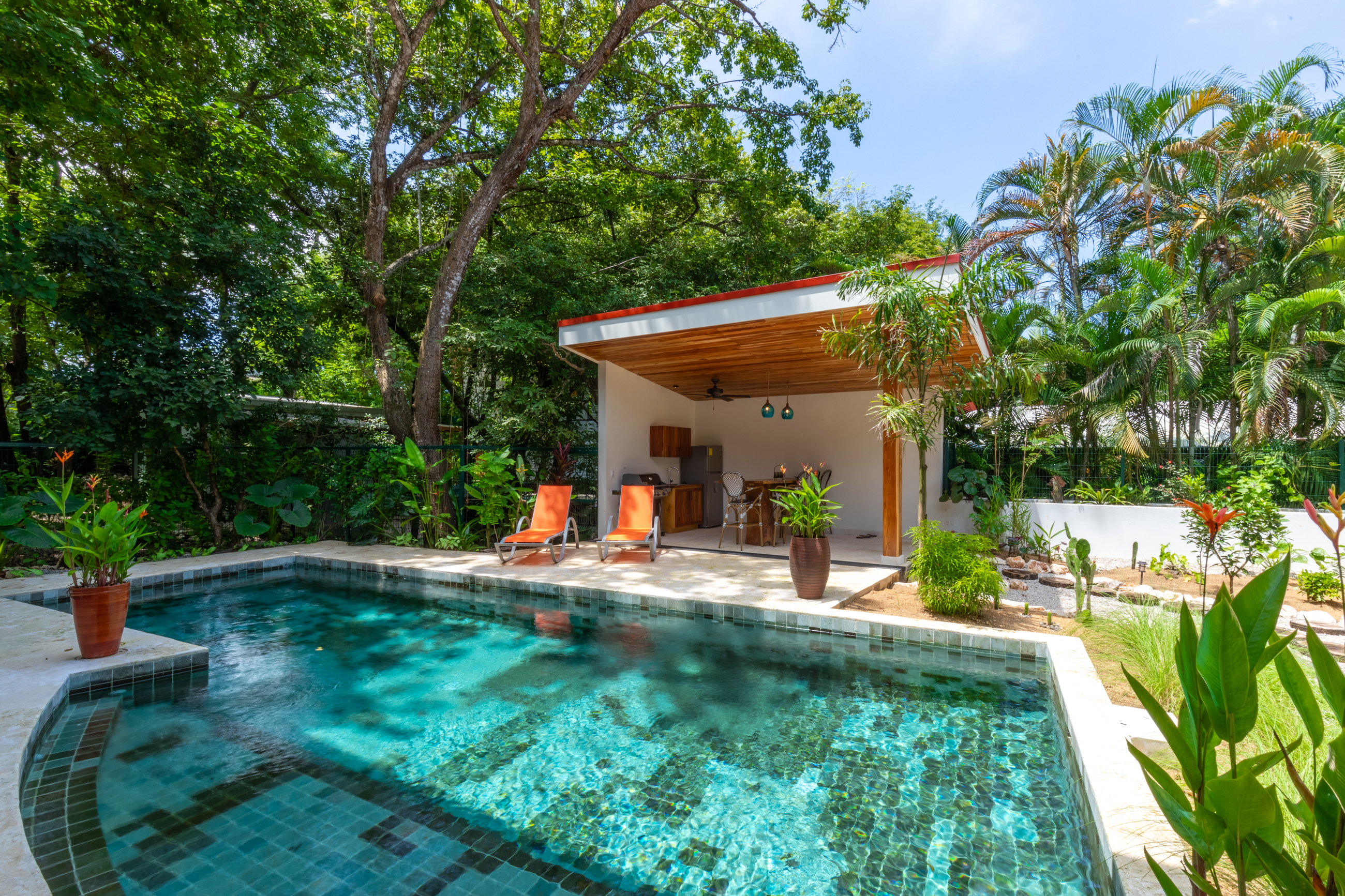 Relax by your private 10 meters long, salt water pool, surrounded by tropical greenery, and dancing humming birds and butterflies. The outdoor BBQ area offers the perfect space to cook delicious meals by the pool and gather with your friends and family.