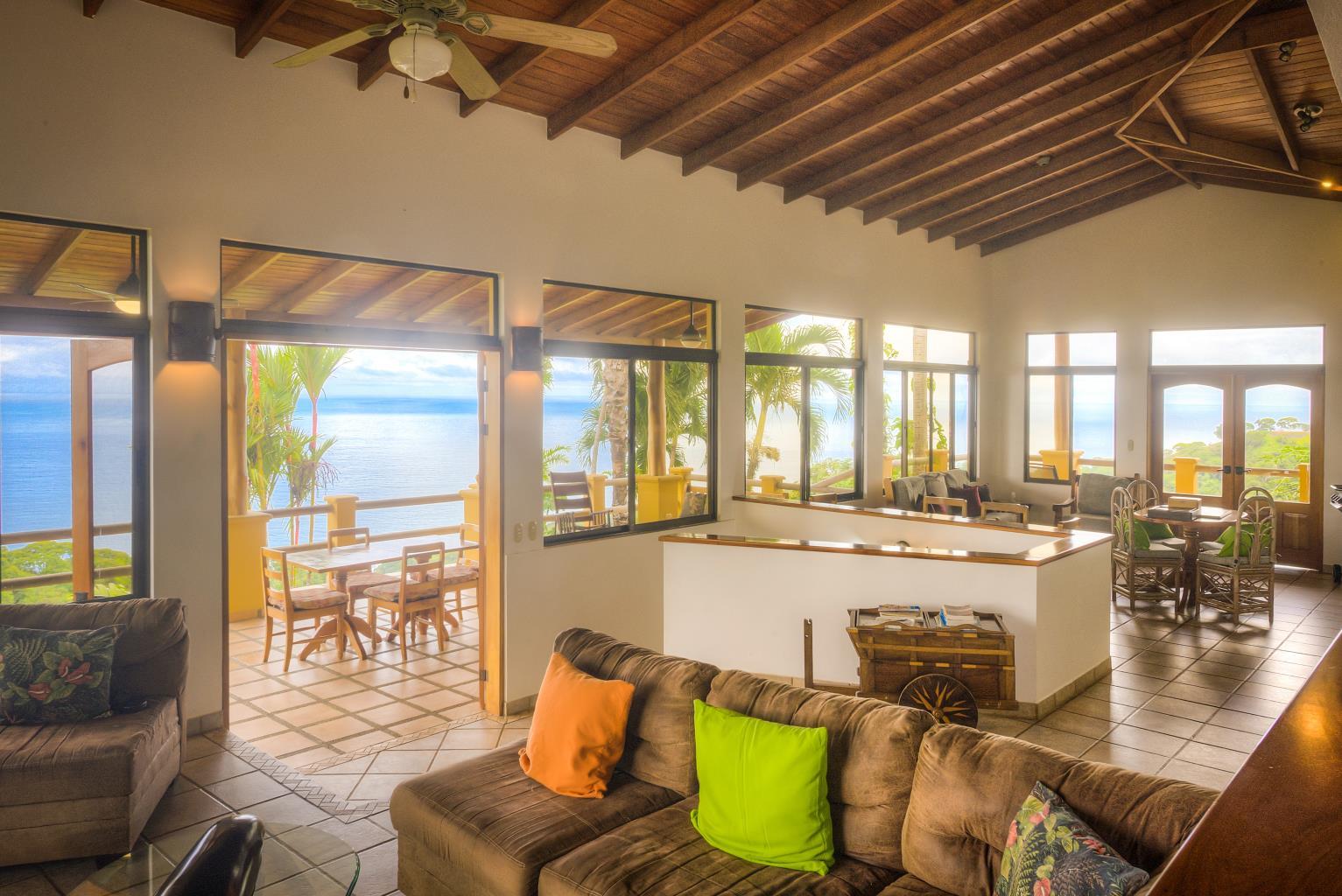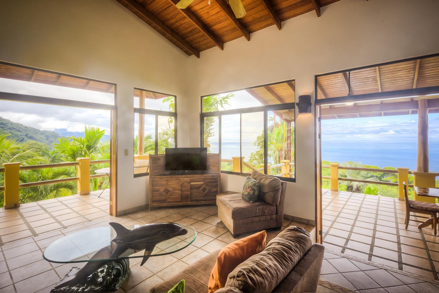 Villa Casi el Cielo is truly almost heaven! Nestled in exotic tropical gardens in the jungle-clad hills overlooking the famous Whale’s Tail, this 4 bedroom villa with an additional guesthouse of 2 bedroom on the property offers all of the comforts of home but with ocean views that rival none in the Southern Pacific Coast. Enjoy a cup of the famous Costa Rican coffee with the visiting toucans, cool off in the private infinity pool, or enjoy a spectacular sunset over the ocean with your favorite tropical drink.