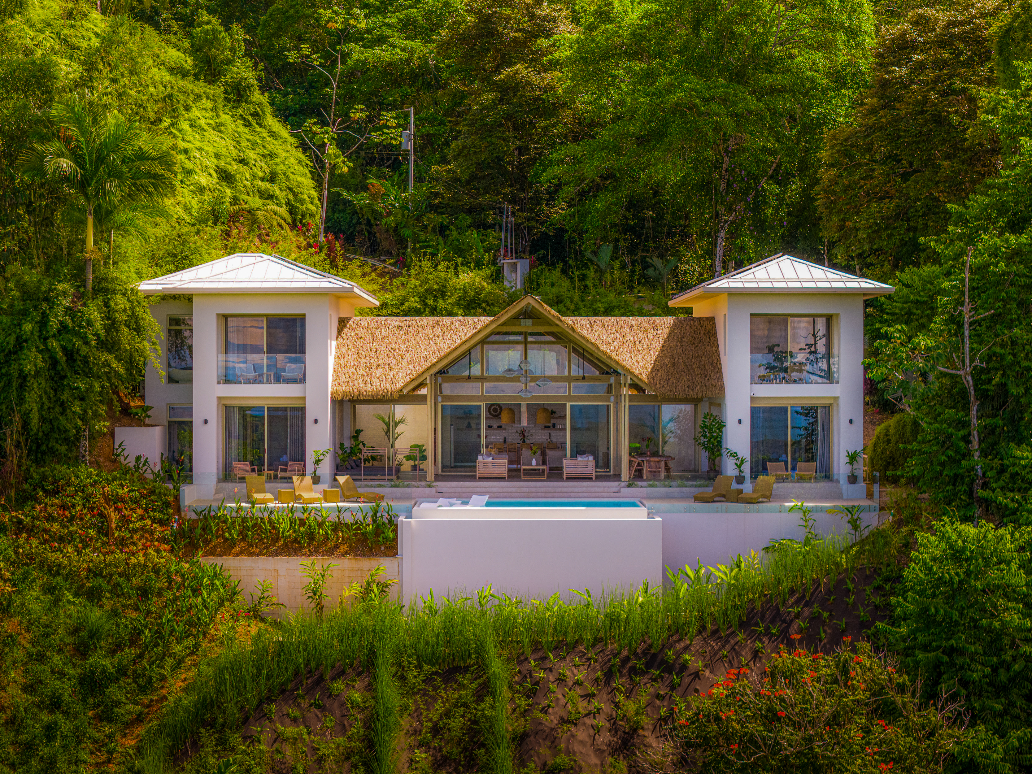 The principal residence is a four bedroom luxury home built by one of Costa Rica’s most trusted national builders. The owner and architect shaped the design with a clear goal: to bring the landscape into every moment of daily life. The main living room rises to a vaulted ceiling that reaches roughly twenty seven feet, which amplifies the light, the air, and the sense of space. High ceilings, clean lines, and wide openings are all placed to draw your eye toward the Pacific or into the canopy where monkeys, toucans, and butterflies move from branch to branch. The flow between inside and outside is effortless, and the quality of the craftsmanship is evident in every finish and detail.