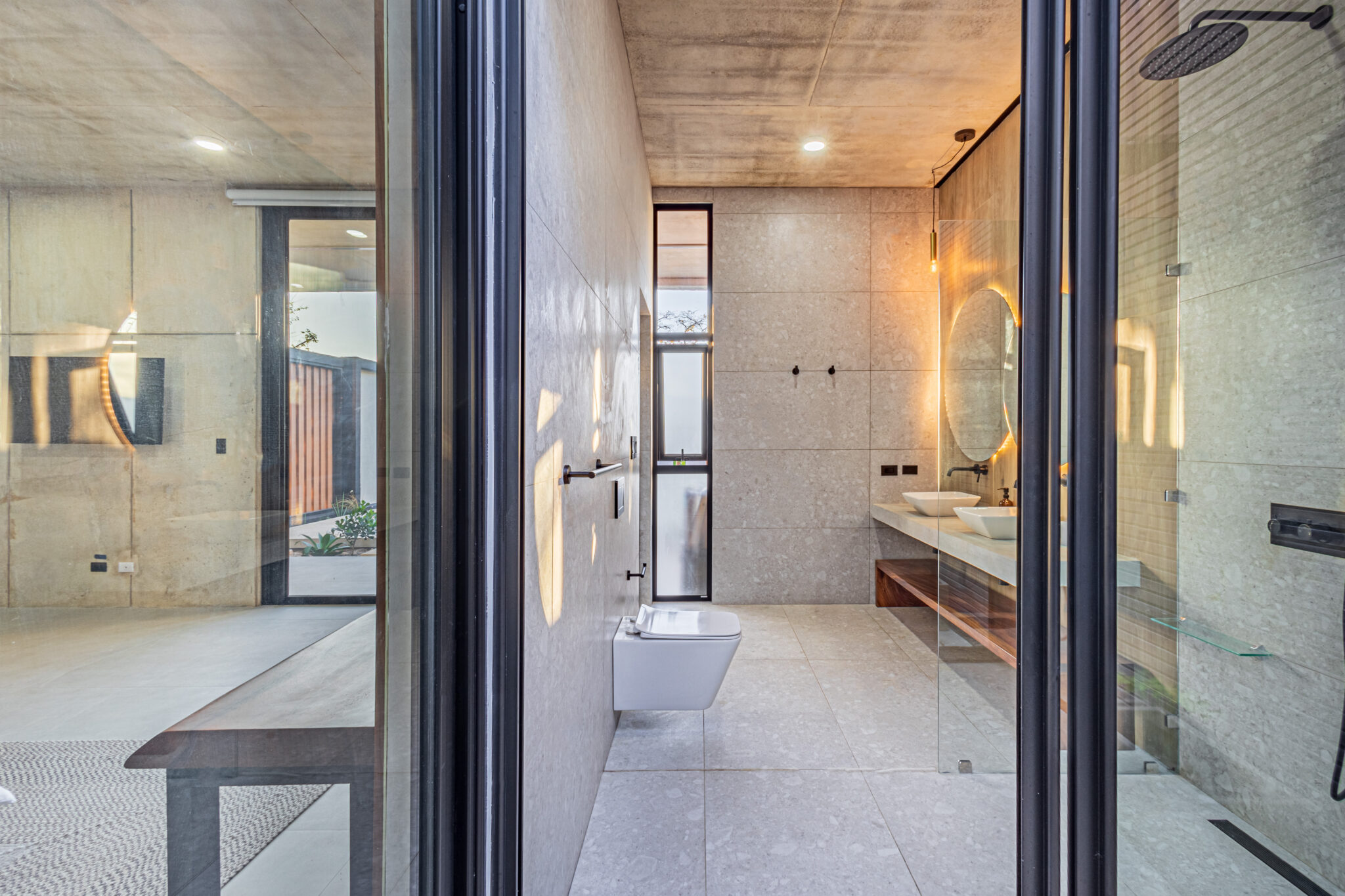 High-end finishes include polished concrete floors, black marble countertops in the kitchen and bathrooms, and warm teak wood accents that balance contemporary elegance with natural textures. Additional features include electric blinds, Italian furniture imported from EuroMobilia, concrete slab walls, and durable WPC wood composite elements.