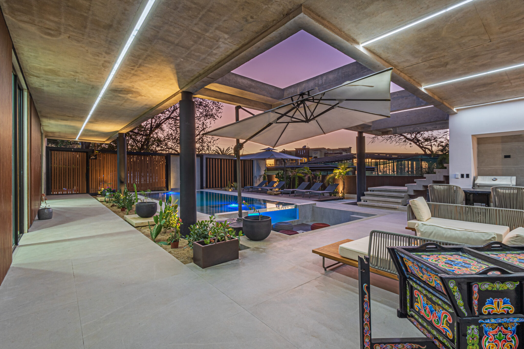The centerpiece of the home is a large resort-style swimming pool, surrounded by an expansive patio that integrates effortlessly with the main living spaces—ideal for entertaining or quiet relaxation. Floor-to-ceiling windows throughout enhance the sense of openness while framing lush tropical surroundings.