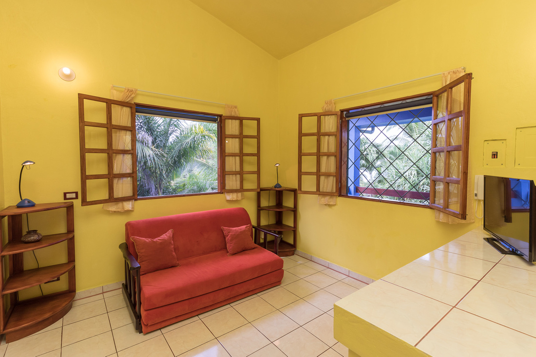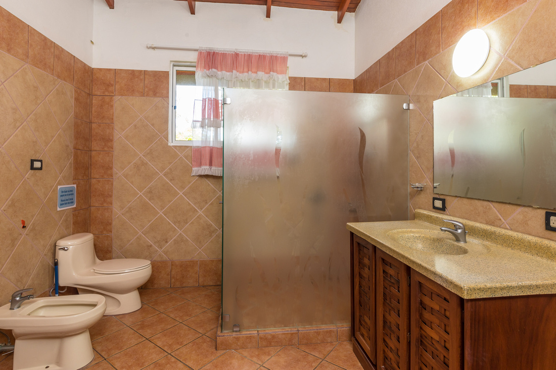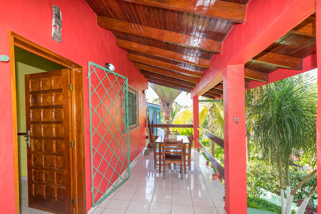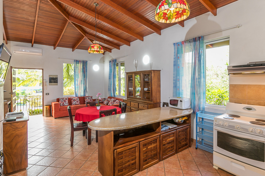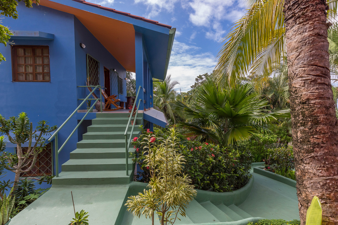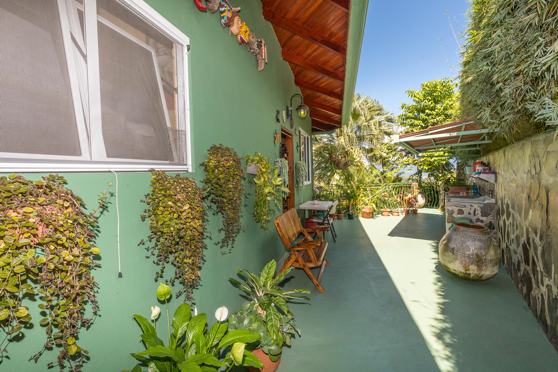 The first building has 2 bedrooms, 1 bath, a large L-shaped open concept living/dining/kitchen that opens onto a very comfortable porch kept comfortable with the shade of the lovely tropical trees. High ceilings made of wood help to dispel the heat, in the traditional style of Costa Rican homes. The bathroom is ample and well-appointed. As a bonus, there is ample storage and half bathroom situated adjacent to the apartment with access via the porch that could easily be transformed into an additional studio apartment.