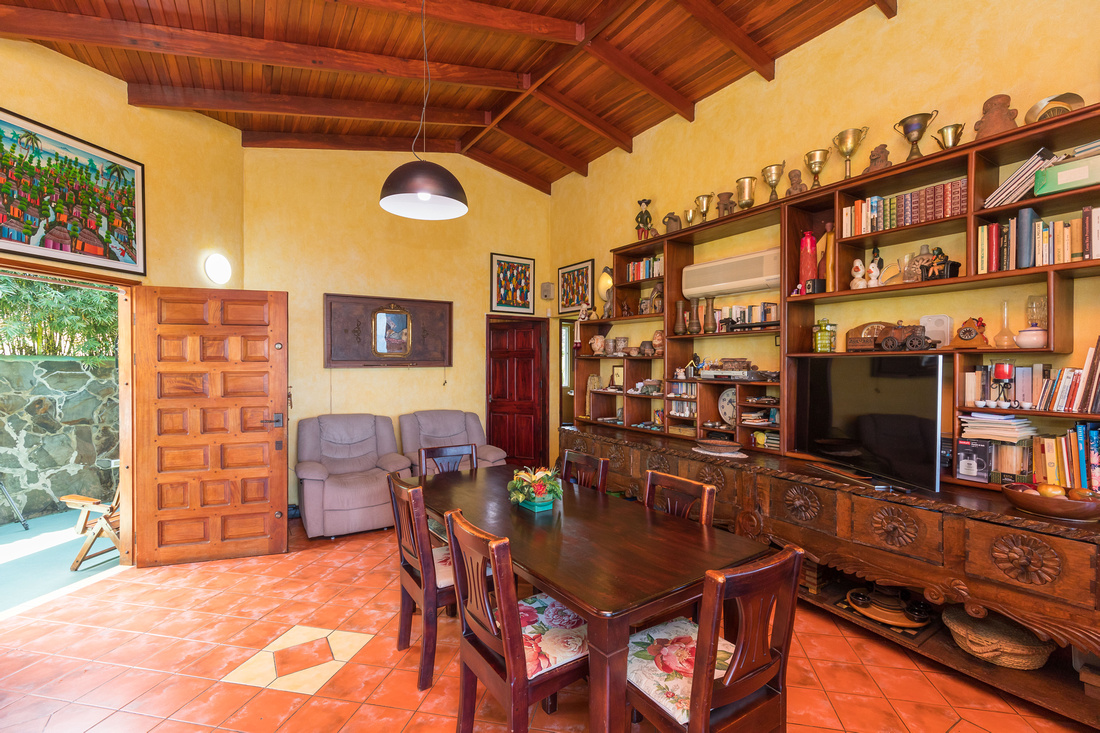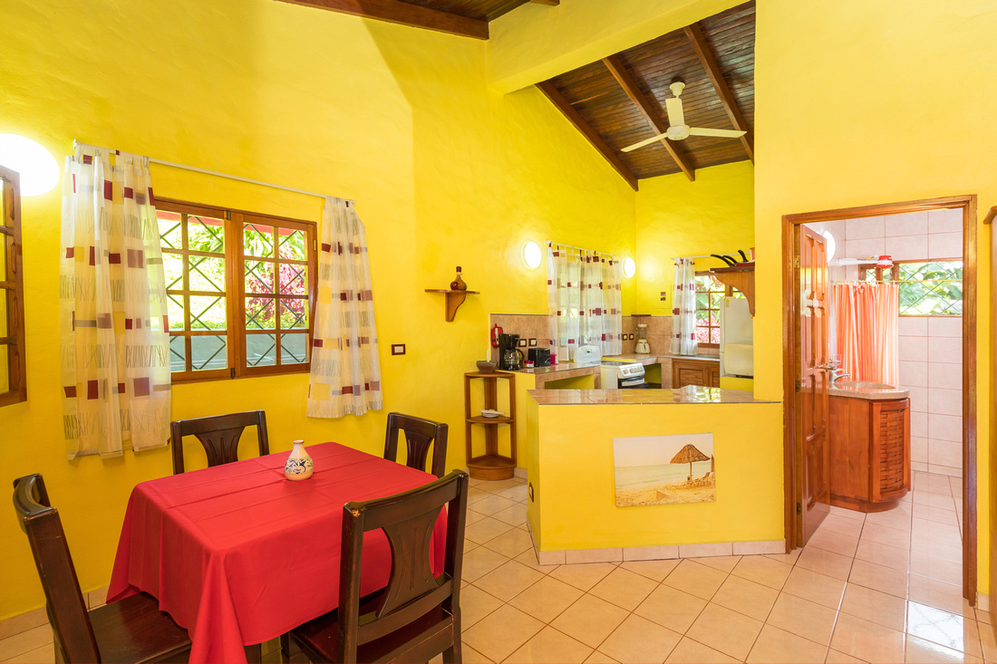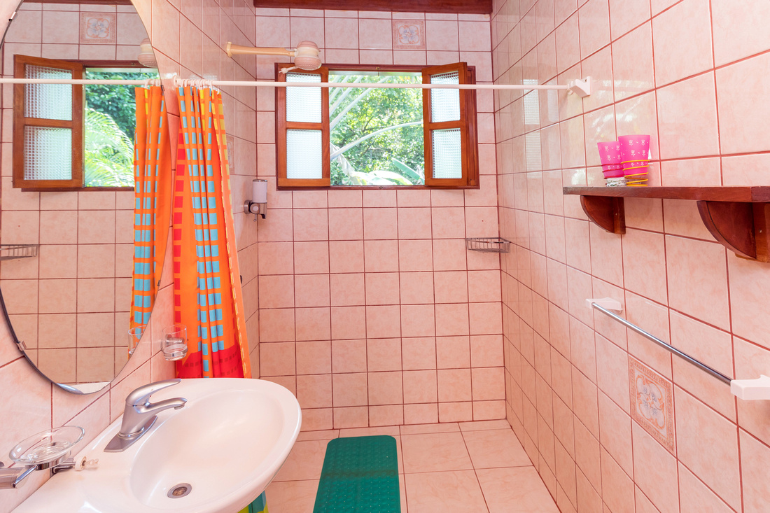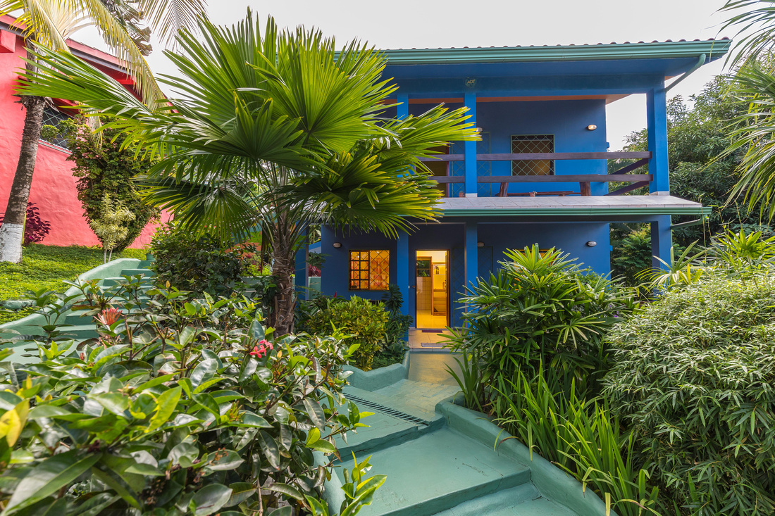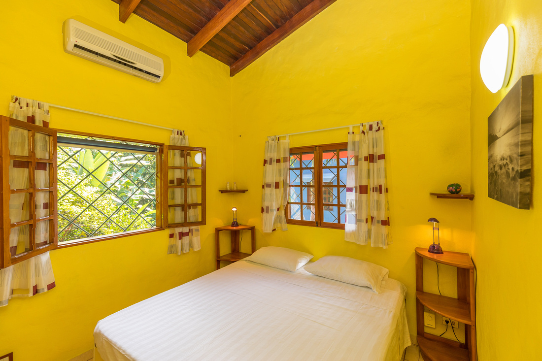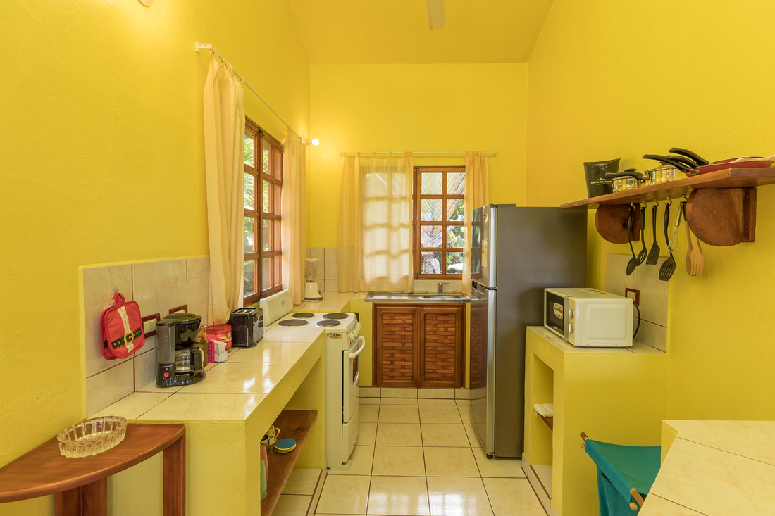 The first building has 2 bedrooms, 1 bath, a large L-shaped open concept living/dining/kitchen that opens onto a very comfortable porch kept comfortable with the shade of the lovely tropical trees. High ceilings made of wood help to dispel the heat, in the traditional style of Costa Rican homes. The bathroom is ample and well-appointed. As a bonus, there is ample storage and half bathroom situated adjacent to the apartment with access via the porch that could easily be transformed into an additional studio apartment.