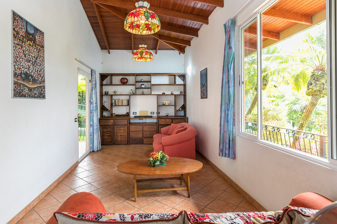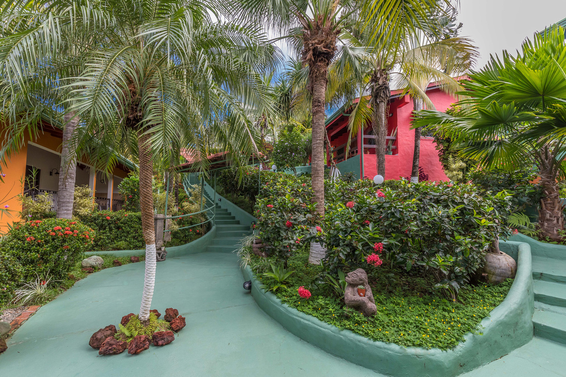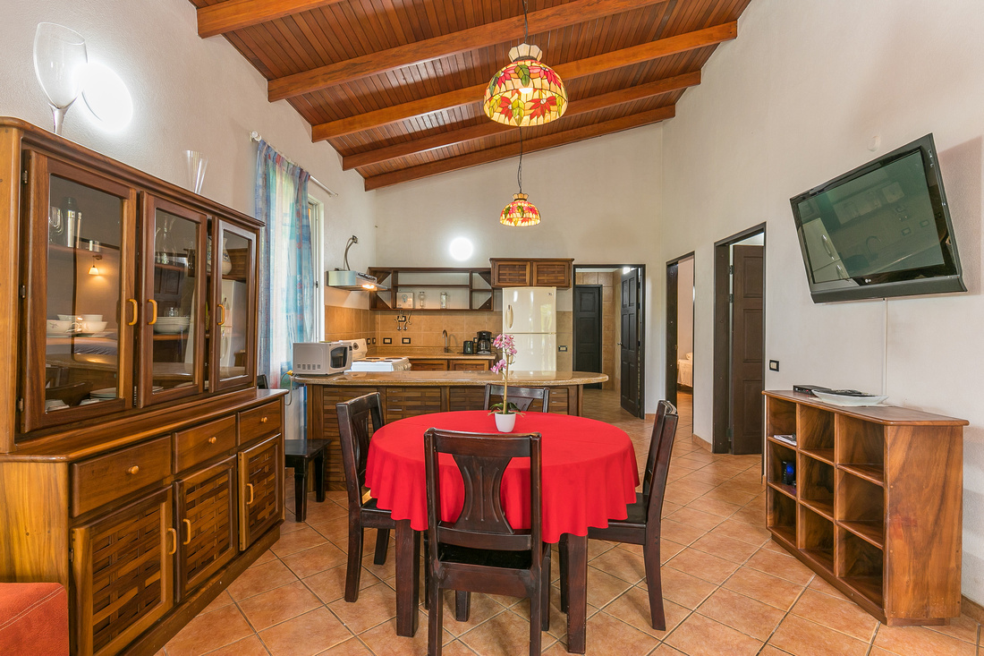 As you progress up a gentle incline you encounter first a two-story building and then another one-story building housing three identical 1 bedroom self-sufficient suites. Each also has a sofa bed thus being able to accommodate a small family. Impeccably maintained and well-appointed all with high ceilings for natural cooling, these apartments want for nothing.