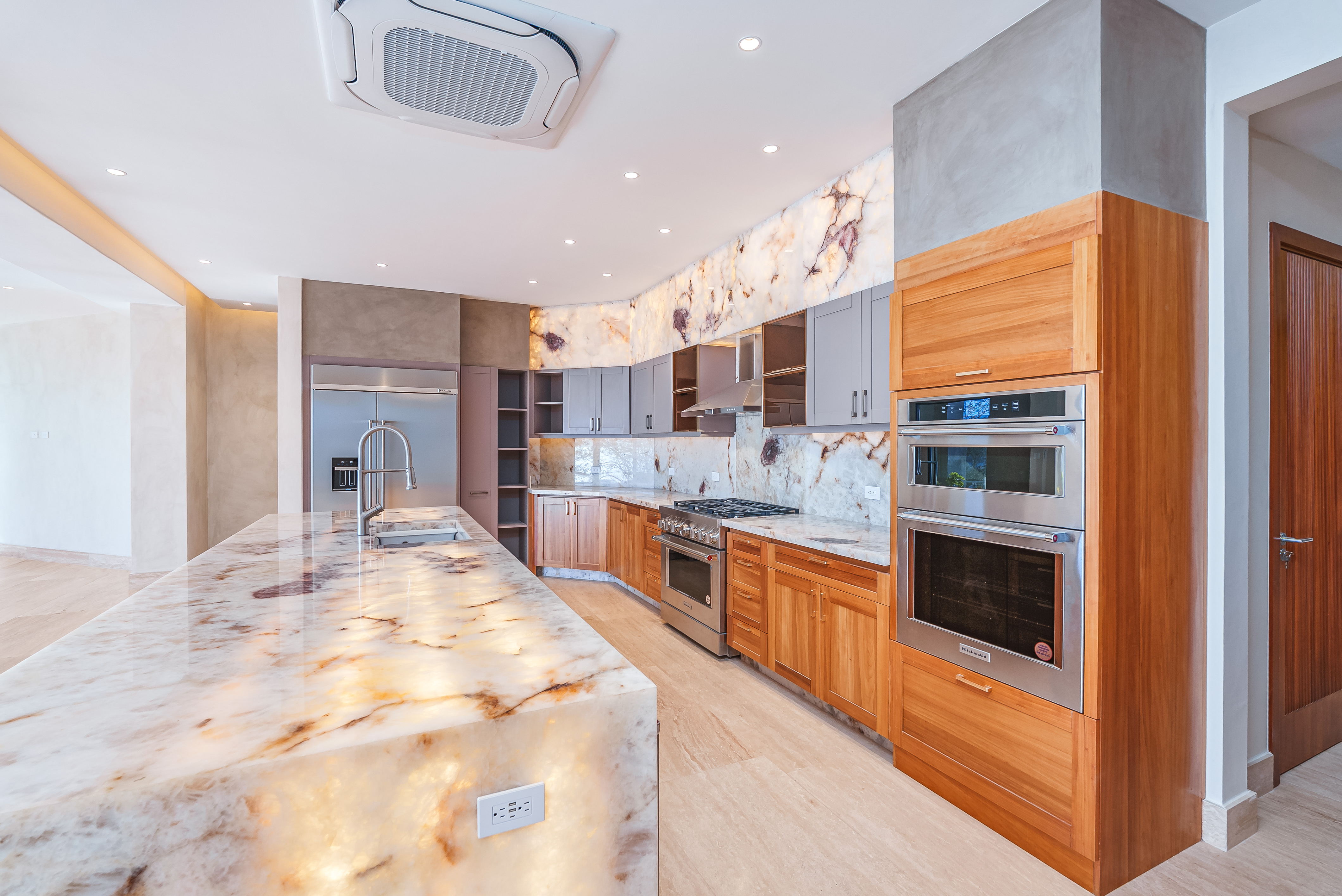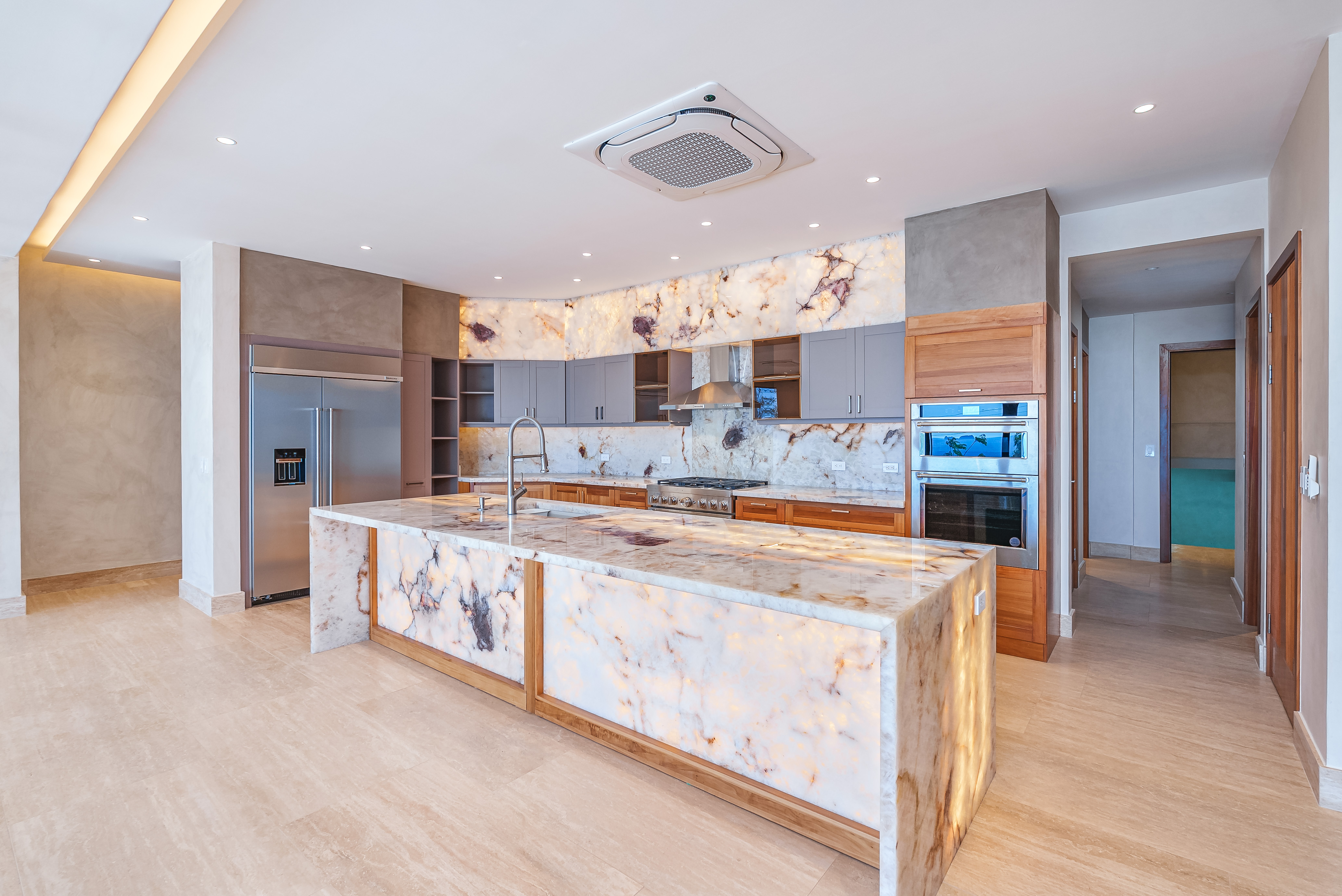 The materials used at El Palacete are exemplary of true luxury builds, without substitution, and no expense was spared. Attractive quartzite was imported from Brazil for backsplashes and counters; the Crystal Mundi slab, used for the kitchen countertop, is transparent, and lighting installed in the counter creates a dazzling spectacle at the center of the home.