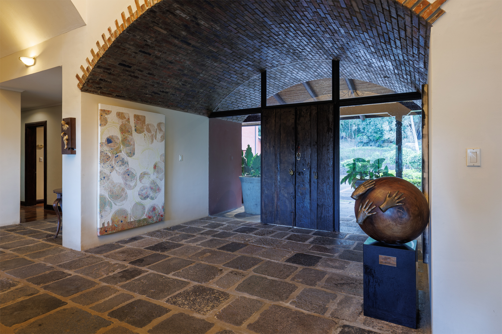 The architectural design pays homage to timeless Spanish colonial tradition, featuring terracotta roof tiles, vaulted ceilings, and artisan-crafted finishes throughout. Interiors flow effortlessly through a central courtyard and elegant hallways finished with stone, wood, and ironwork, each space revealing meticulous craftsmanship. The villa's main living areas are bright and open, framed by floor to ceiling windows and doors that invite nature inward. Wide corridors and gallery-style walls serve as the perfect canvas for a curated art collection, while warm hardwood floors and exposed beams create an atmosphere of elegance and comfort.