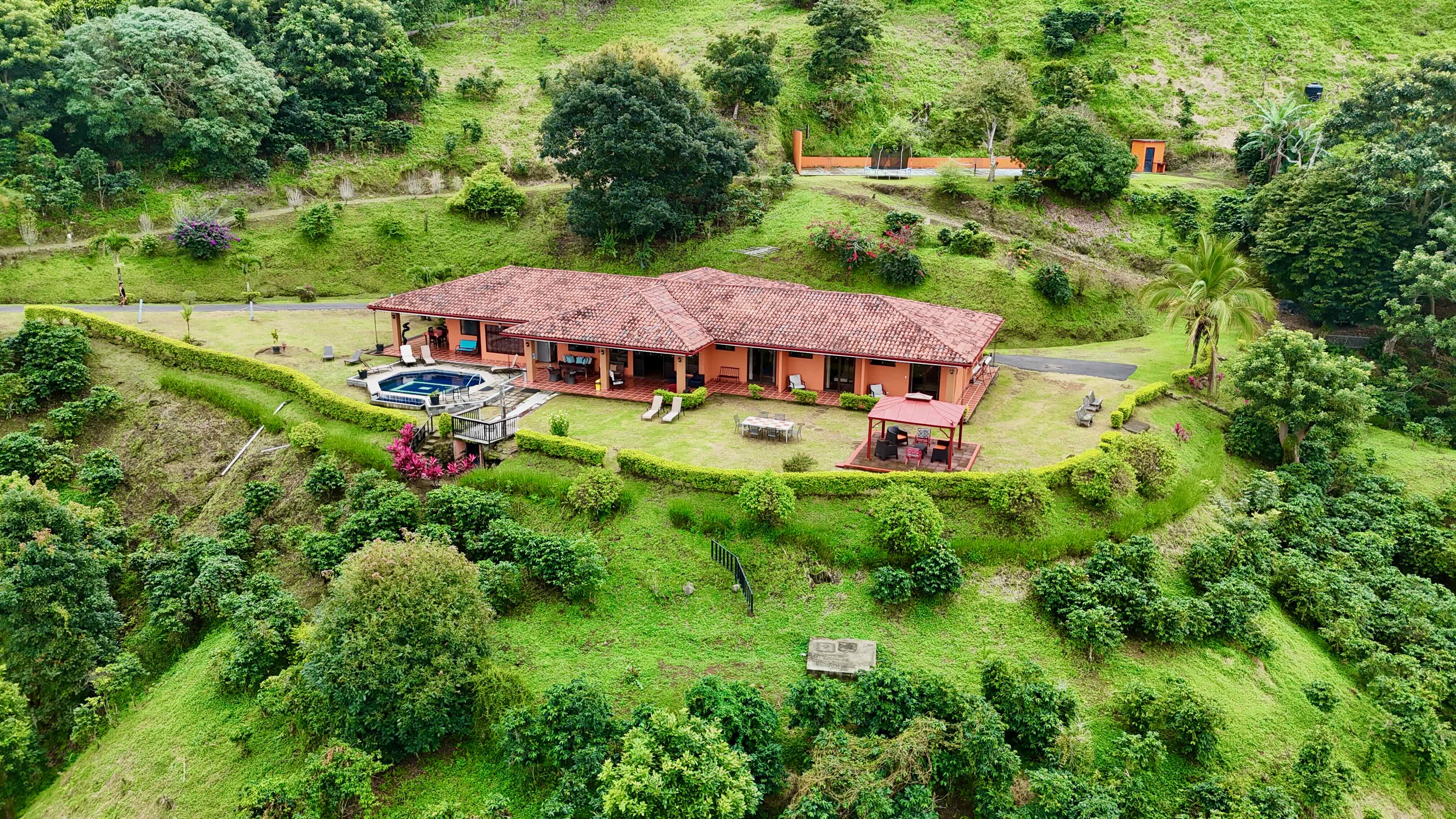 This exceptional property in Barroeta, just 7 km from downtown Atenas, offers the perfect blend of luxury, space, and recreation. Surrounded by lush nature, it features two fully equipped homes with high ceilings and abundant natural light, creating an airy, welcoming atmosphere.