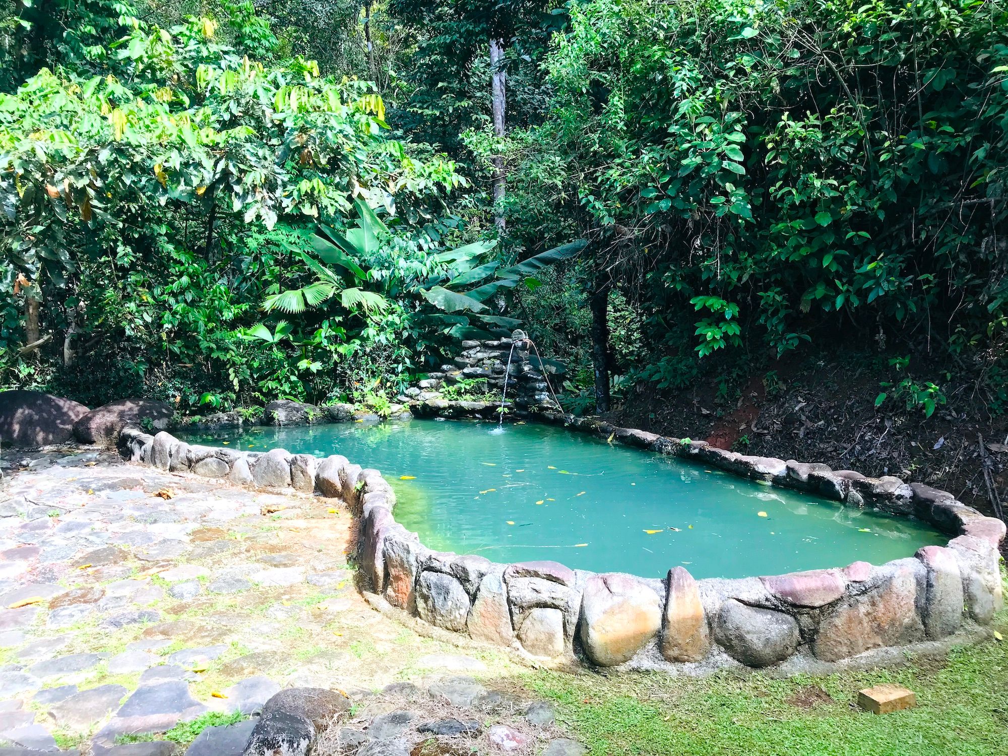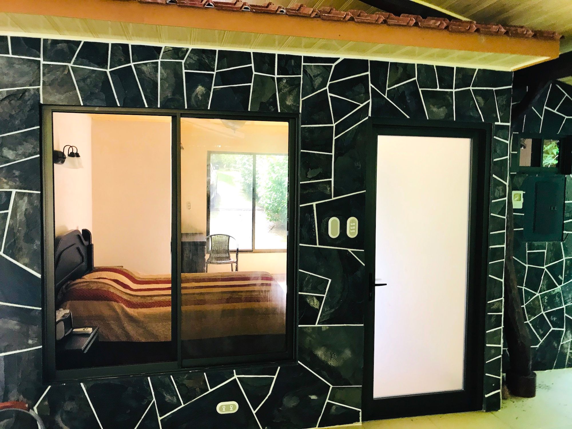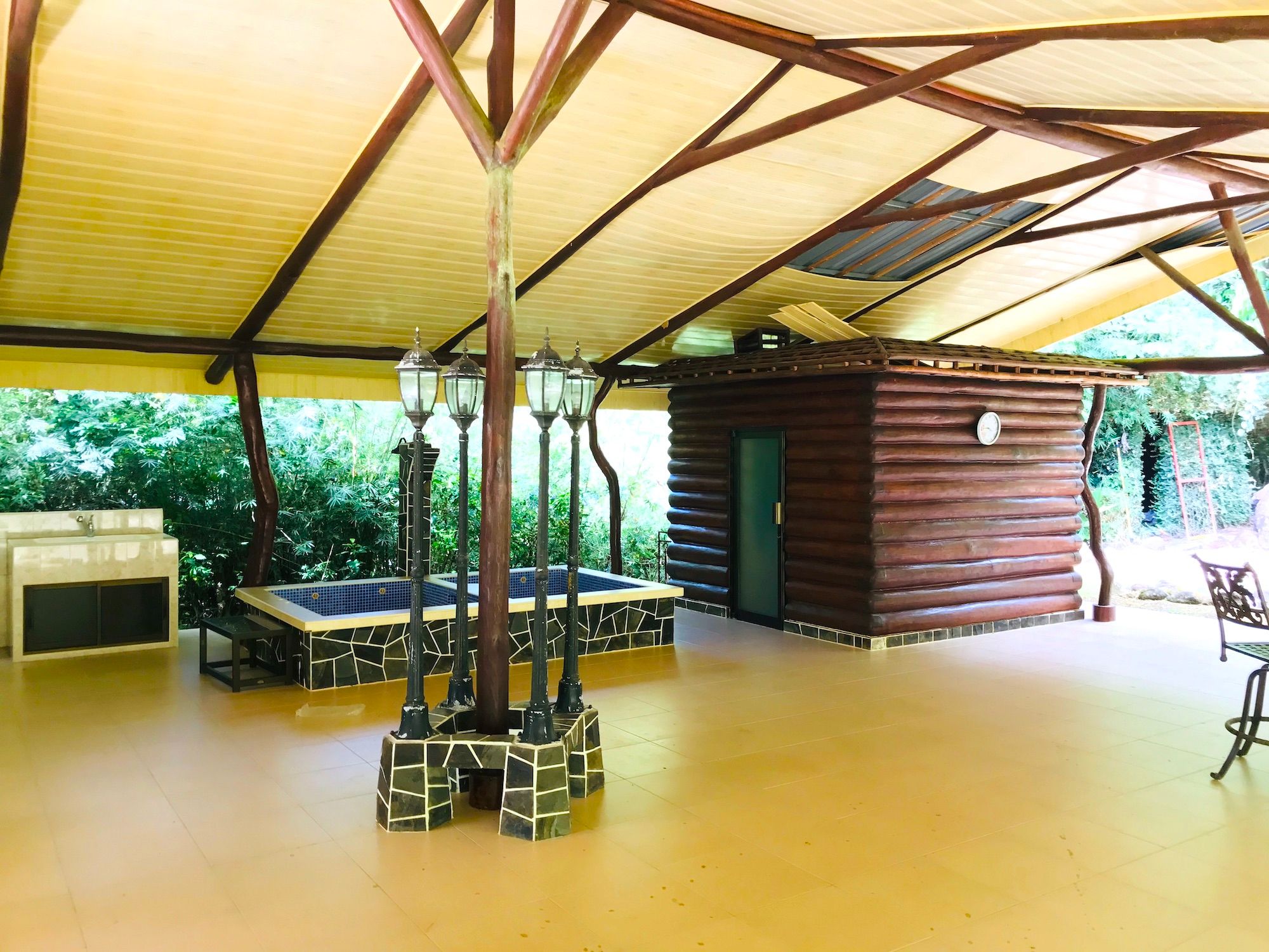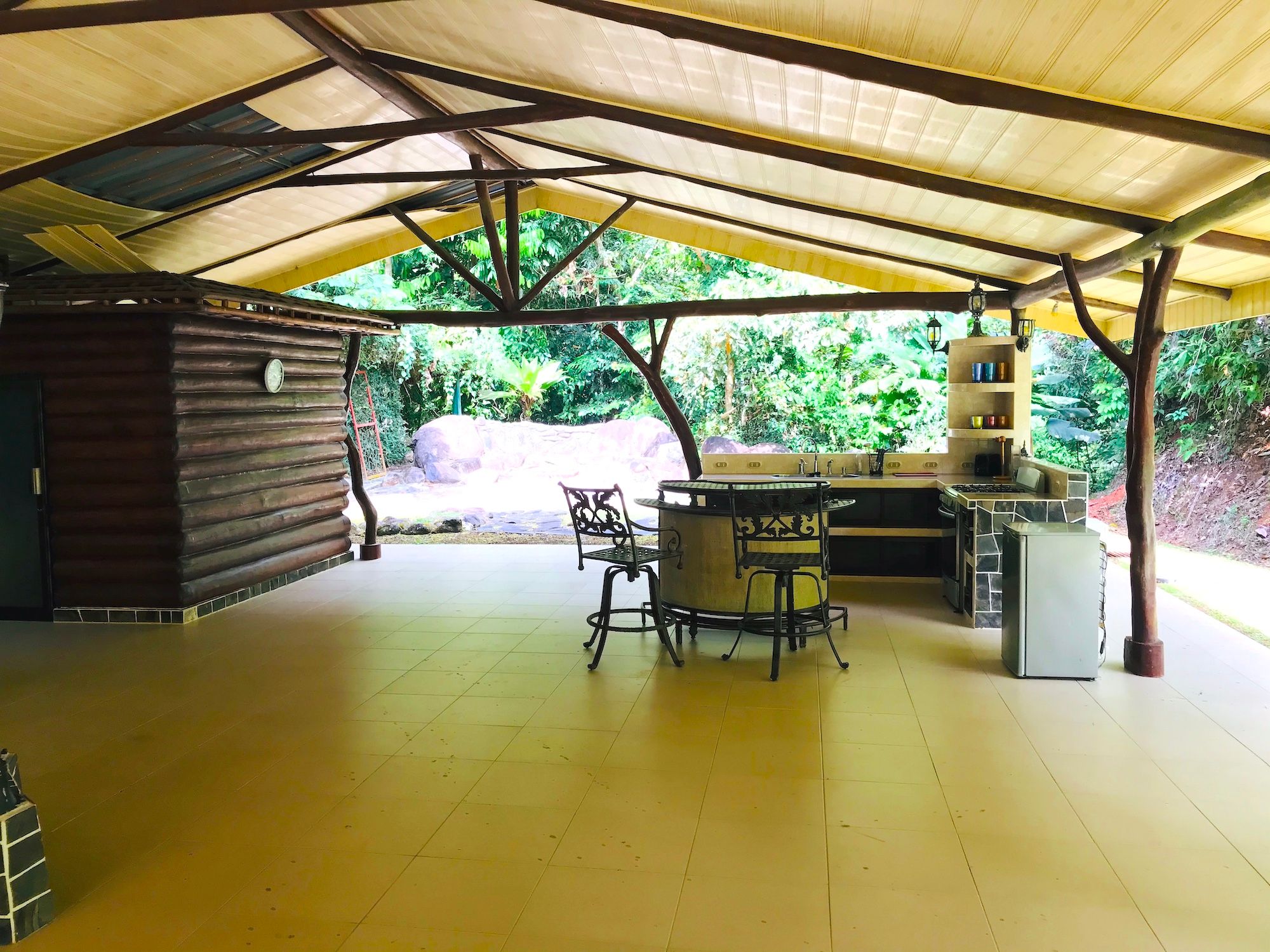 Guest Bungalow, Tilapia Pond, and Waterfall On the lower portion of the property you will find an open-air guest bungalow with two closed-off bedrooms; each with on-suite full bathrooms. An outdoor kitchen is a great place to BBQ some fresh fish from the rock and boulder-made natural-looking pond stocked with Tilapia. There is also a sauna plus hot and cold tubs for your own private spa experience. A short trail leads to the bordering creek with a 10-12 foot waterfall.