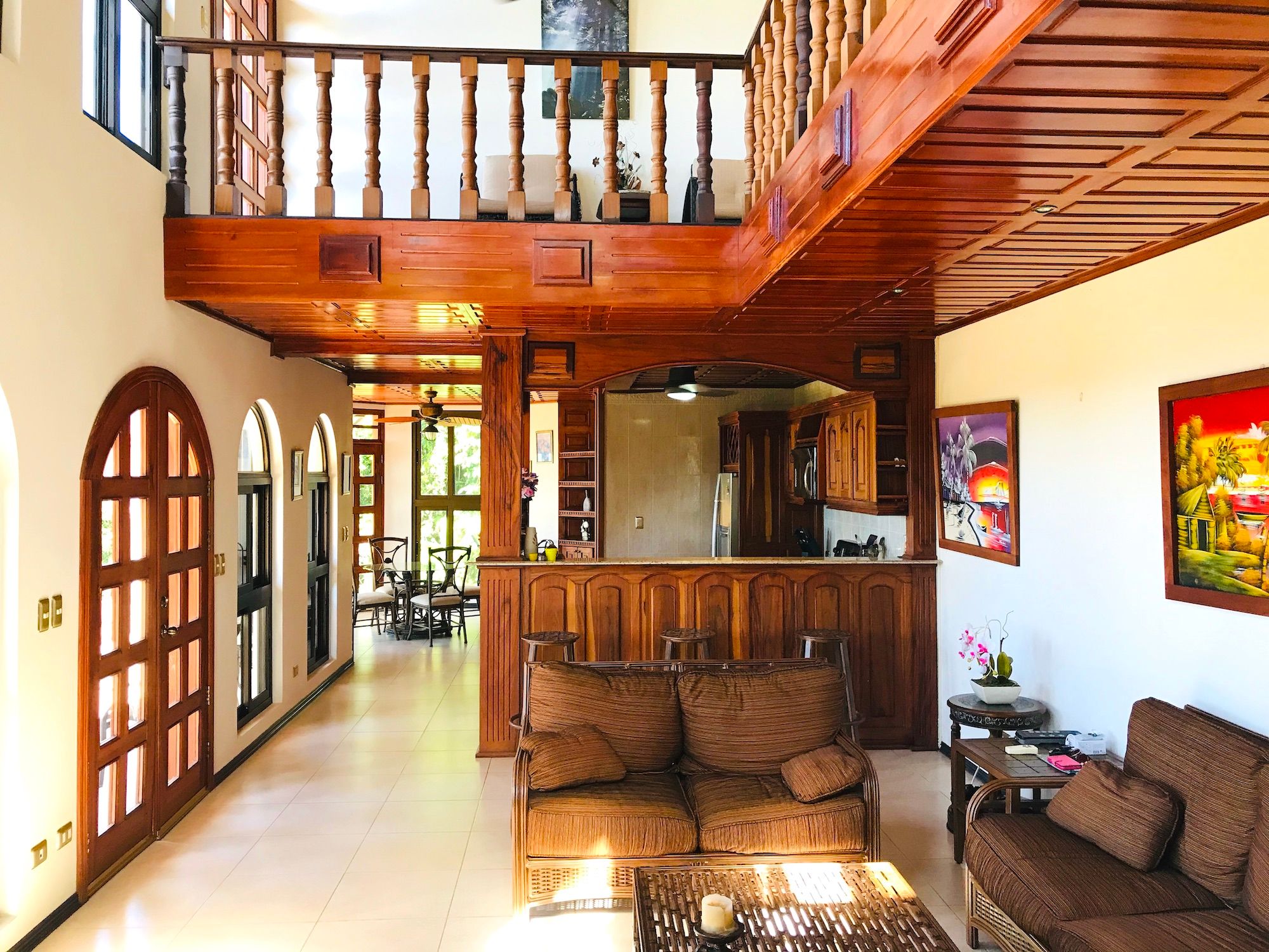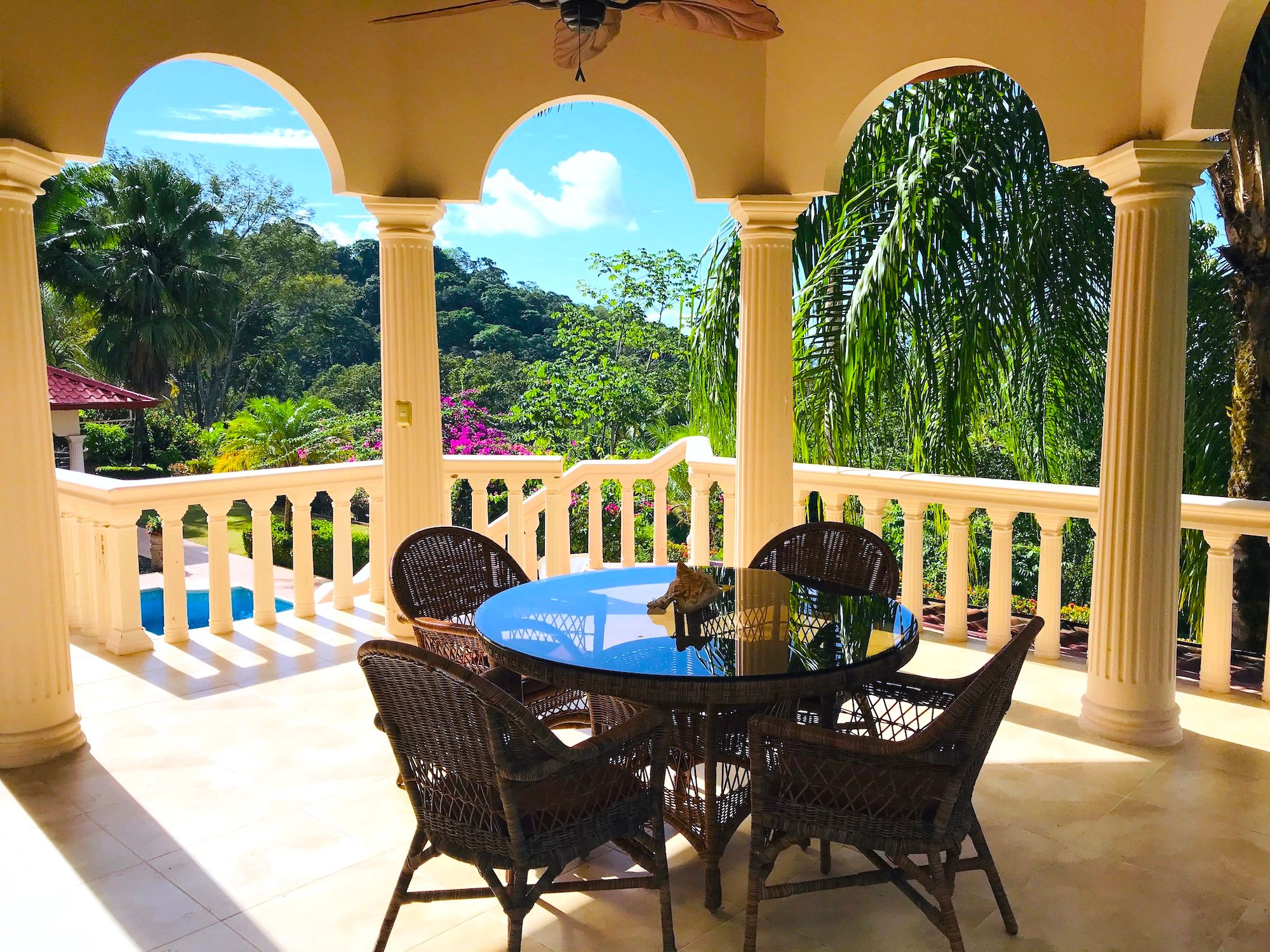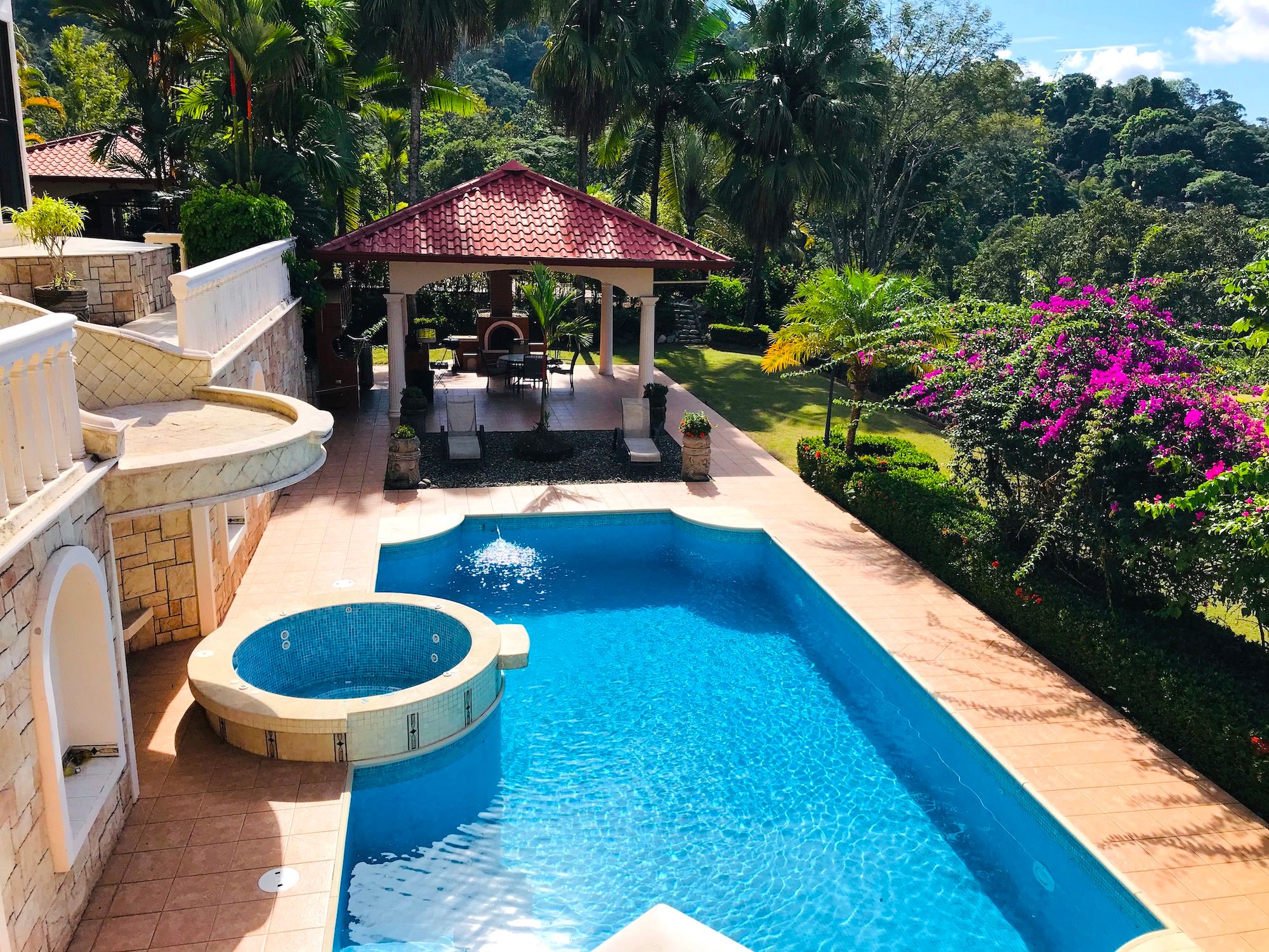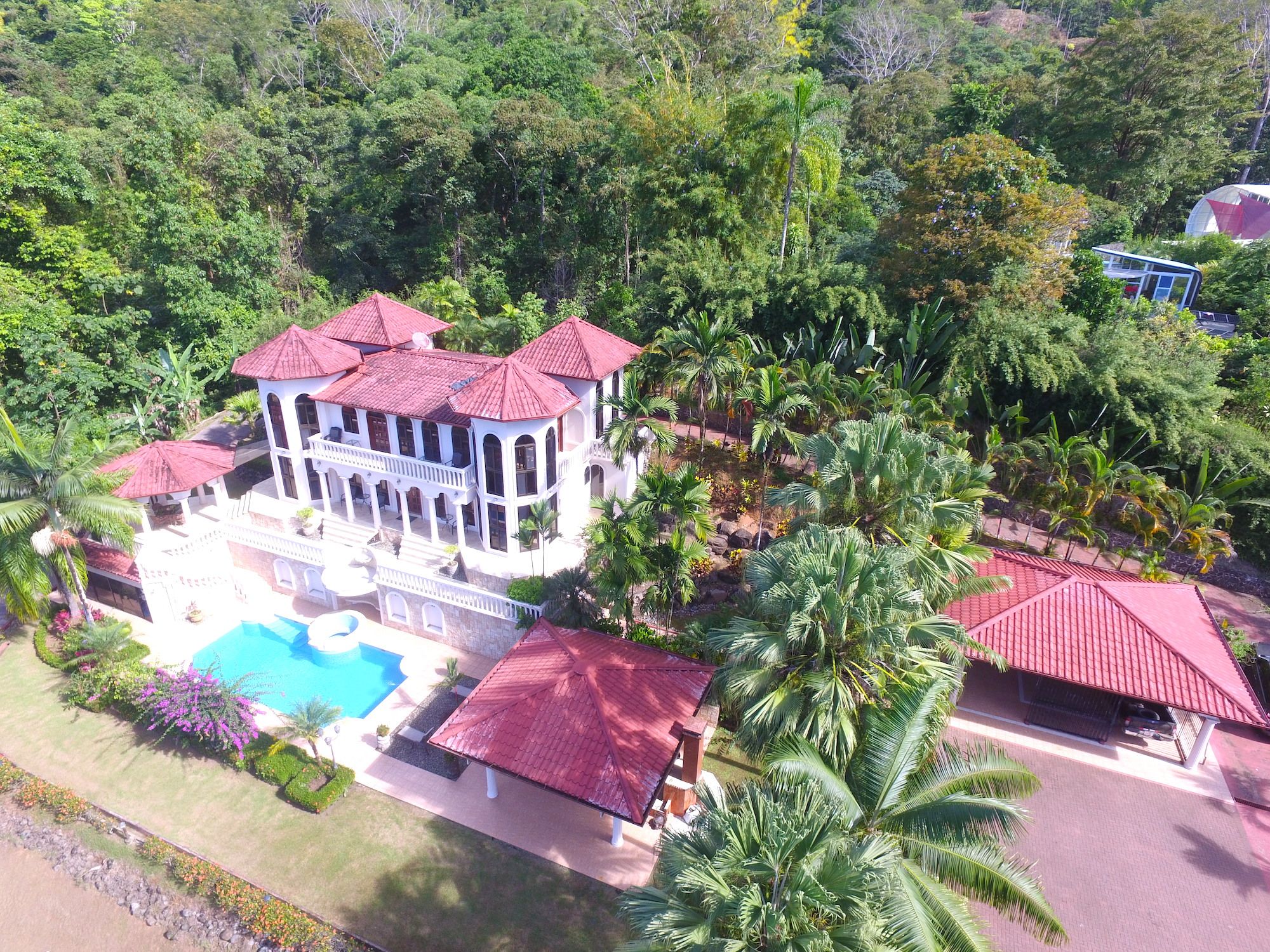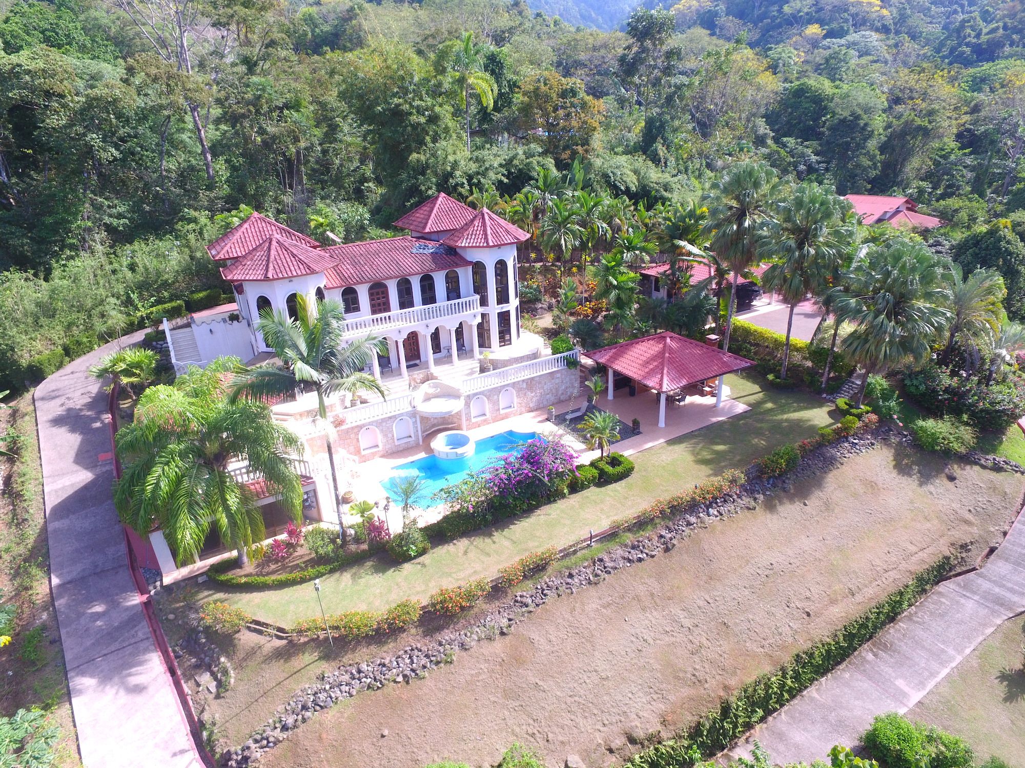 Main House and Pool The main house has fine finishes such as Cristobal wood (one of the best hardwoods in Costa Rica) kitchen cabinets and paneling in the kitchen, living room, and staircase. Also, Ron-Ron wood was used as well on the banisters (another sought-after hardwood). Downstairs in the kitchen and living room. Upstairs are the 3 bedrooms, 2 full baths, and an office, plus there is an entrance accessed by a concrete driveway that loops the entire home and property. The bathrooms feature marble counters and tiles from floor to ceiling. The pool is large and could even be used to swim laps. There is also a jacuzzi tub and waterfall feature, an outdoor rancho with fireplace, sink, and dining by the pool. Plus another outdoor covered veranda by the kitchen with ocean views and overlooking the pool area.