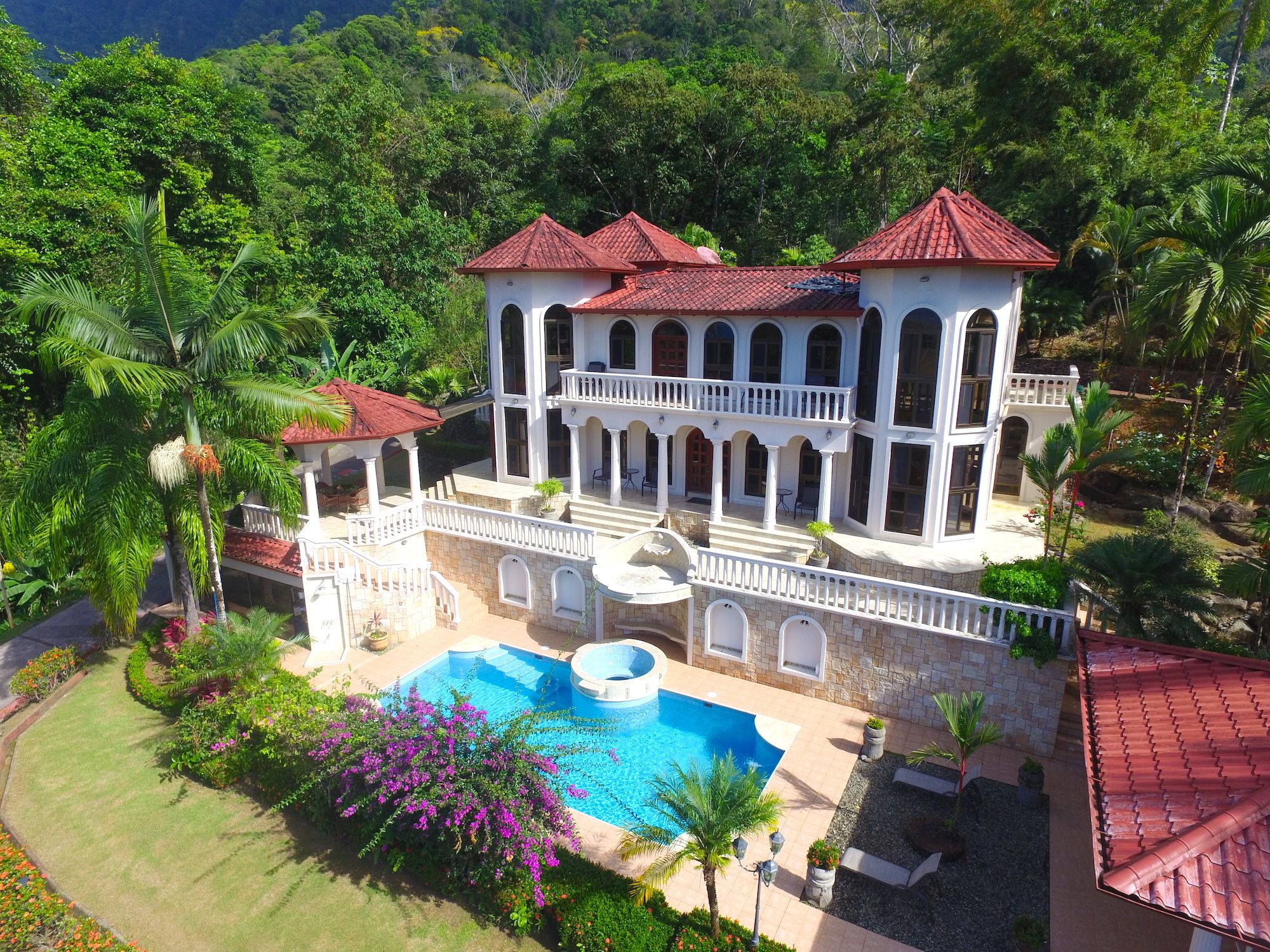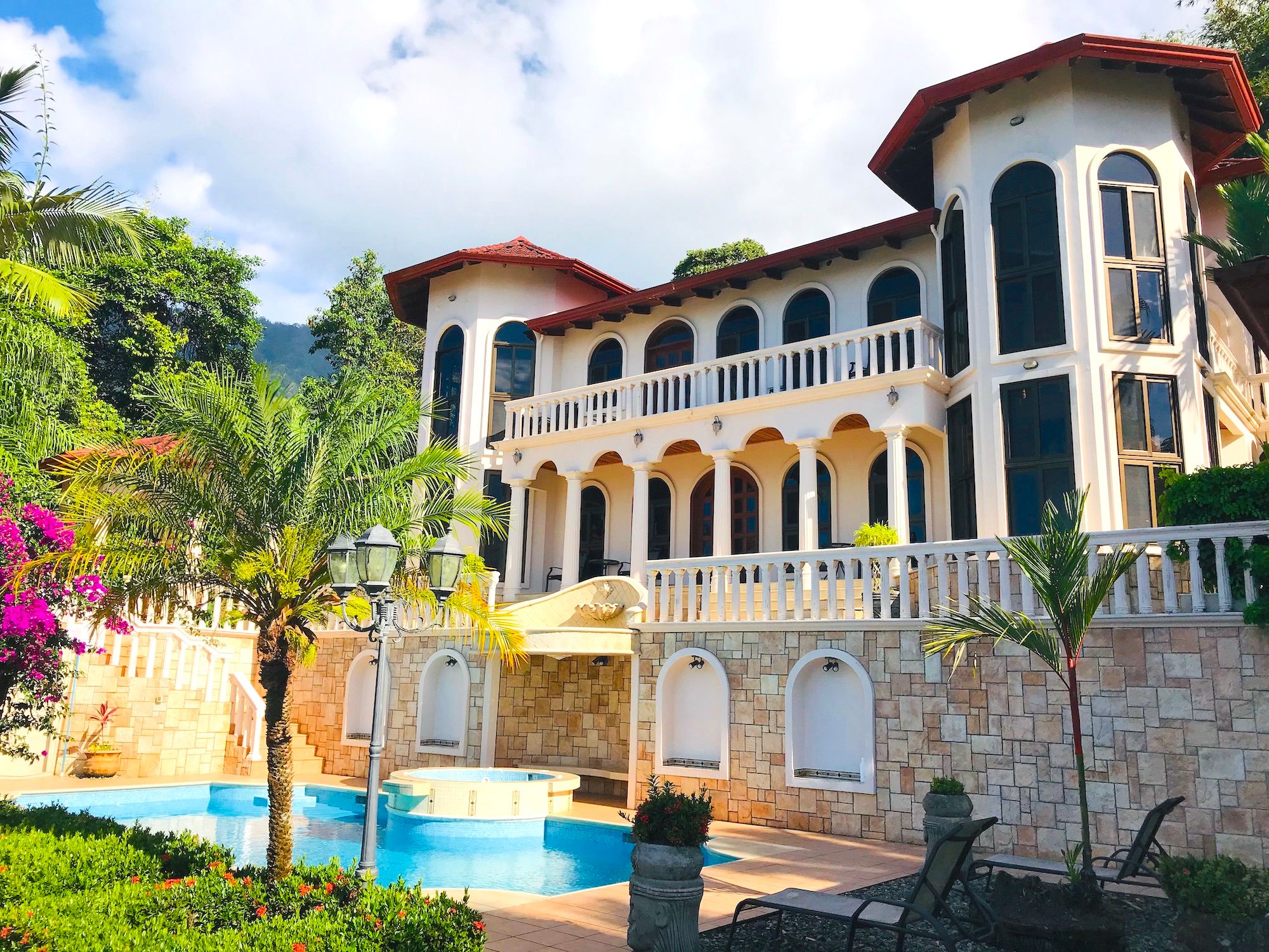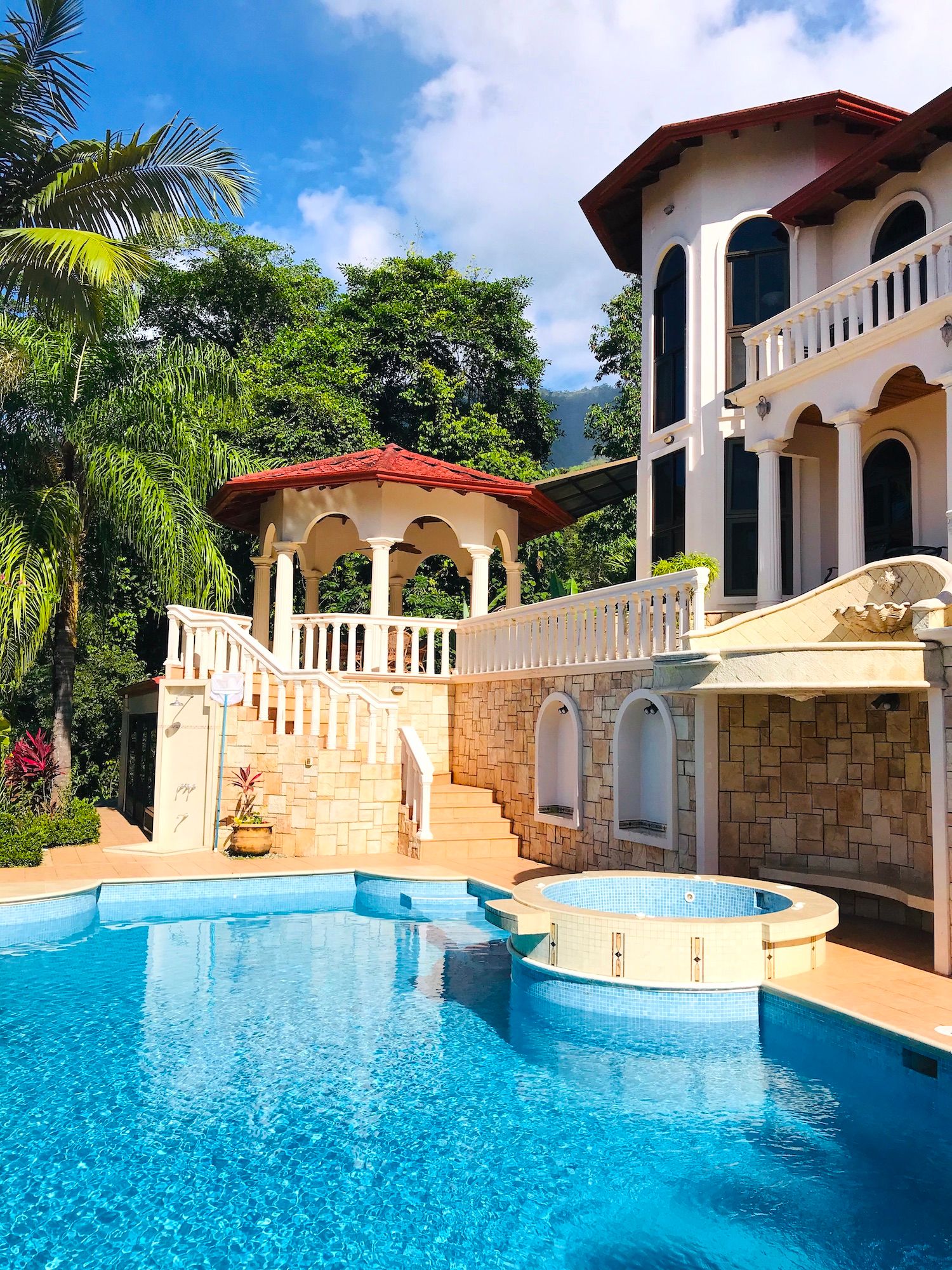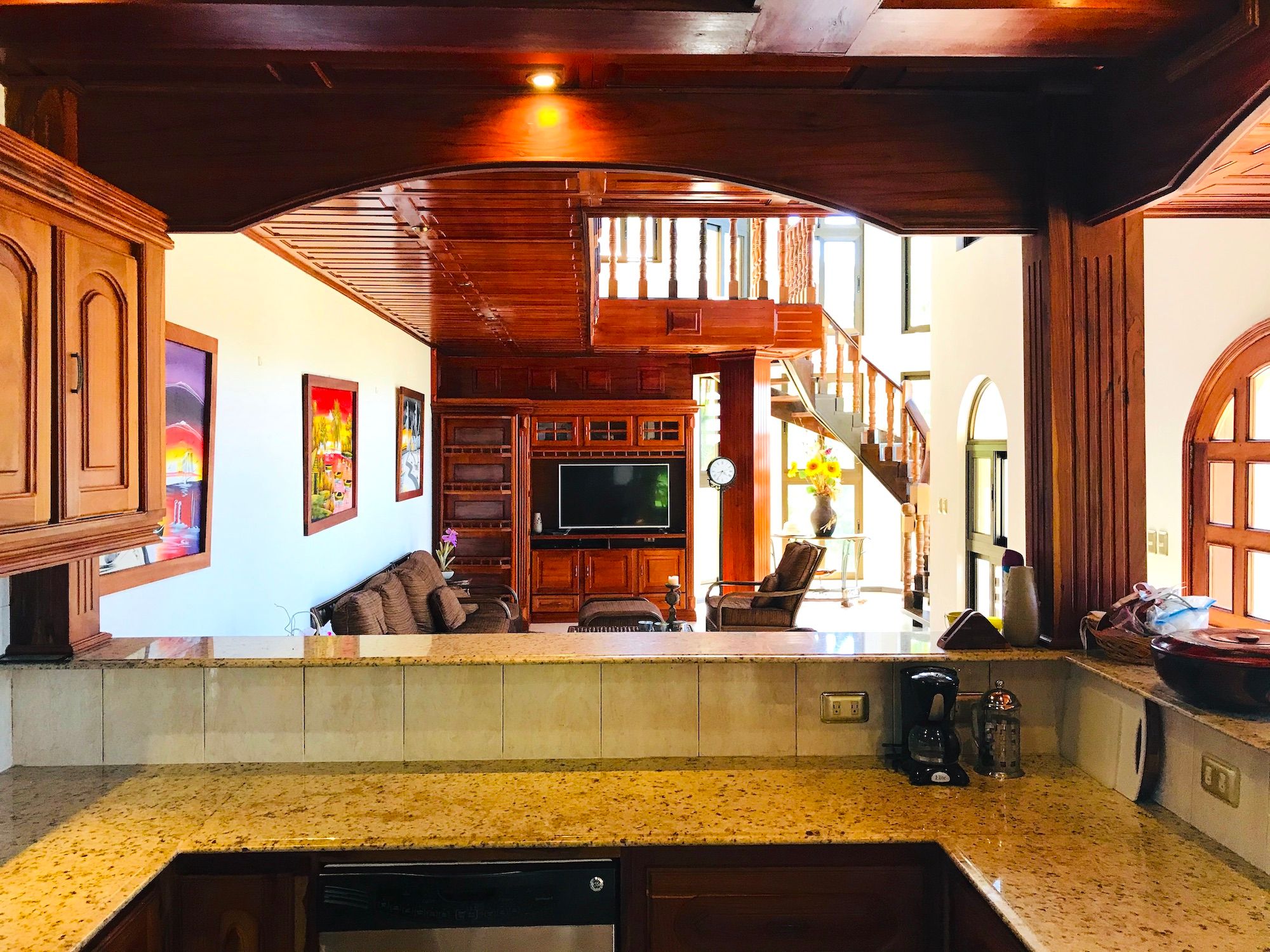 Main House and Pool The main house has fine finishes such as Cristobal wood (one of the best hardwoods in Costa Rica) kitchen cabinets and paneling in the kitchen, living room, and staircase. Also, Ron-Ron wood was used as well on the banisters (another sought-after hardwood). Downstairs in the kitchen and living room. Upstairs are the 3 bedrooms, 2 full baths, and an office, plus there is an entrance accessed by a concrete driveway that loops the entire home and property. The bathrooms feature marble counters and tiles from floor to ceiling. The pool is large and could even be used to swim laps. There is also a jacuzzi tub and waterfall feature, an outdoor rancho with fireplace, sink, and dining by the pool. Plus another outdoor covered veranda by the kitchen with ocean views and overlooking the pool area.