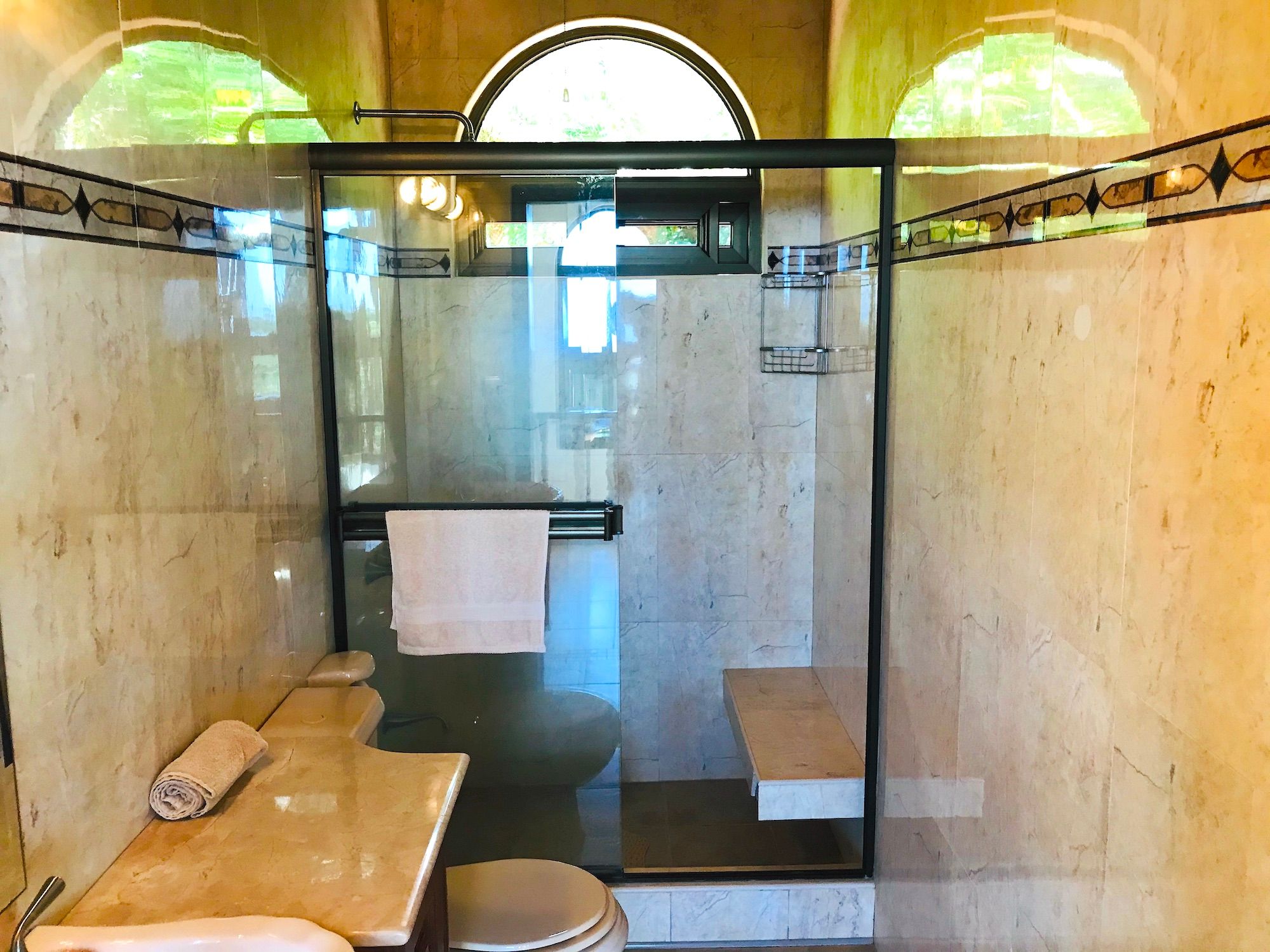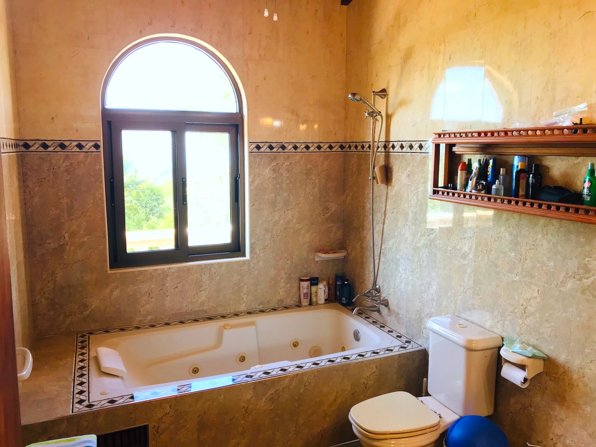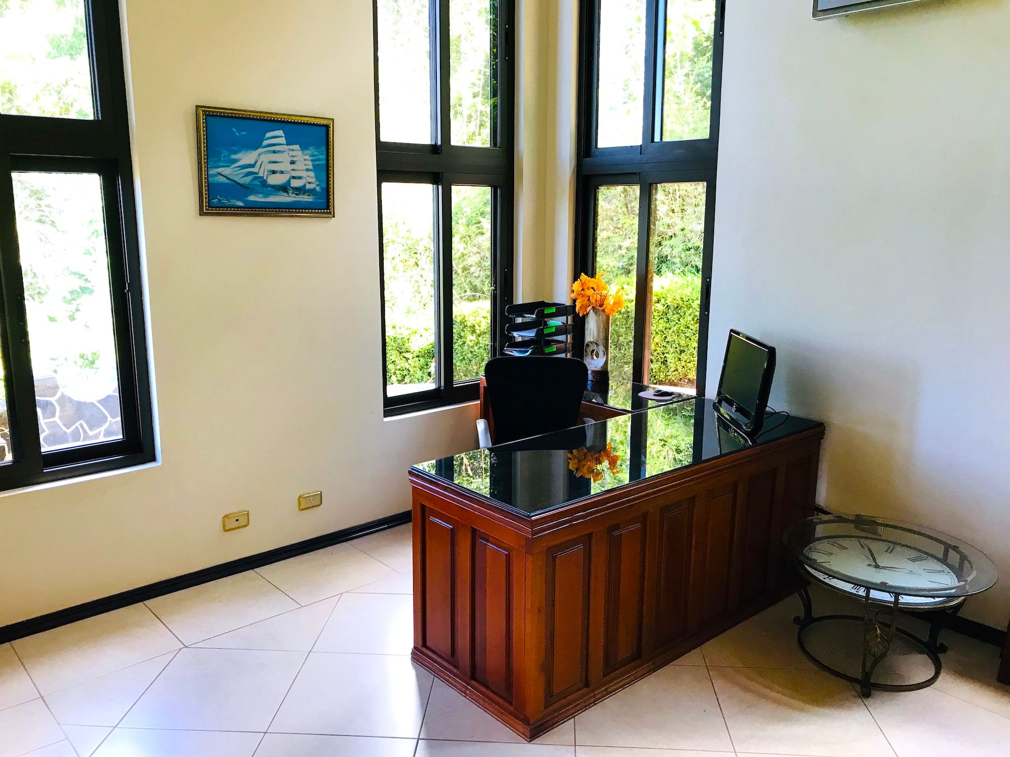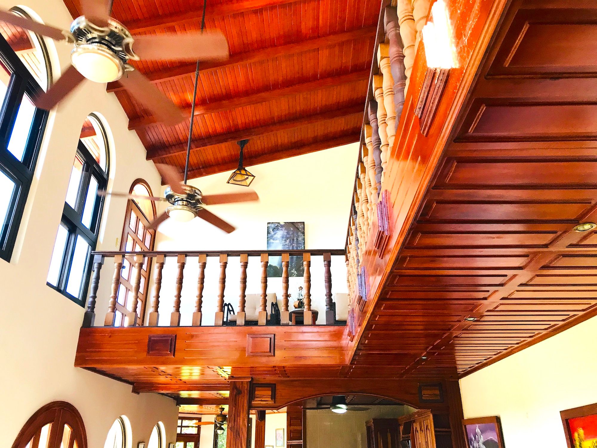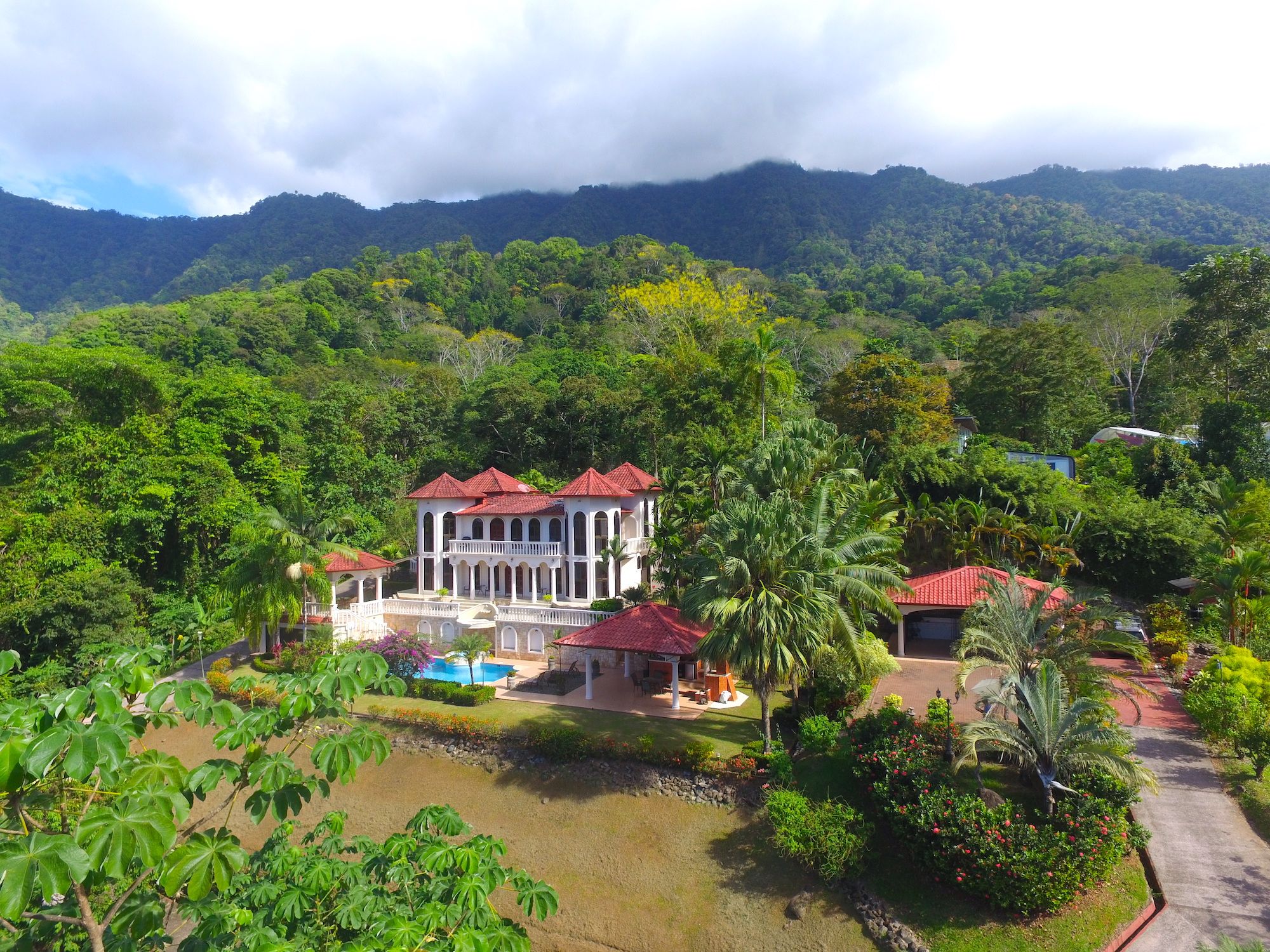Main House and Pool The main house has fine finishes such as Cristobal wood (one of the best hardwoods in Costa Rica) kitchen cabinets and paneling in the kitchen, living room, and staircase. Also, Ron-Ron wood was used as well on the banisters (another sought-after hardwood). Downstairs in the kitchen and living room. Upstairs are the 3 bedrooms, 2 full baths, and an office, plus there is an entrance accessed by a concrete driveway that loops the entire home and property. The bathrooms feature marble counters and tiles from floor to ceiling. The pool is large and could even be used to swim laps. There is also a jacuzzi tub and waterfall feature, an outdoor rancho with fireplace, sink, and dining by the pool. Plus another outdoor covered veranda by the kitchen with ocean views and overlooking the pool area.