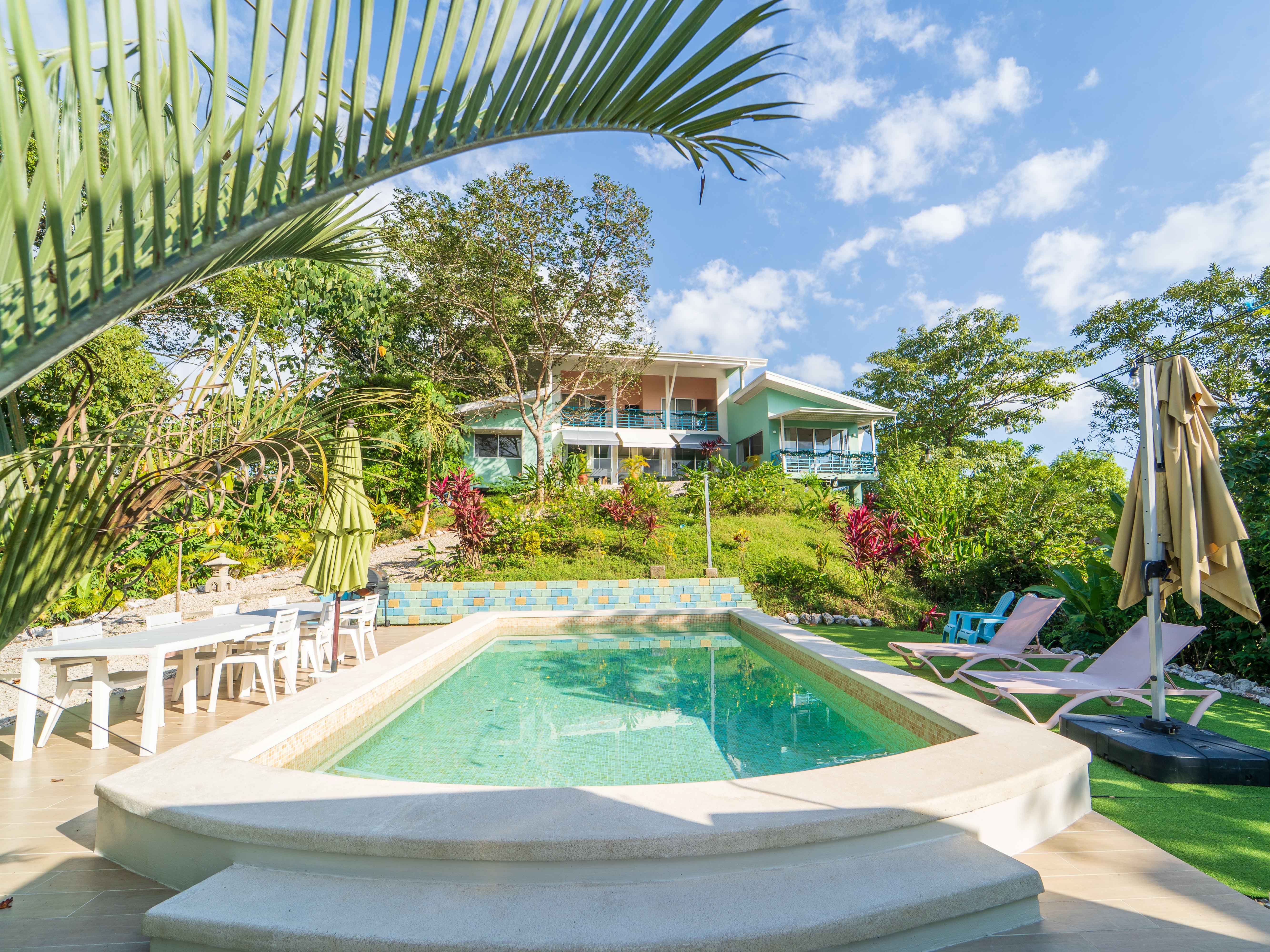 The main residence, Casa Nube, is a well-designed five-bedroom home that blends modern comfort with a relaxed tropical feel. Elevated within the property, the home enjoys sweeping mountain and jungle views and steady breezes throughout the year. The open-concept layout connects the kitchen, dining area, and living spaces, creating an easy flow for everyday living and entertaining. Large glass doors open to outdoor areas, allowing the natural surroundings to become part of the home. A resort-style saltwater pool anchors the outdoor living space, making it ideal for relaxing or hosting guests. Casa Nube is fully furnished and has a strong track record as a successful vacation rental, offering immediate income potential.