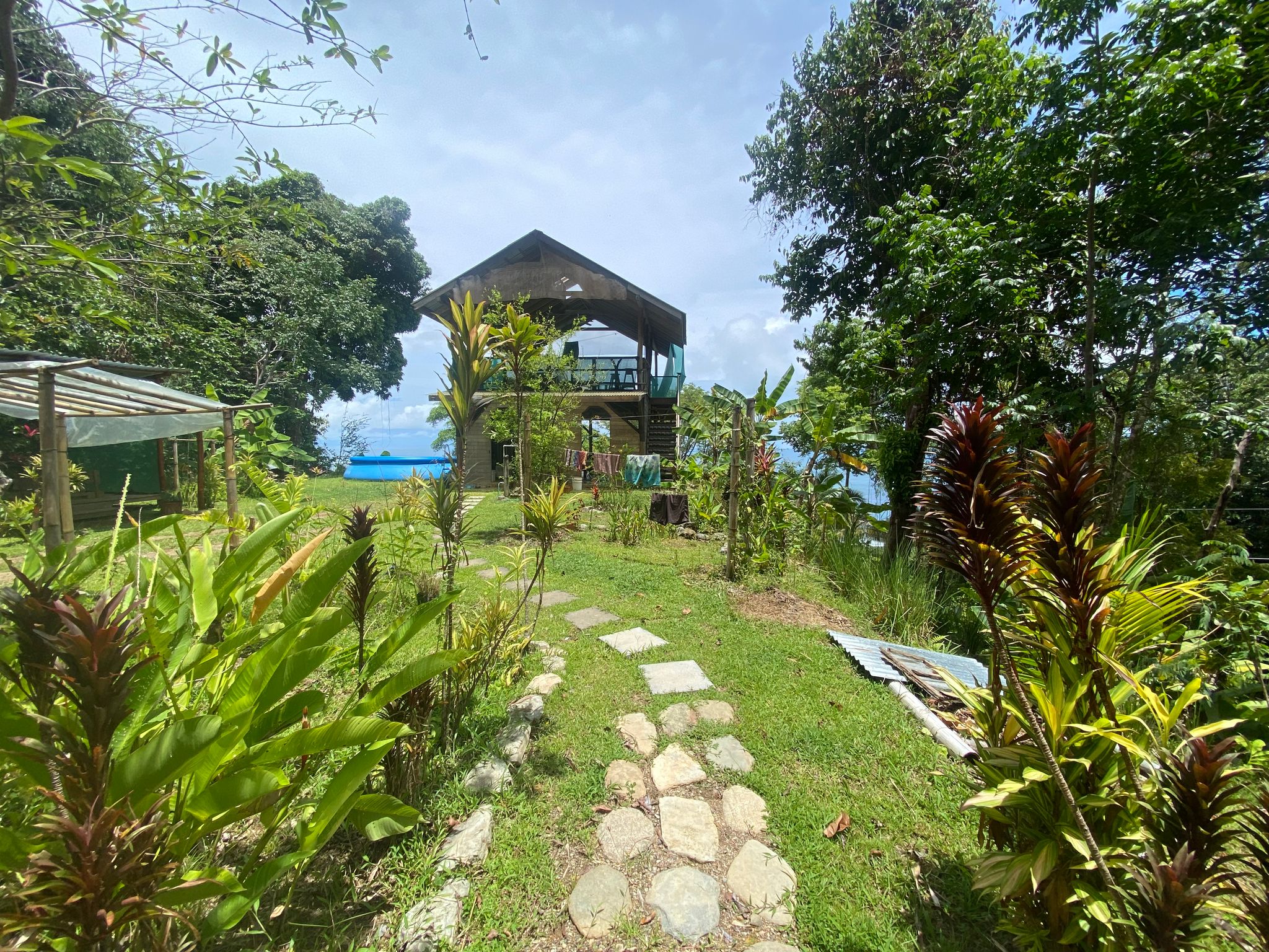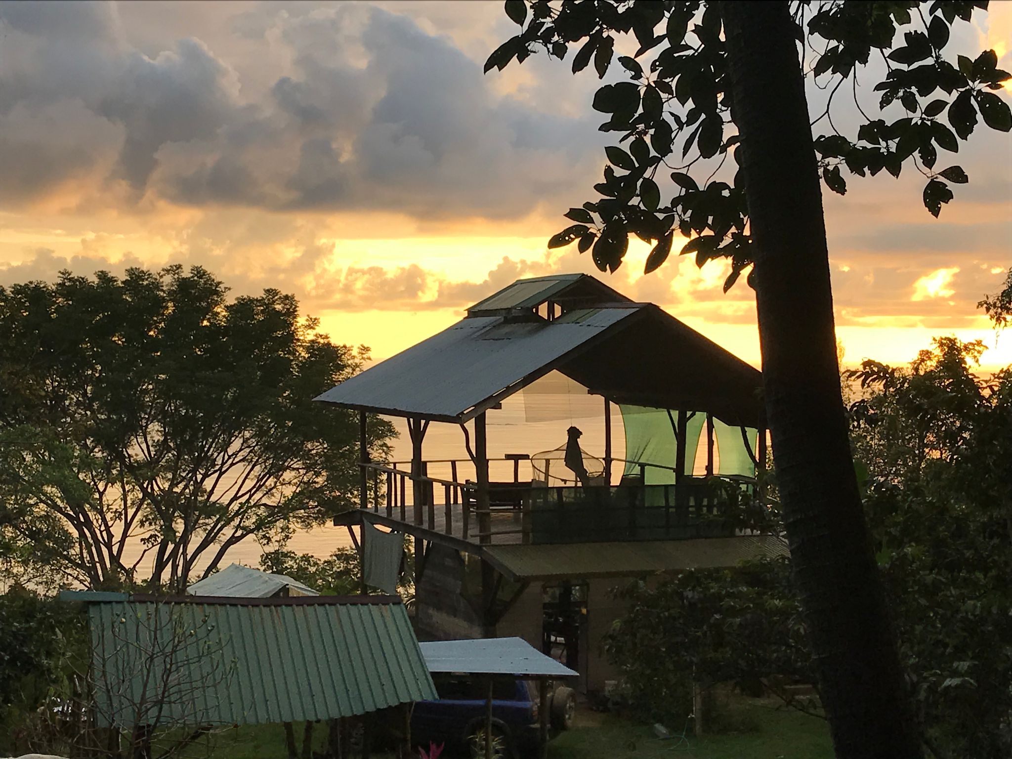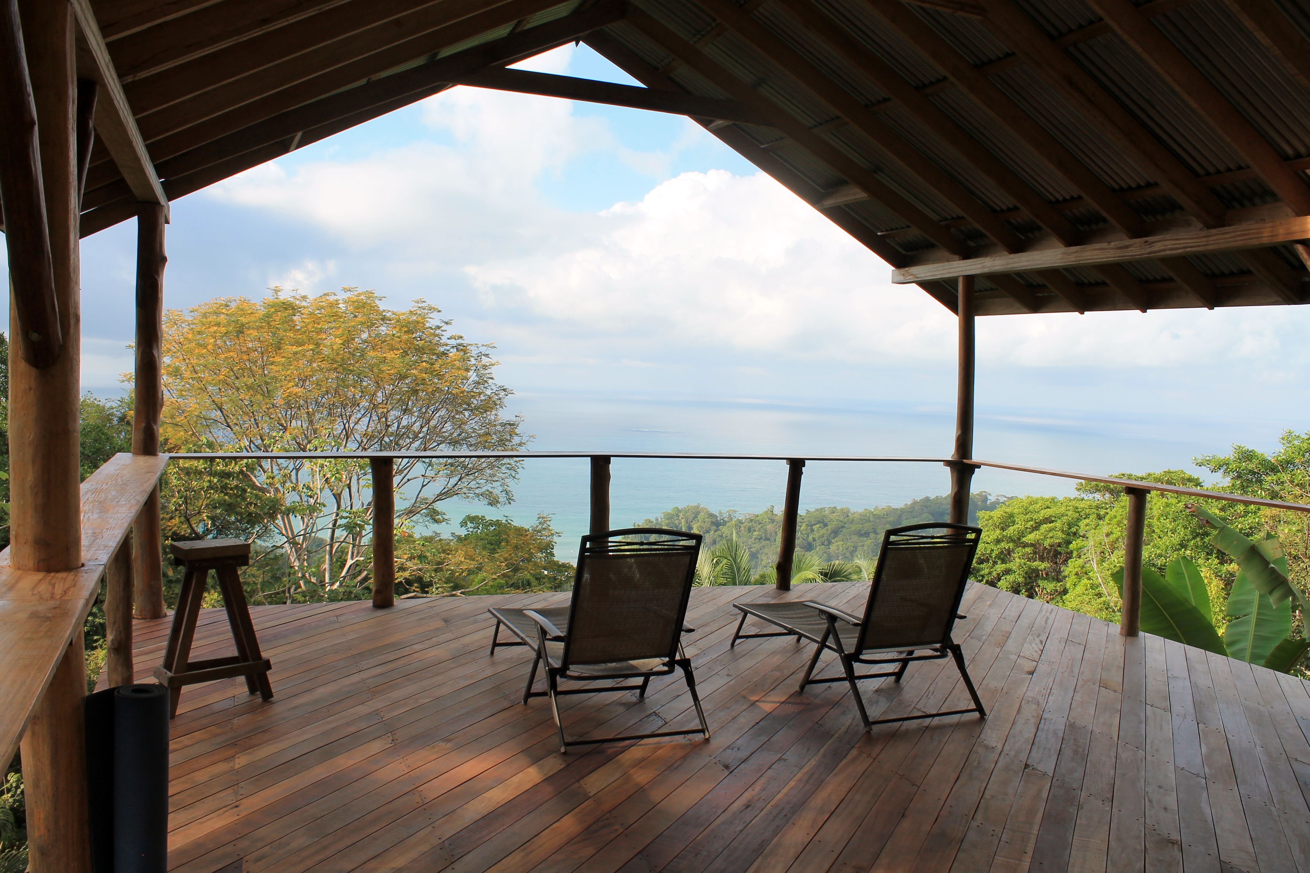The property is private and has an amazing jungle feel to it. You are surrounded by dense rainforest and behind the main building site is one of the biggest trees you will ever see. There is the main building site and then another area up by the big tree where you could build a second home. The property currently has a small caretaker’s house, and an open-air house plus a few glamping platforms. It is also an organic farm. Most of the existing structures are located on the main building site. If you want to live a simple open-air lifestyle with one of the best views in the country, then you are all set. Otherwise, you could stay in the existing open-air house until you are ready to build your dream house at which point you could easily take down what is currently there.