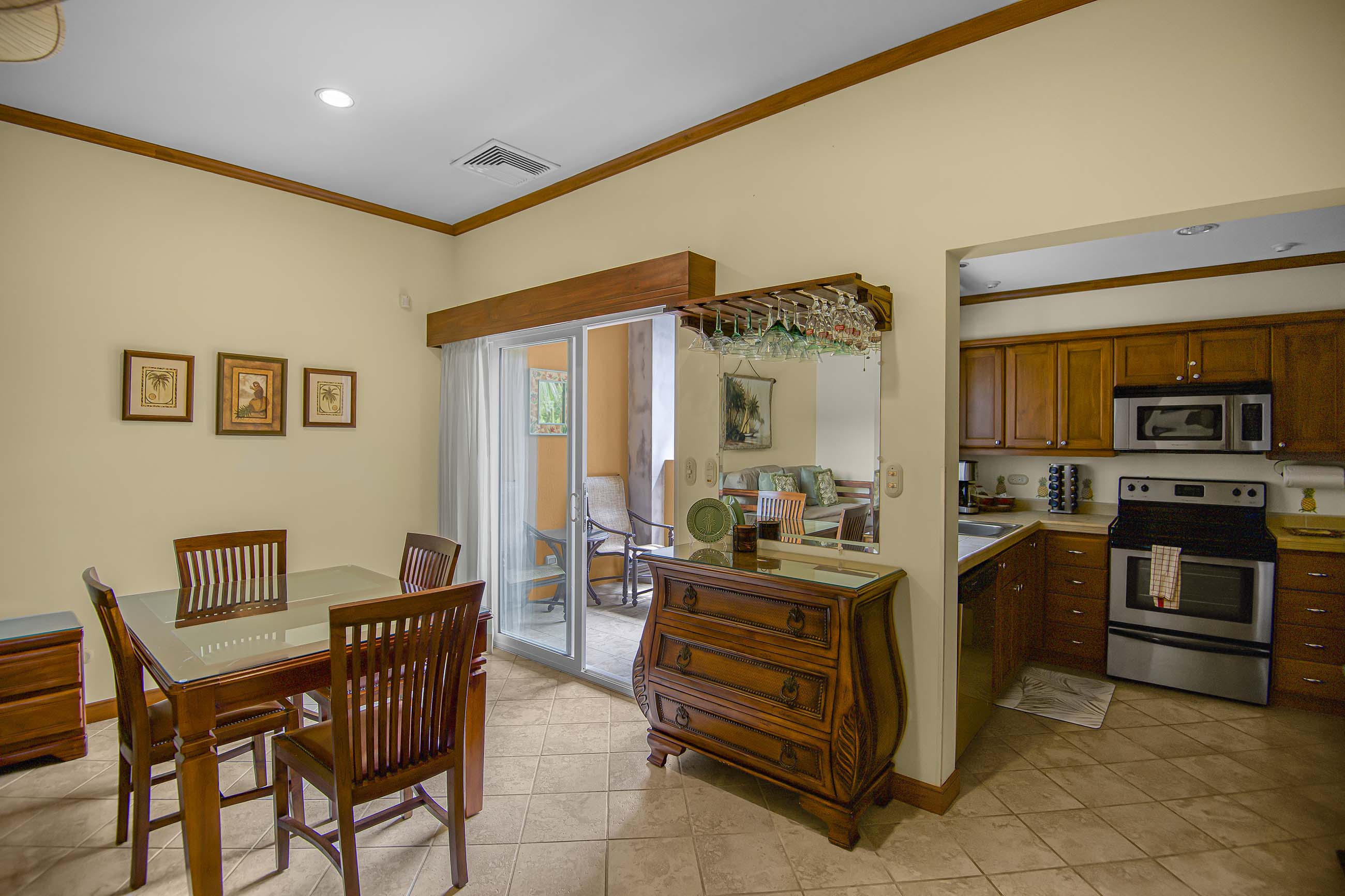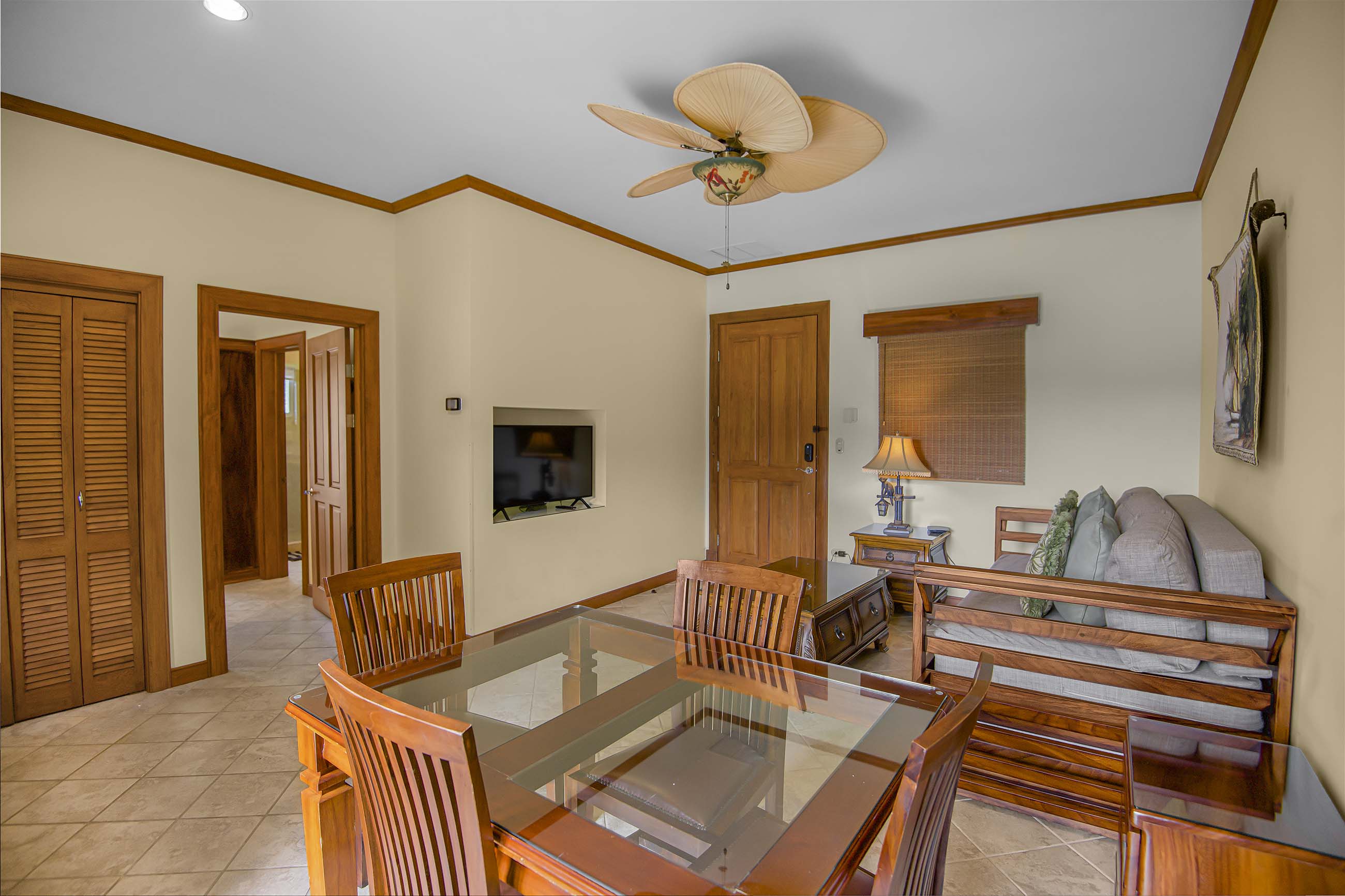 The condo features a spacious open-concept living and dining area, a fully equipped kitchen with quality finishes, and a large private terrace ideal for relaxing or entertaining while enjoying garden or resort views. The generously sized bedroom includes ample closet space and an en-suite bathroom, creating a peaceful retreat after a day in paradise.