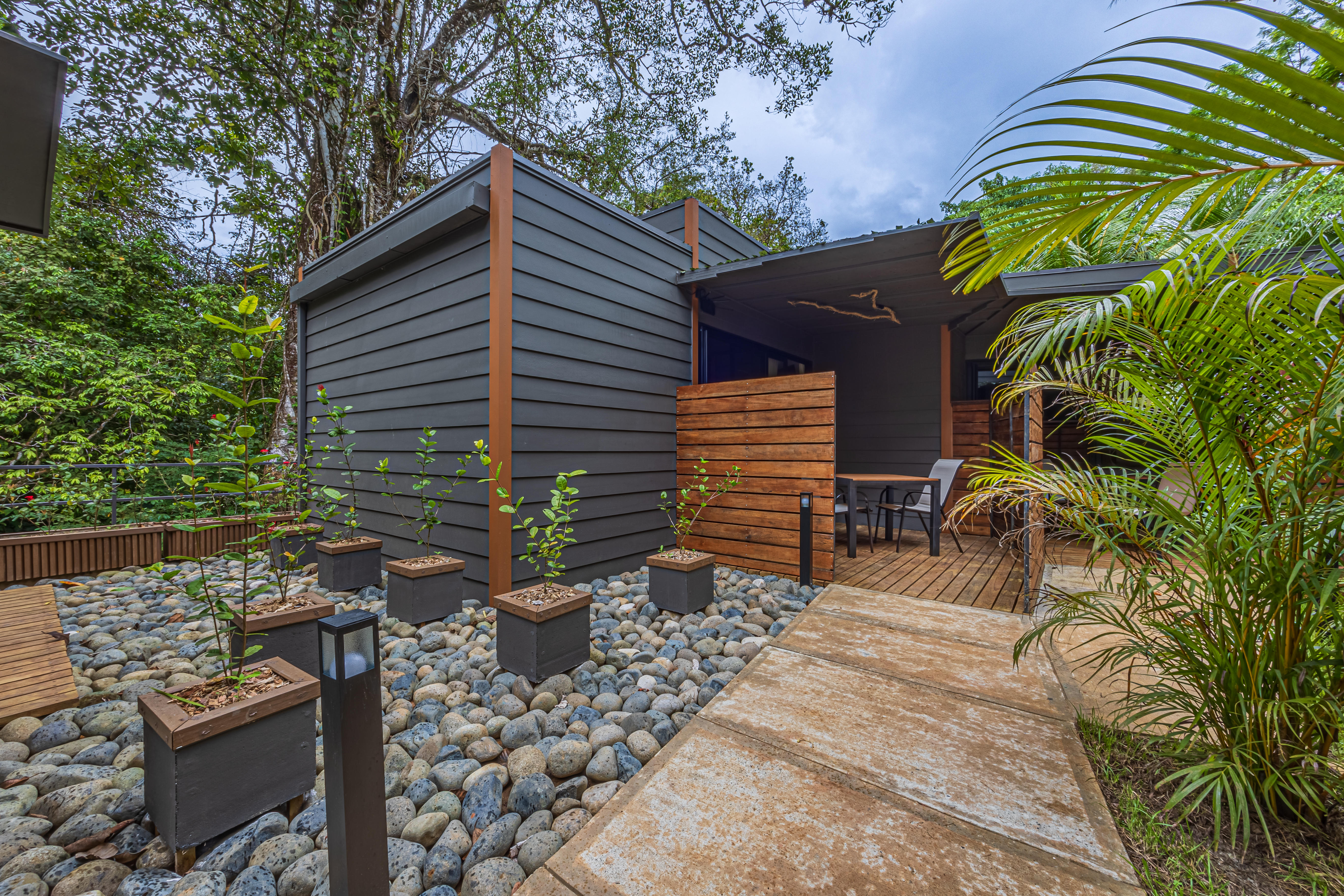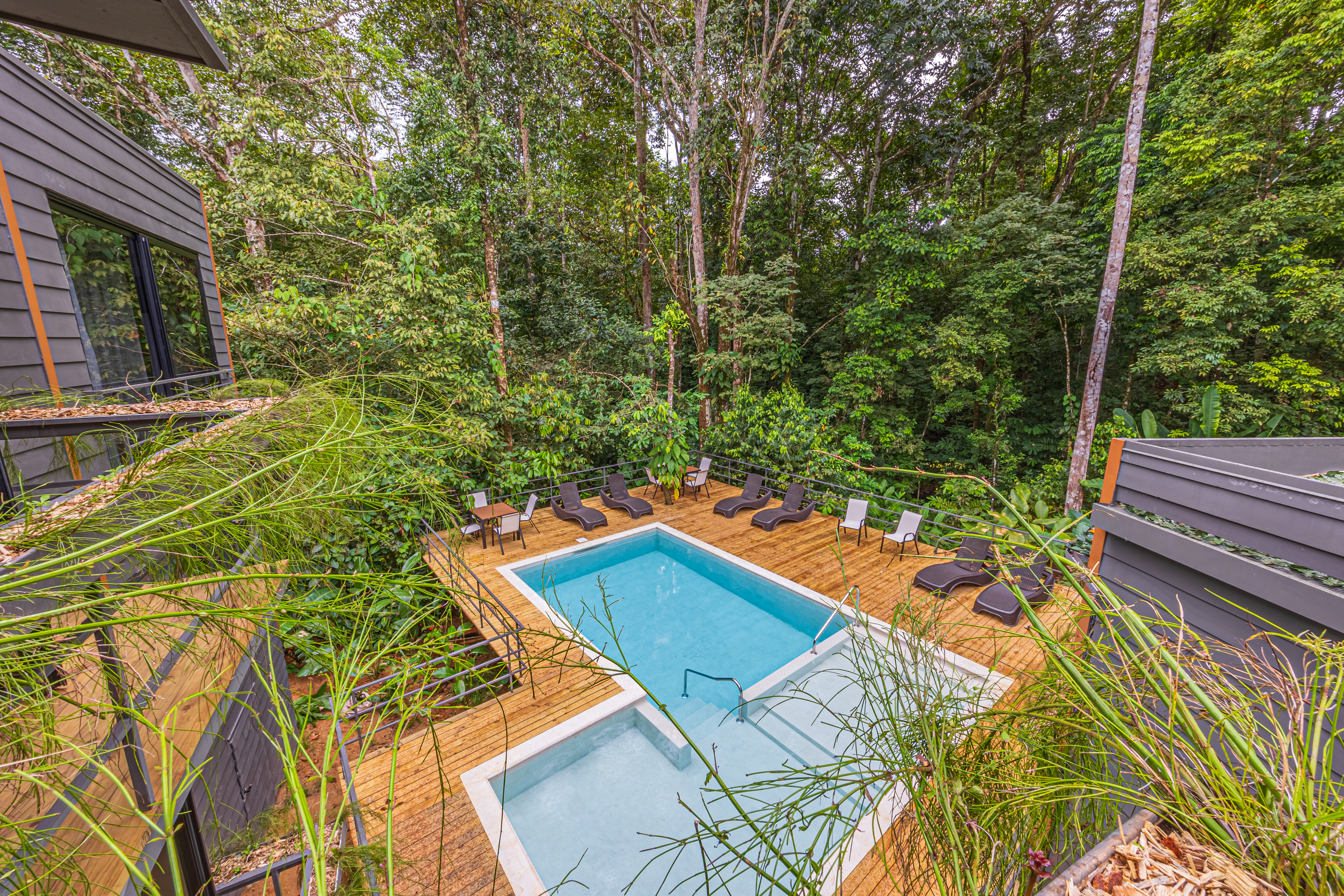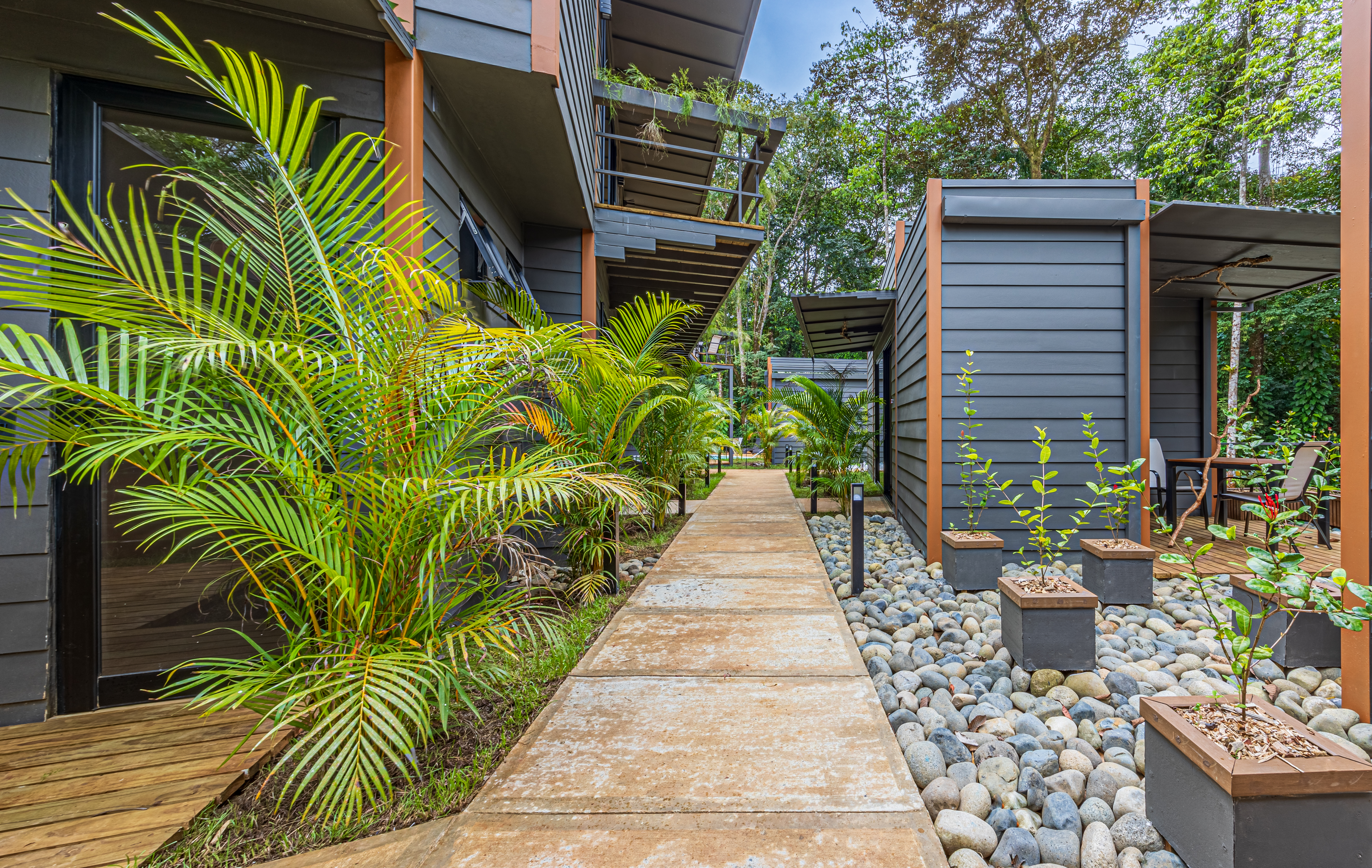 Tucked against a lush jungle backdrop and bordered by a peaceful river, the setting is rich with wildlife and natural ambiance. Meandering, beautifully landscaped paths connect the rooms to a shared pool, creating a serene, resort-like atmosphere.