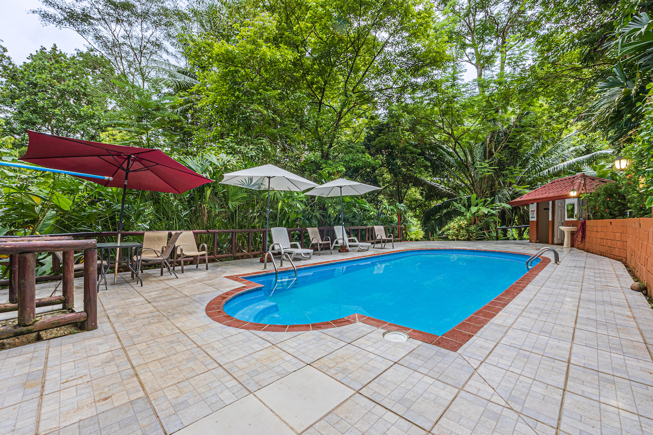Amenities: The large, low-maintenance fiberglass pool is a standout feature, with an expansive deck area furnished with loungers and shade umbrellas, set amid tropical plants. Monkeys often swing by overhead, adding to the exotic experience. The shared guest area includes an outdoor-accessible bathroom and ample space for potential outdoor kitchen and BBQ installations.