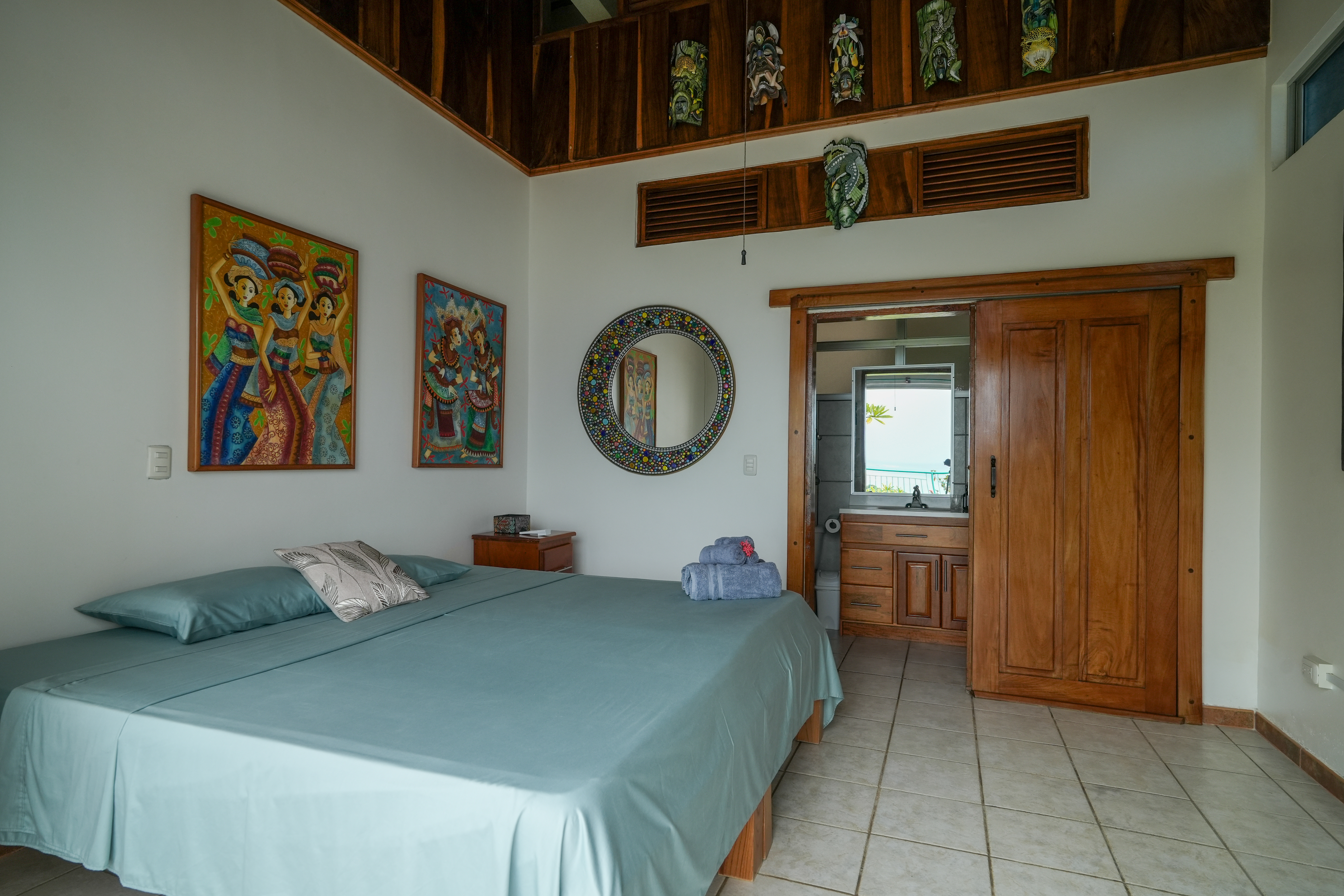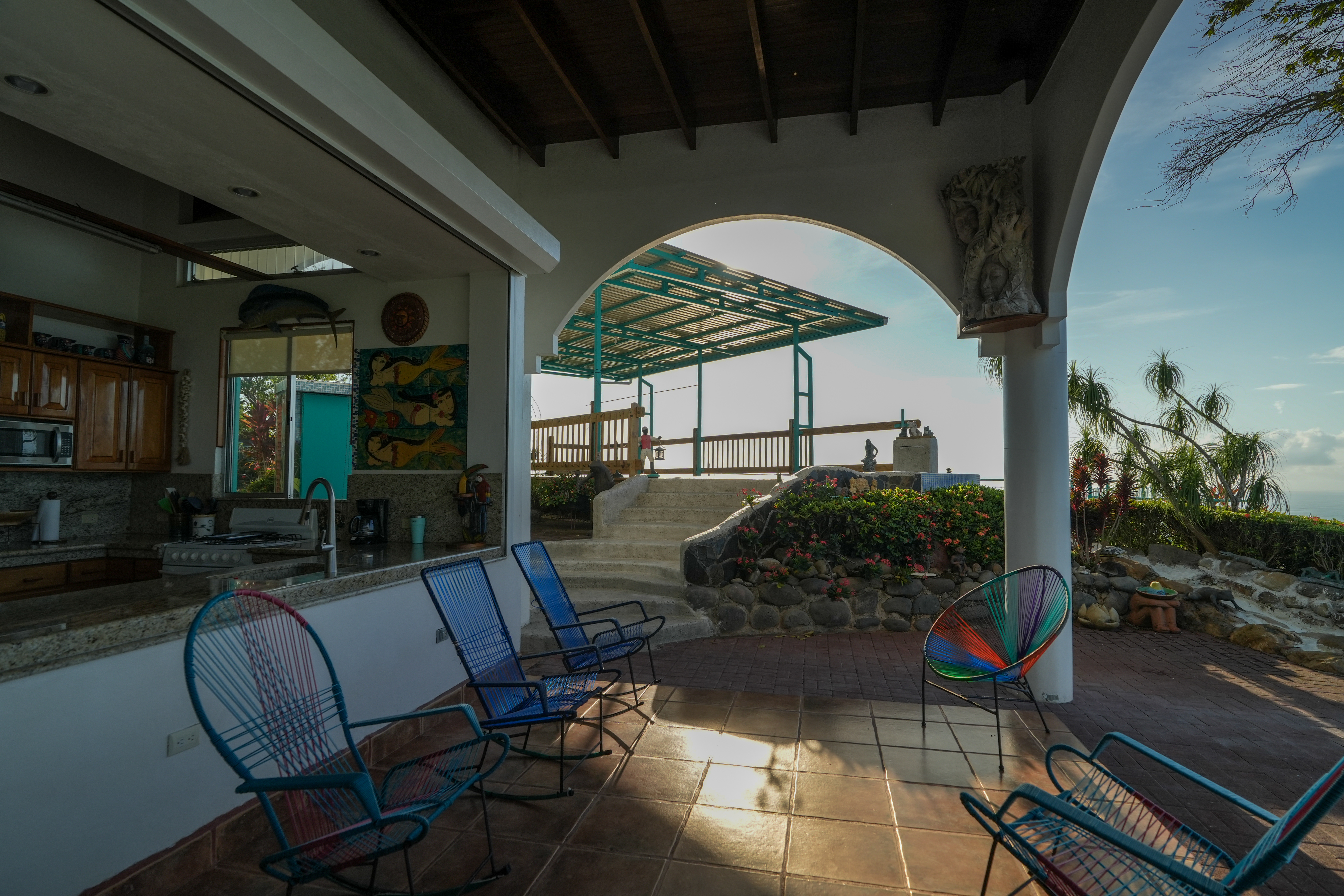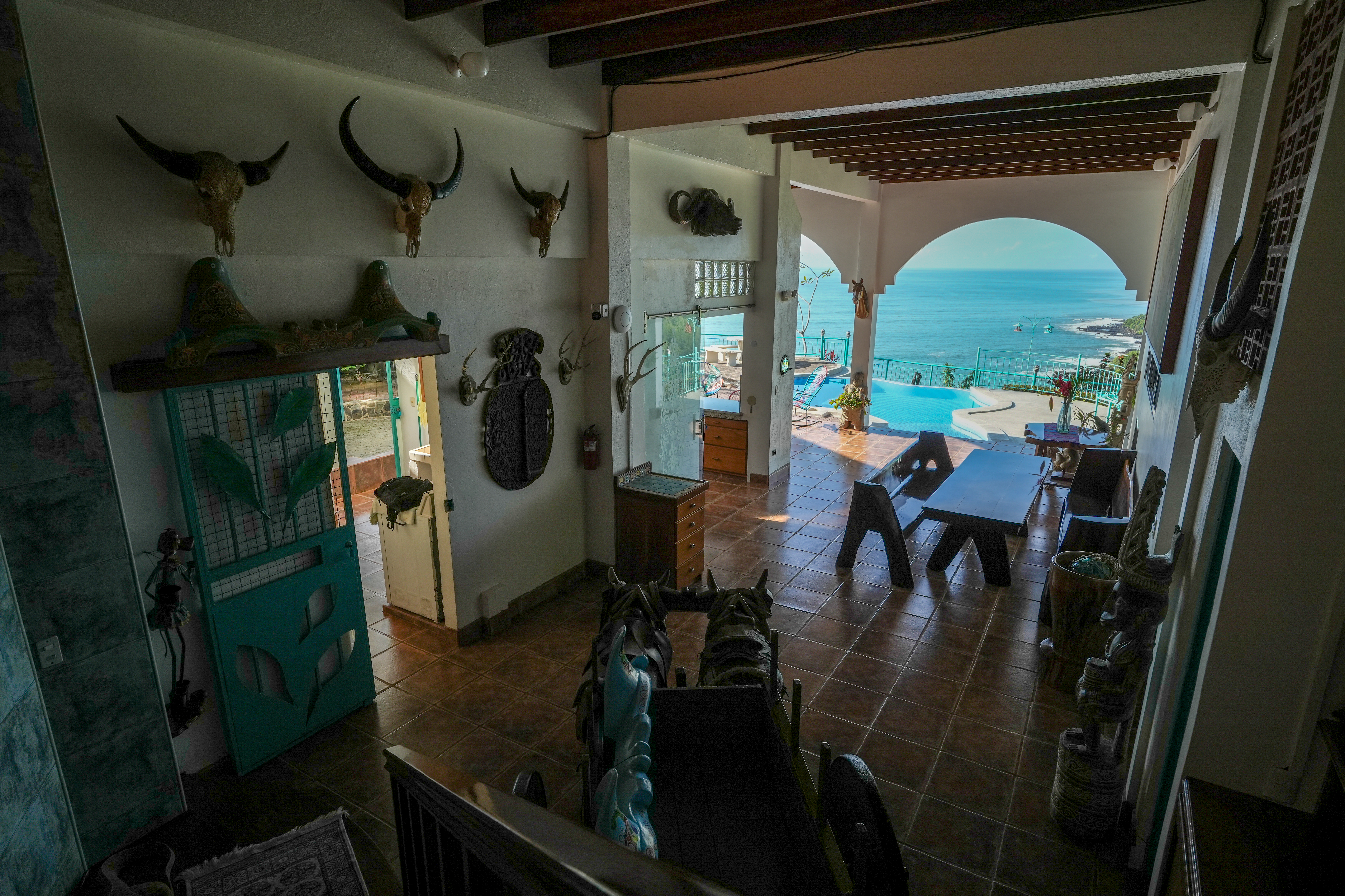 Main House: Expansive open-air living area, gourmet kitchen, breathtaking Pacific views, Bali-inspired décor, and antique Costa Rican accents.