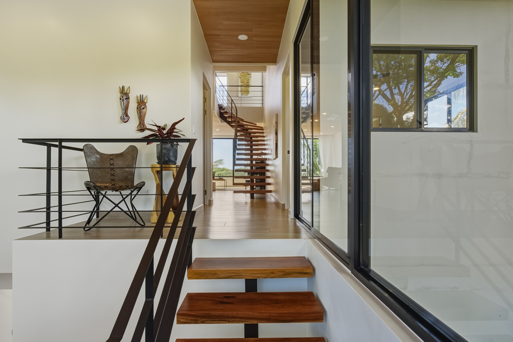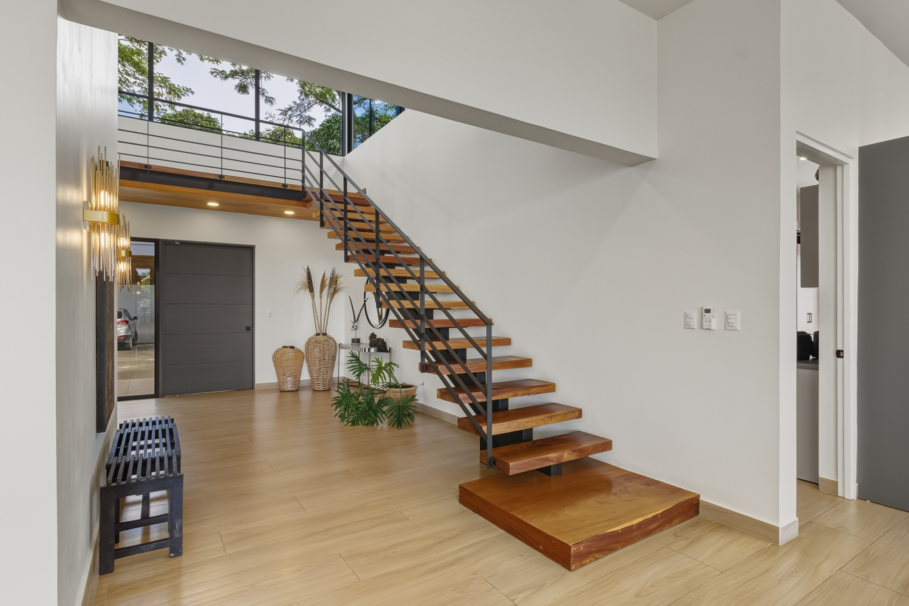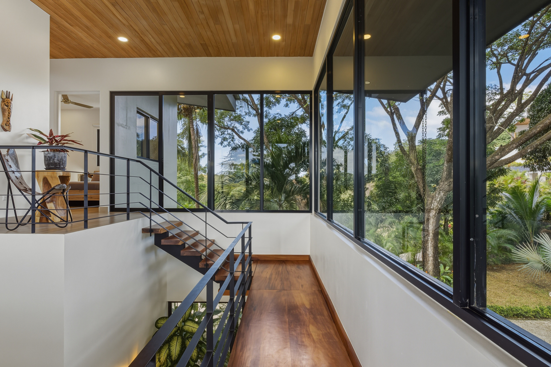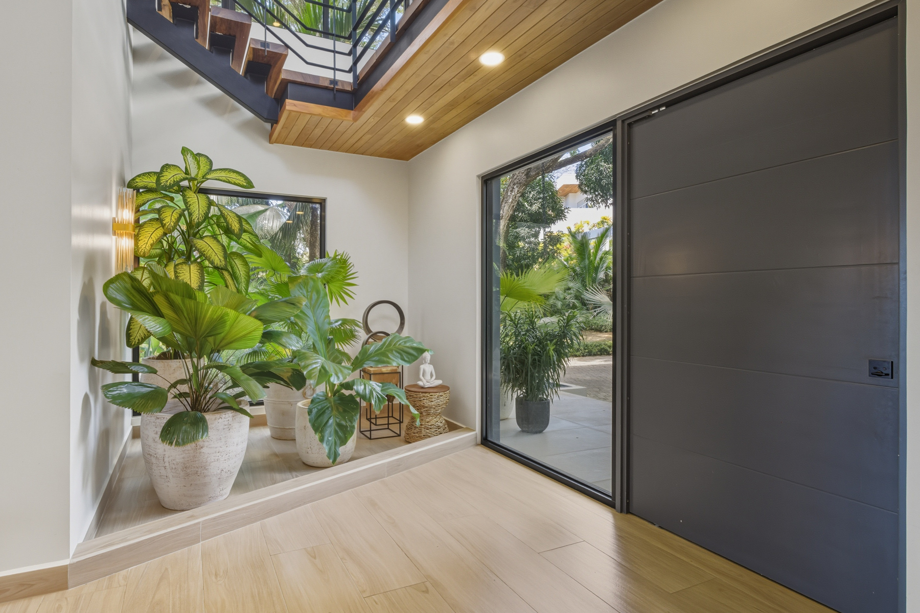 Dramatic entry with interior tropical plants and a custom Guanacaste staircase and bridge