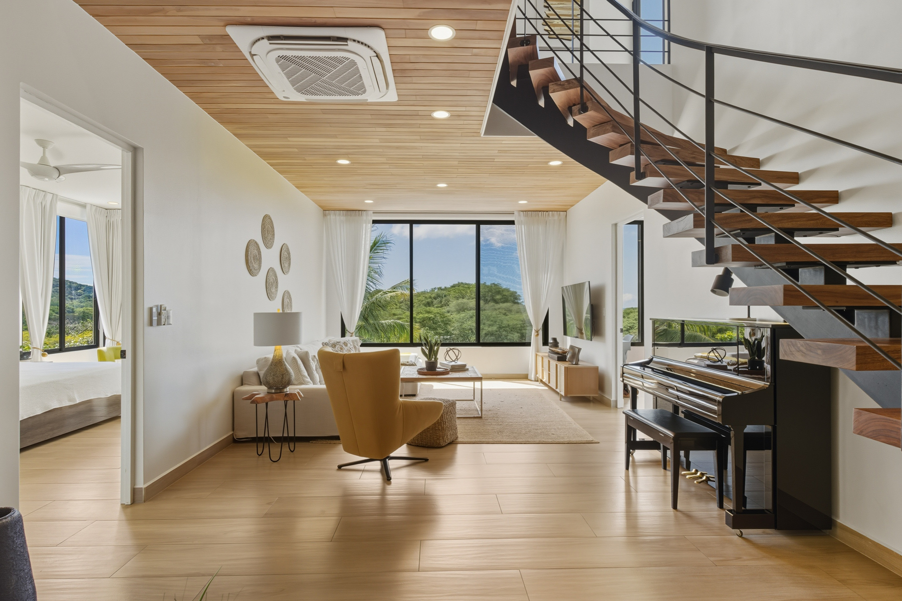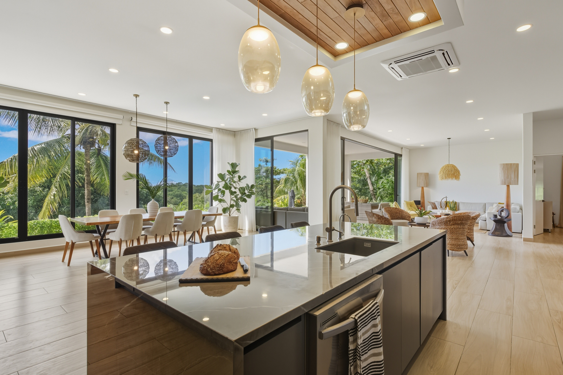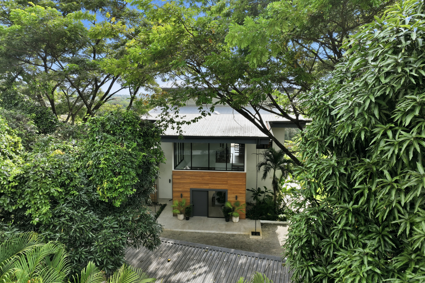 The main home showcases modern contemporary architecture infused with warm, natural materials. Extensive use of local Guanacaste wood, soaring ceilings, and curated designer furnishings create a refined yet inviting atmosphere. Sunset views are enjoyed from every level.