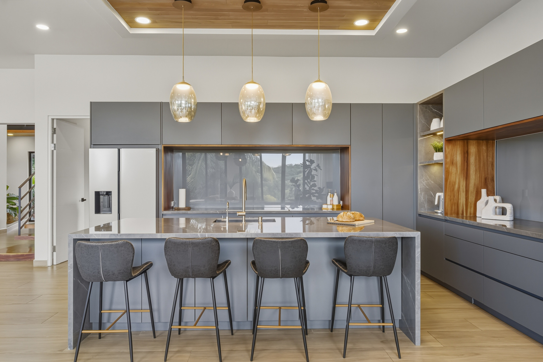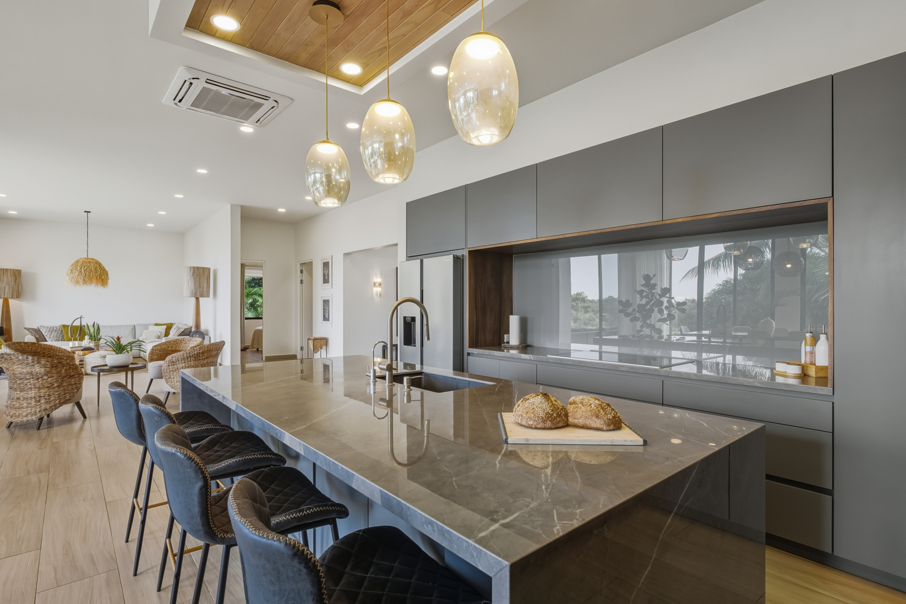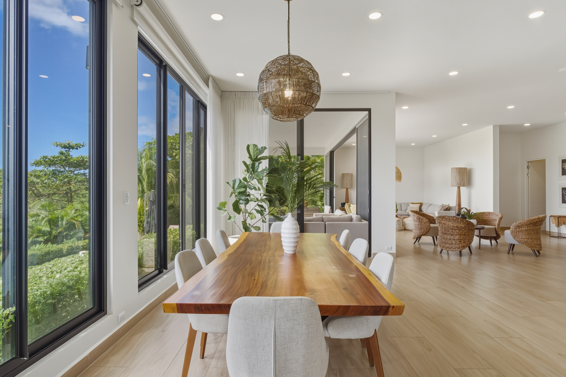 The main home showcases modern contemporary architecture infused with warm, natural materials. Extensive use of local Guanacaste wood, soaring ceilings, and curated designer furnishings create a refined yet inviting atmosphere. Sunset views are enjoyed from every level.