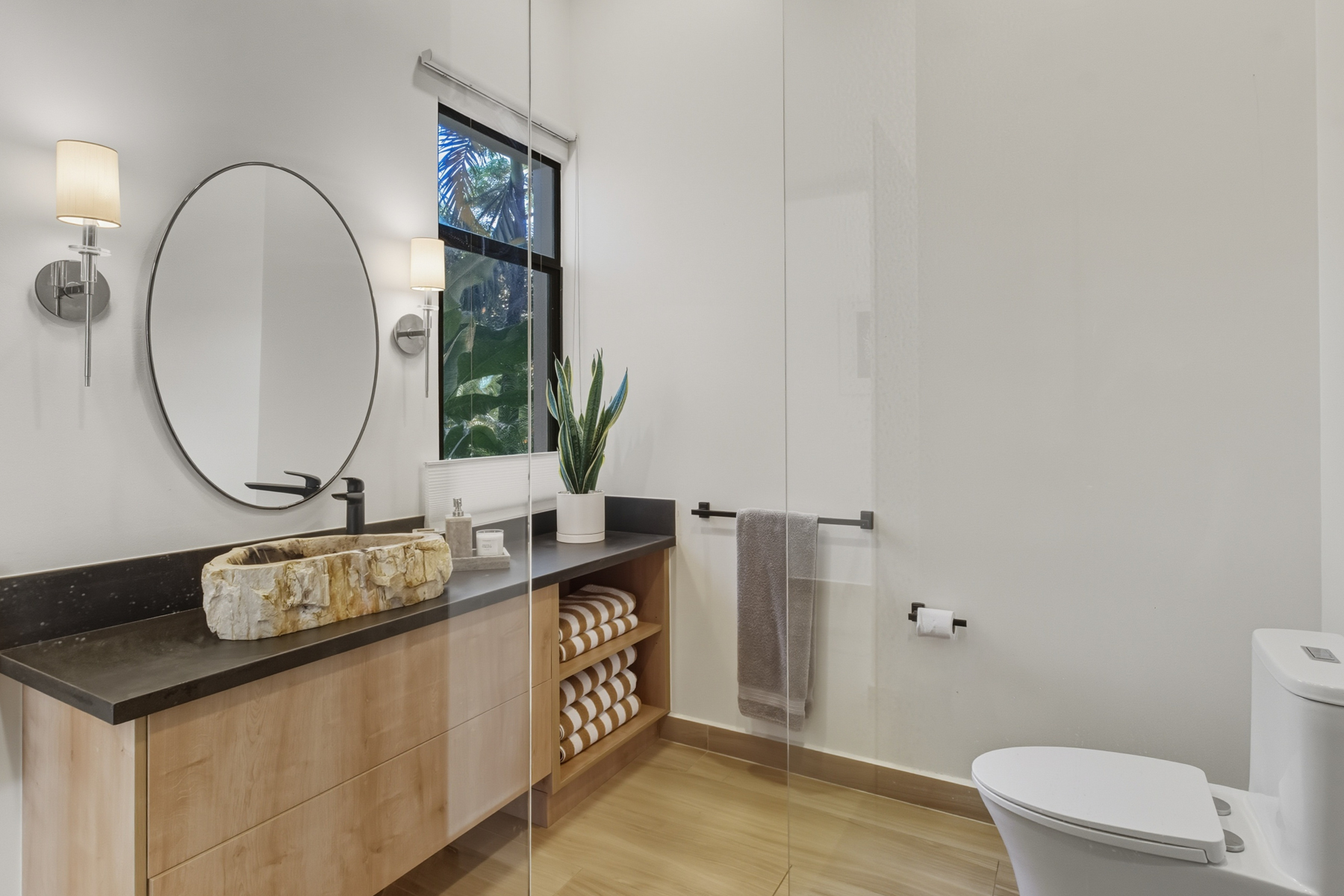 Adjacent luxury bathroom with freestanding stone sink, rain shower, and garden view