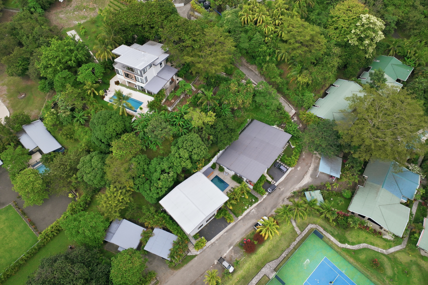 Located inside the exclusive 506 Tennis Center, one of Nosara’s safest and most private gated communities, Tres Palmas Estates is a rare luxury compound offering privacy, scale, and income potential just minutes from town and world-renowned surf. Tucked toward the back of the community, the estate enjoys a tranquil jungle setting, with the main residence perched atop a hill overlooking lush greenery, sunsets, ocean glimpses, and surrounding mountains. Additional villas are thoughtfully positioned near the tennis courts, creating a natural separation between owner living and guest accommodations.