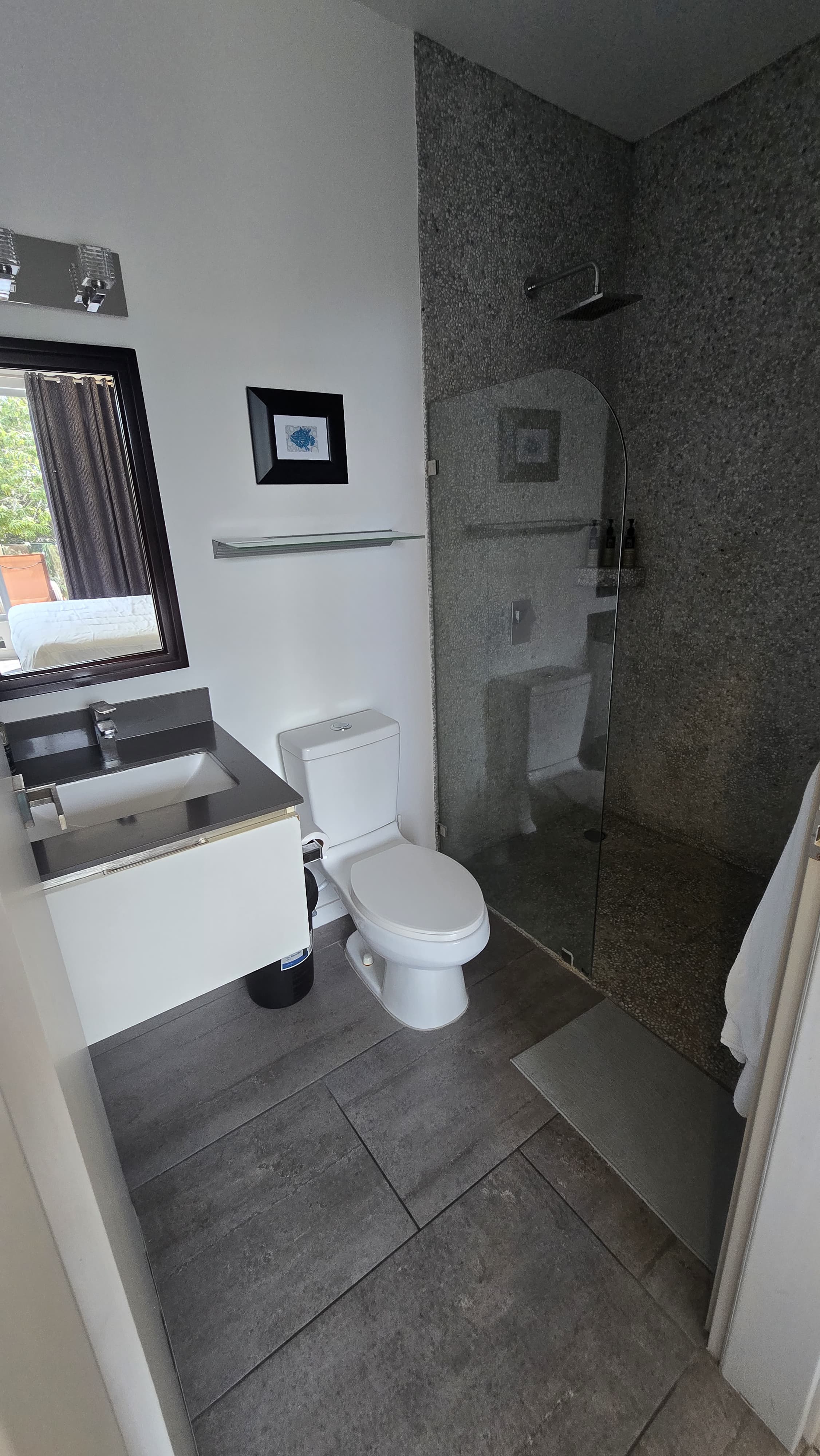 Property Features: • Spacious bedroom with floor-to-ceiling windows offering stunning natural light and views. • Private balcony overlooking lush greenery and the pristine beach – ideal for relaxing or entertaining. • Fully equipped kitchen with modern finishes, perfect for culinary enthusiasts. • Open living area designed for comfort and functionality.