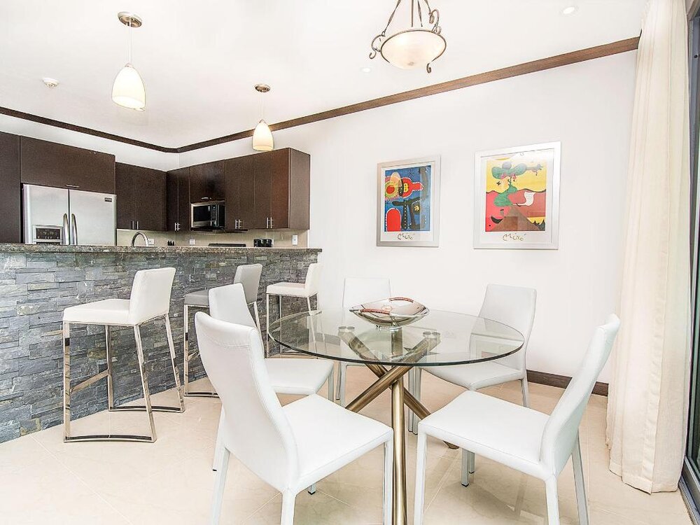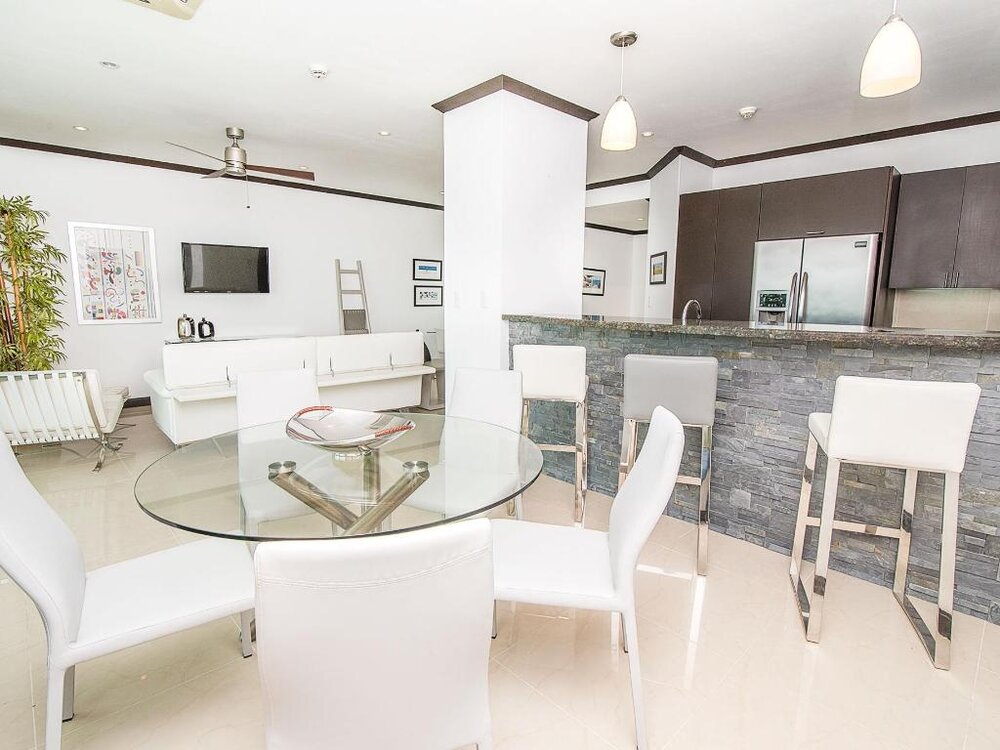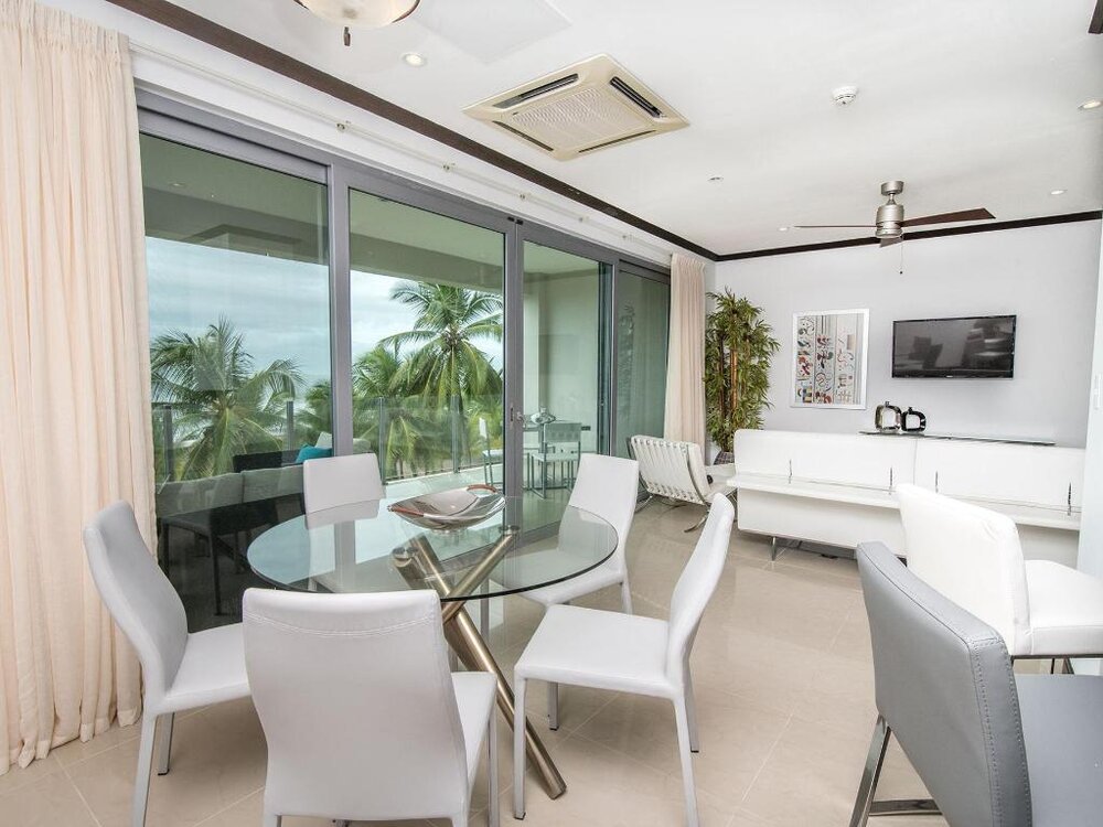 Features • Spacious living room with comfortable sofas, large flat screen TV and dining table.