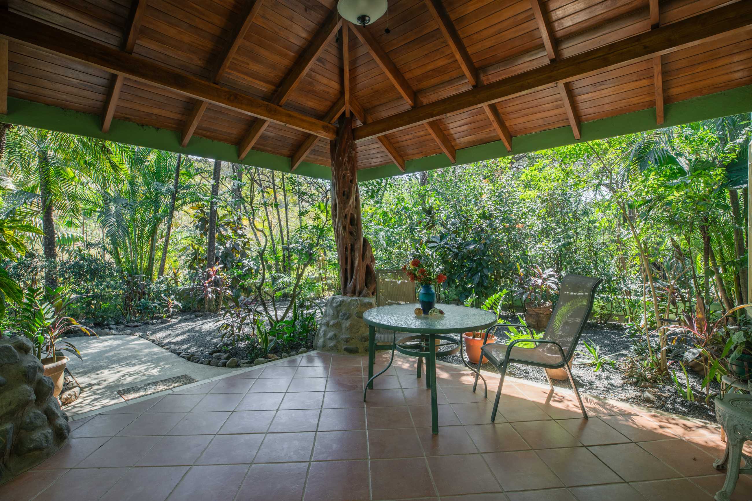 Step outside to a private garden terrace, where tropical landscaping surrounds the space and offers a peaceful outdoor retreat—ideal for slow mornings, casual dining, or relaxing after a day at the beach.