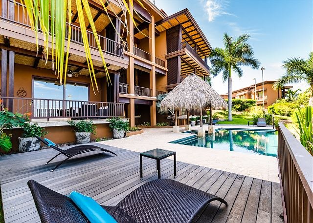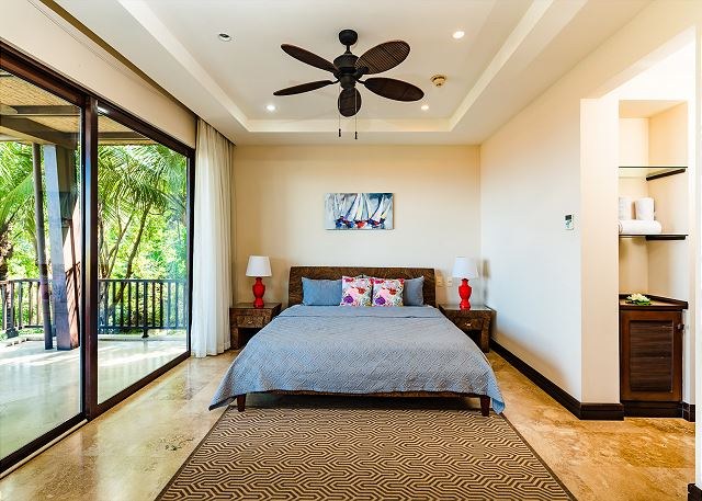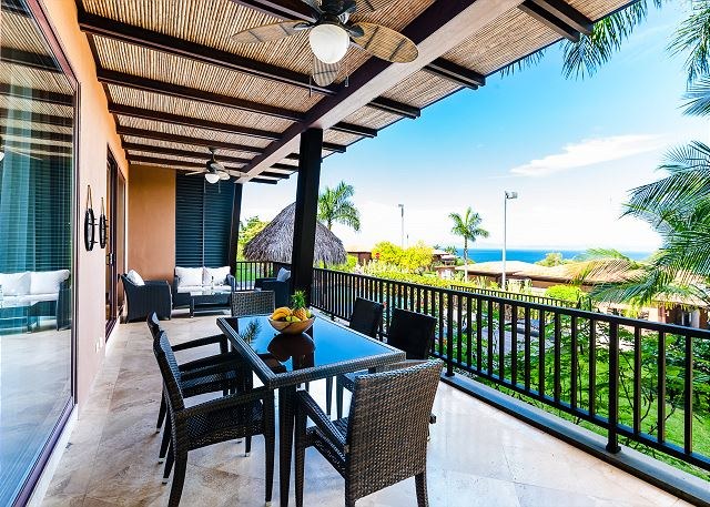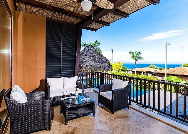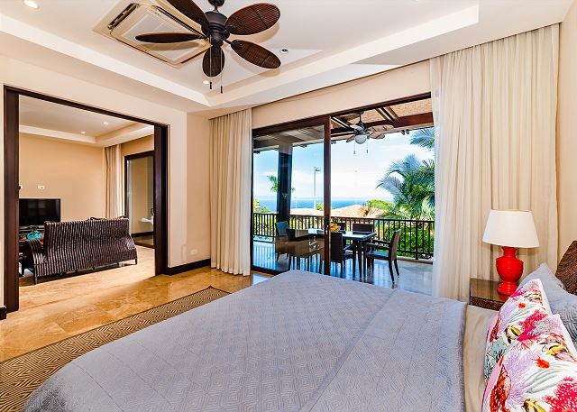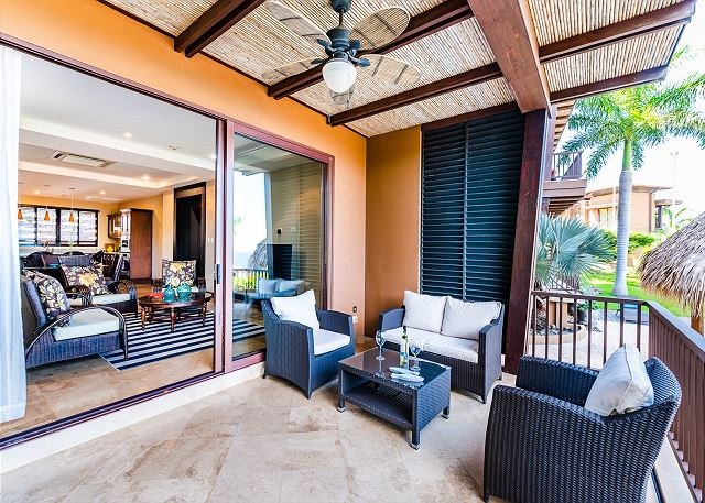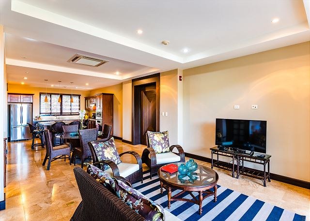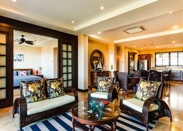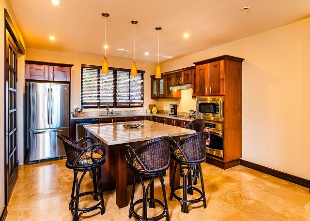 The condo has a top-of-the line chef’s kitchen, which features stainless steel GE Profile appliances and comes fully stocked with all the cooking utensils you need to dine with the sunsets. The kitchen also has eat-in breakfast island and opens beautifully into the living area, which opens—via large sliding glass doors—to a huge terrace with dramatic views of the ocean.