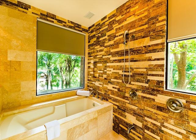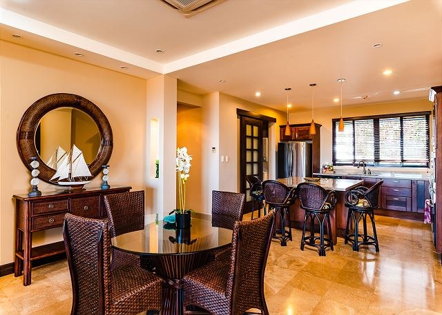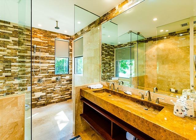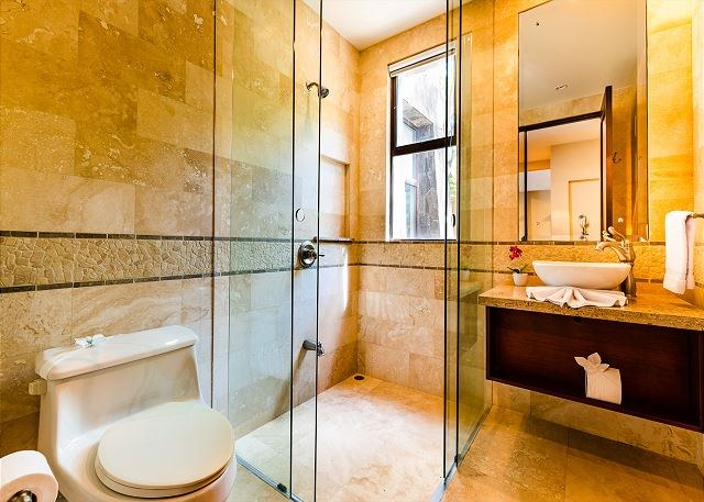 Dine inside at the 4-person dining table or out on the terrace, which comes complete with a six-person dining table and lounge area. Throughout the home are natural stone floors, accents, and shower walls.