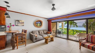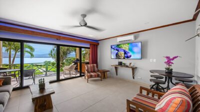 Enjoy morning coffee or evening sunsets from your private veranda while soaking in panoramic views of the Pacific. Inside, you’ll find an open-concept layout with a fully equipped kitchen, inviting dining area, and a bright living room that flows seamlessly onto the oceanview terrace.